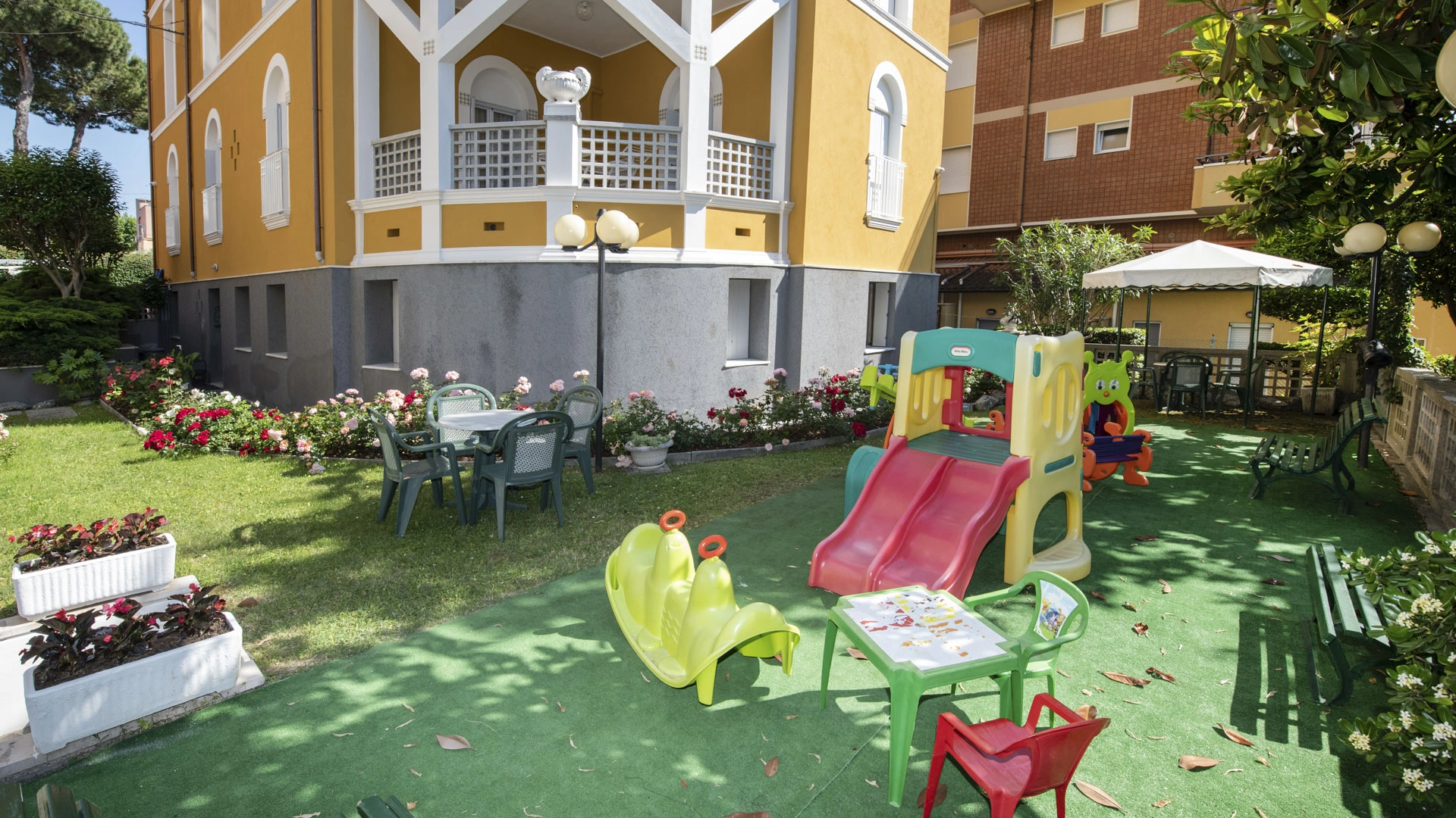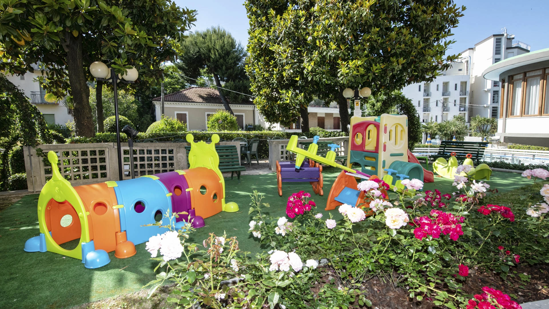 A l'hôtel: pataugeoire, aire de jeux extérieure, siège vélo, poussettes, chauffe biberon, pédiatre sur demande.
