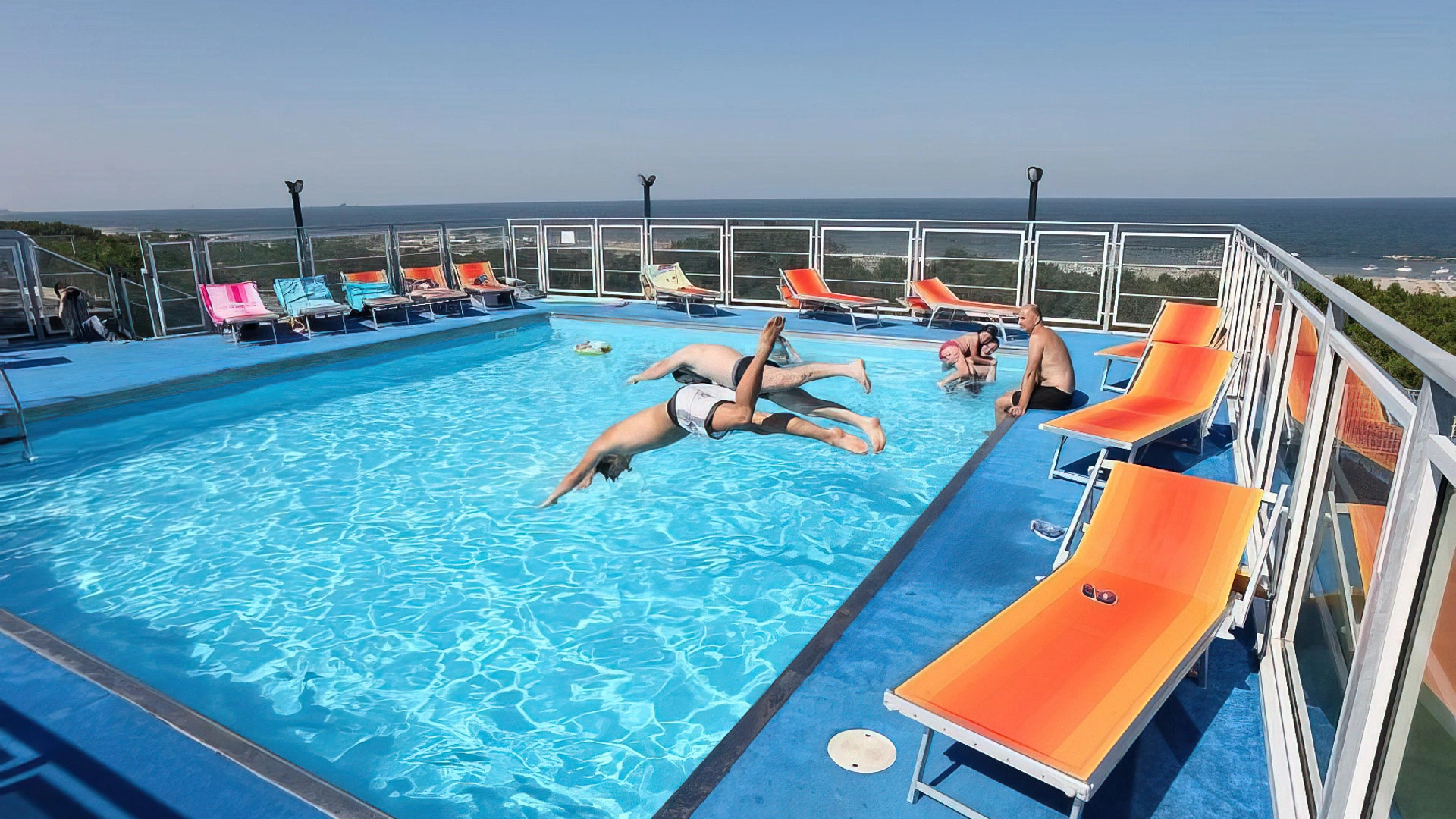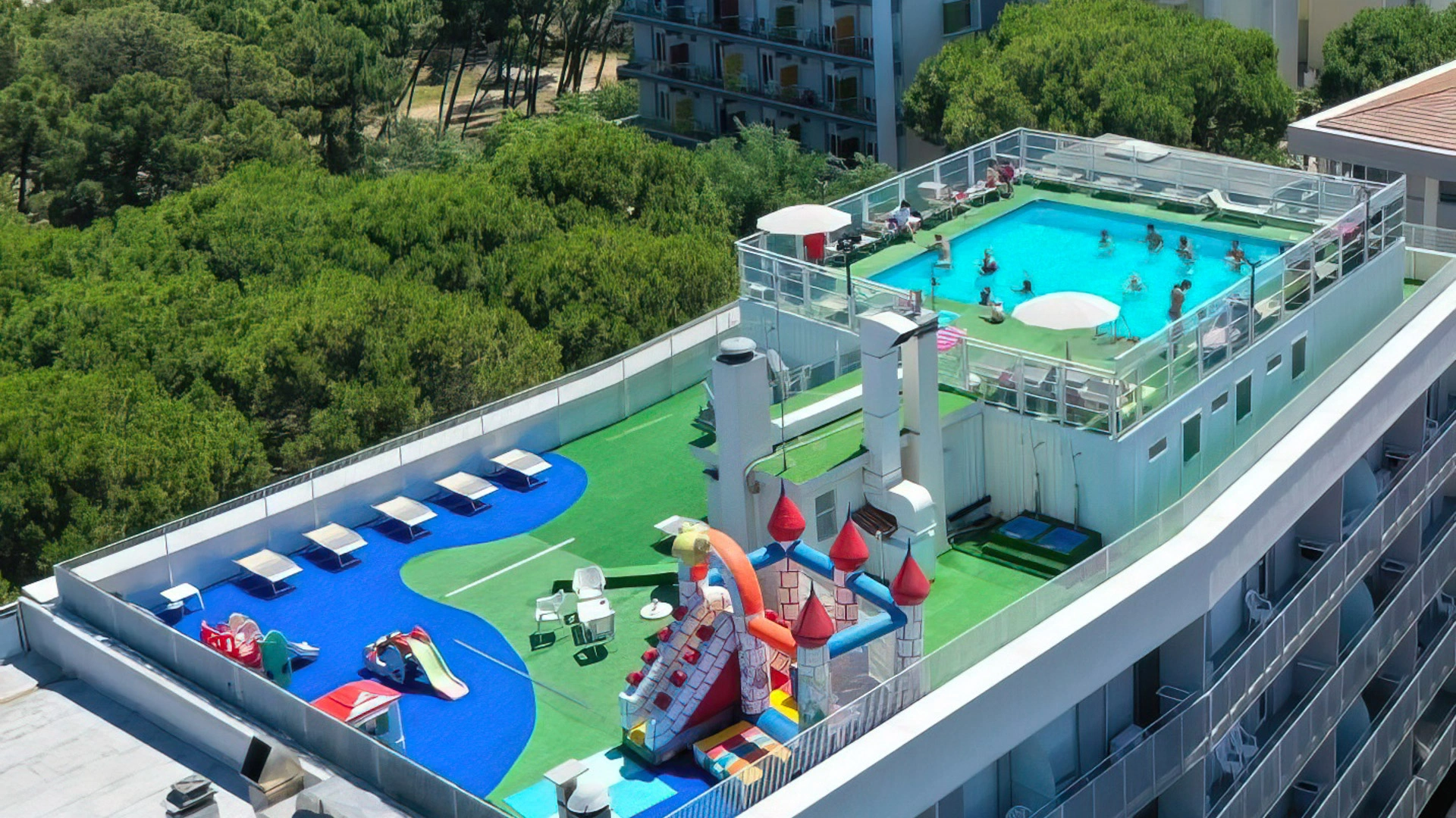 Piscine panoramique avec hydromassage située sur le toit de l'Hôtel Sorriso (en face de l'Hôtel Krone), entourée d'un solarium avec chaises longues et aire de jeux pour enfants, cours d'aquagym l'après-midi pour adultes et cours de natation pour enfants. Un maître-nageur est présent dans la piscine.