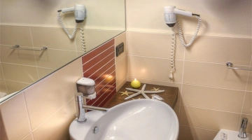 PRINCESSE: balcon avec vue sur la pinède, mobilier coloré, mini-bar, TV LCD avec prise USB et lecteur, salle de bain avec douche hydromassante et miroir grossissant éclairé, journal quotidien au choix.