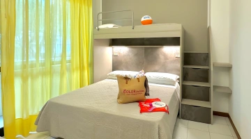 CHAMBRE TRIPLE COULEUR : Chambre couleur de 14-16m2 avec 1 lit double + 1 lit superposé simple, pour 3 personnes (maximum 2 adultes).
