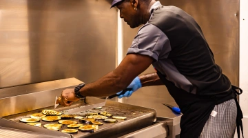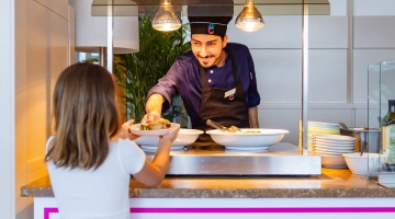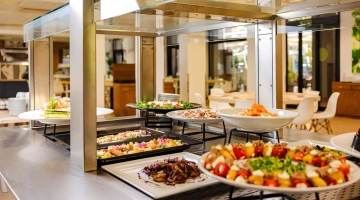 DÉJEUNER ET DÎNER : Buffet avec cuisine spectacle, cuisine italienne, pizzeria dans la salle à manger, options végétariennes, coin grill avec viande et poisson fraîchement cuits.