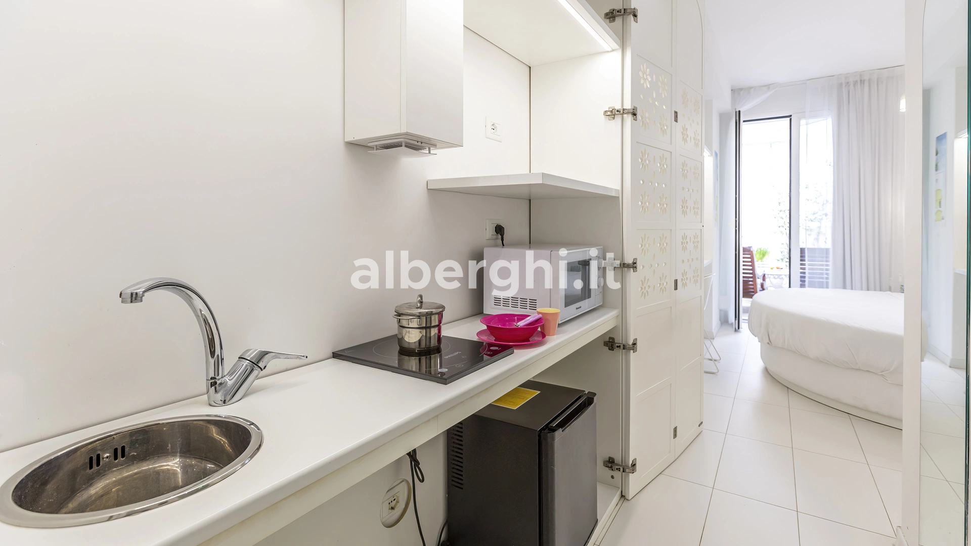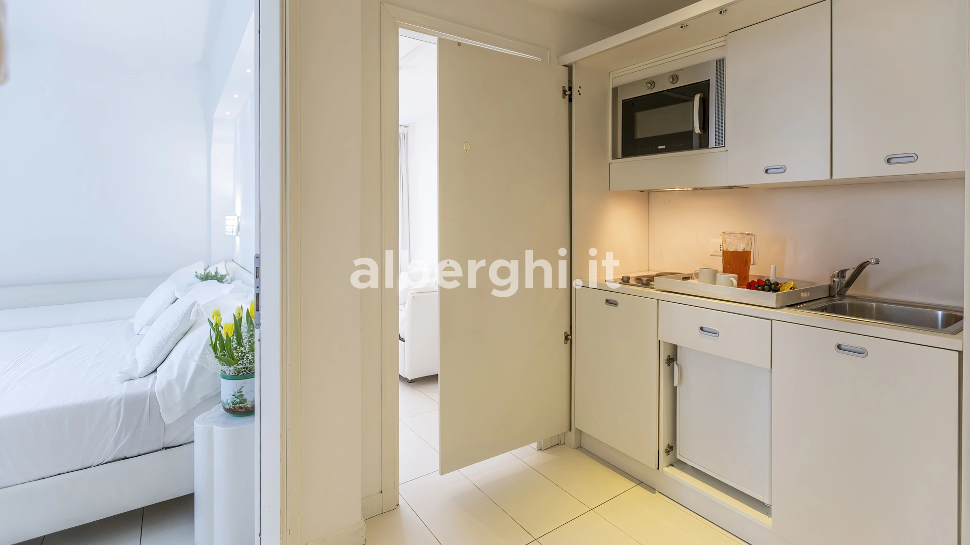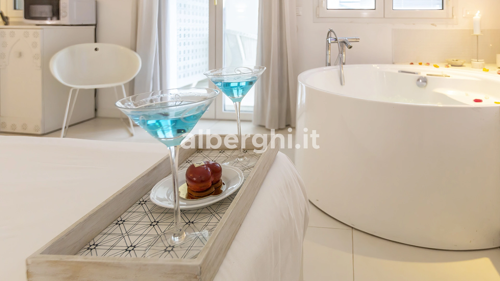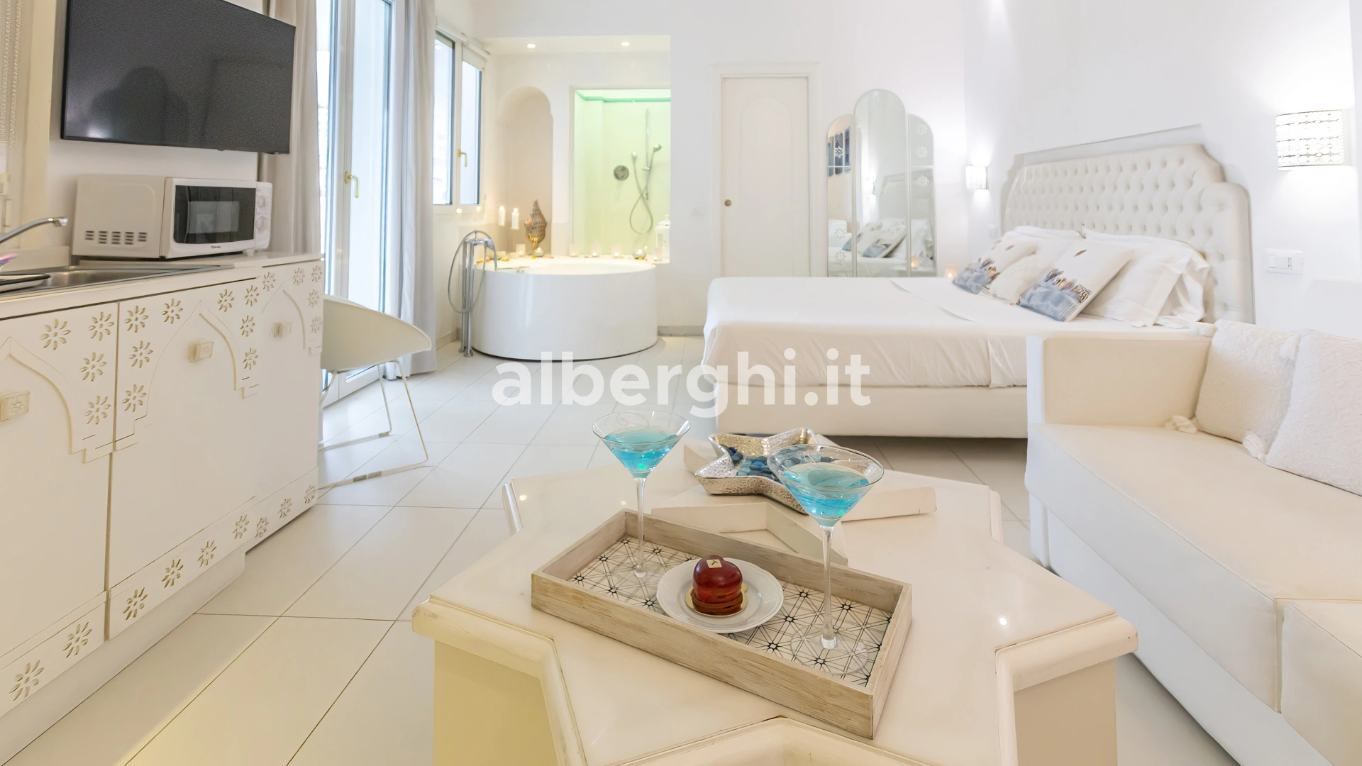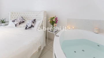 SUITE WELLNESS: balcon donnant sur le jardin, baignoire d'hydrothérapie multifonctions, douche avec source de lumière chromatique et mini-cuisine équipée de plaques électriques, micro-ondes, lave-vaisselle.