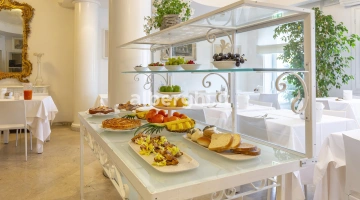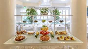 PETIT DÉJEUNER ET BRUNCH: sucré et salé avec des options "Sweet" (gâteaux, tartes et biscuits faits maison, croissants vides, assortiment de confitures, beurre à tartiner, miel, Nutella et sirop d'érable). "Salées" (tartes salées, croissants et sandwichs salés, pain frais, thon, fromage, œufs durs et brouillés aux lardons), "Healty" (fruits frais, secs et en conserve, salade de fruits, yaourts, cornflakes, muesli et riz soufflé), jus de fruits, boissons au lait et au café, riche choix de produits sans gluten. Le brunch est servi jusqu'à 11h30 en été; jusqu'à 10h30 en hiver.