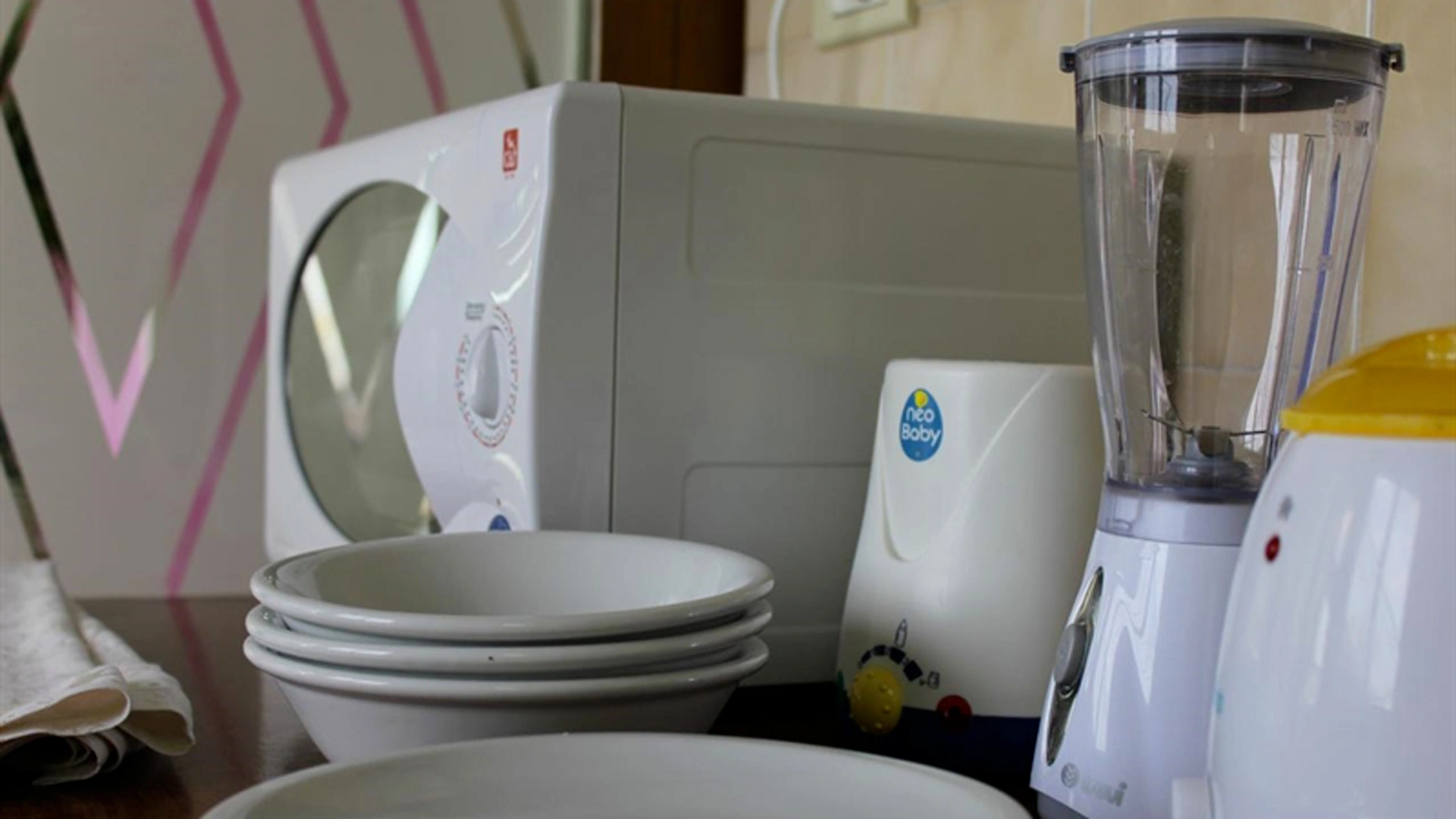 Aux repas : chaises hautes à table, chauffe biberon.