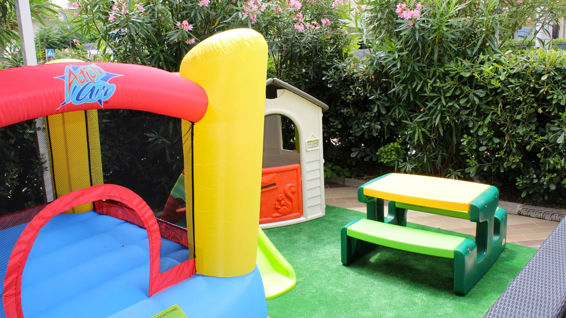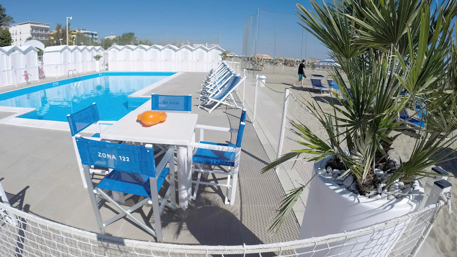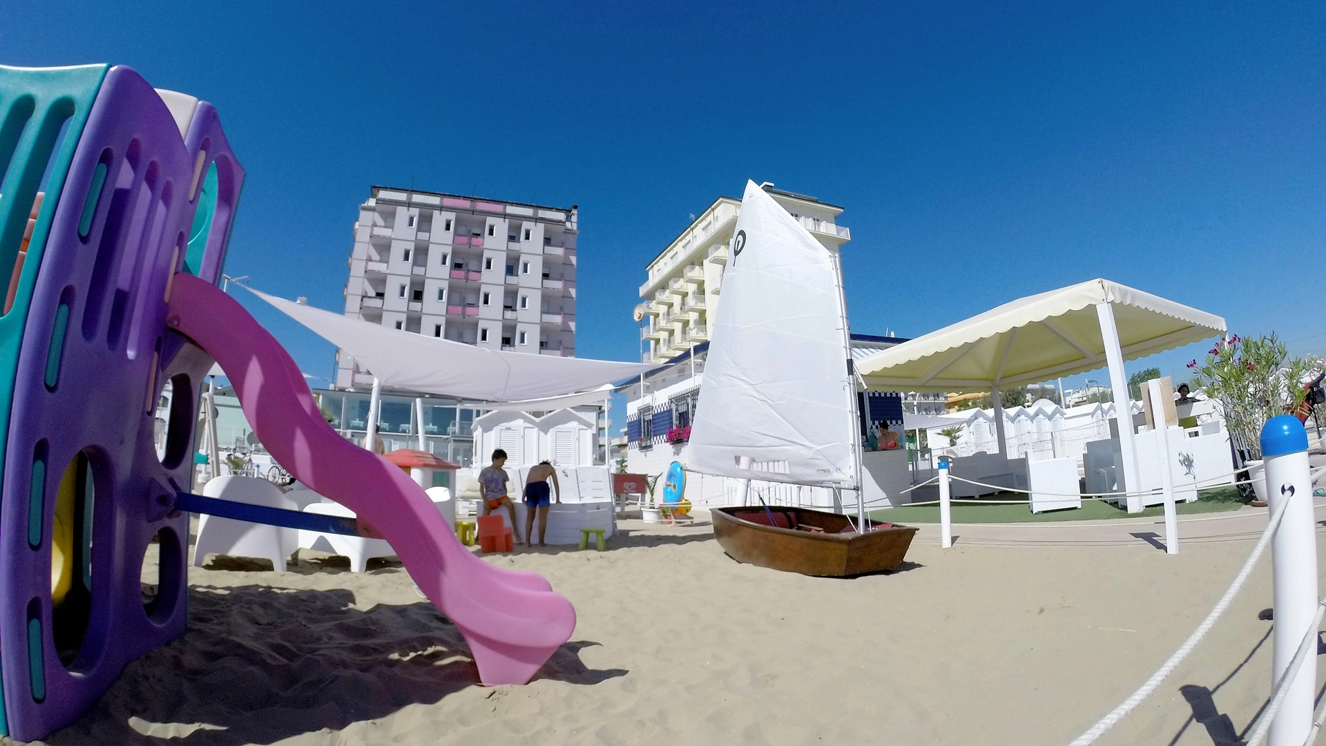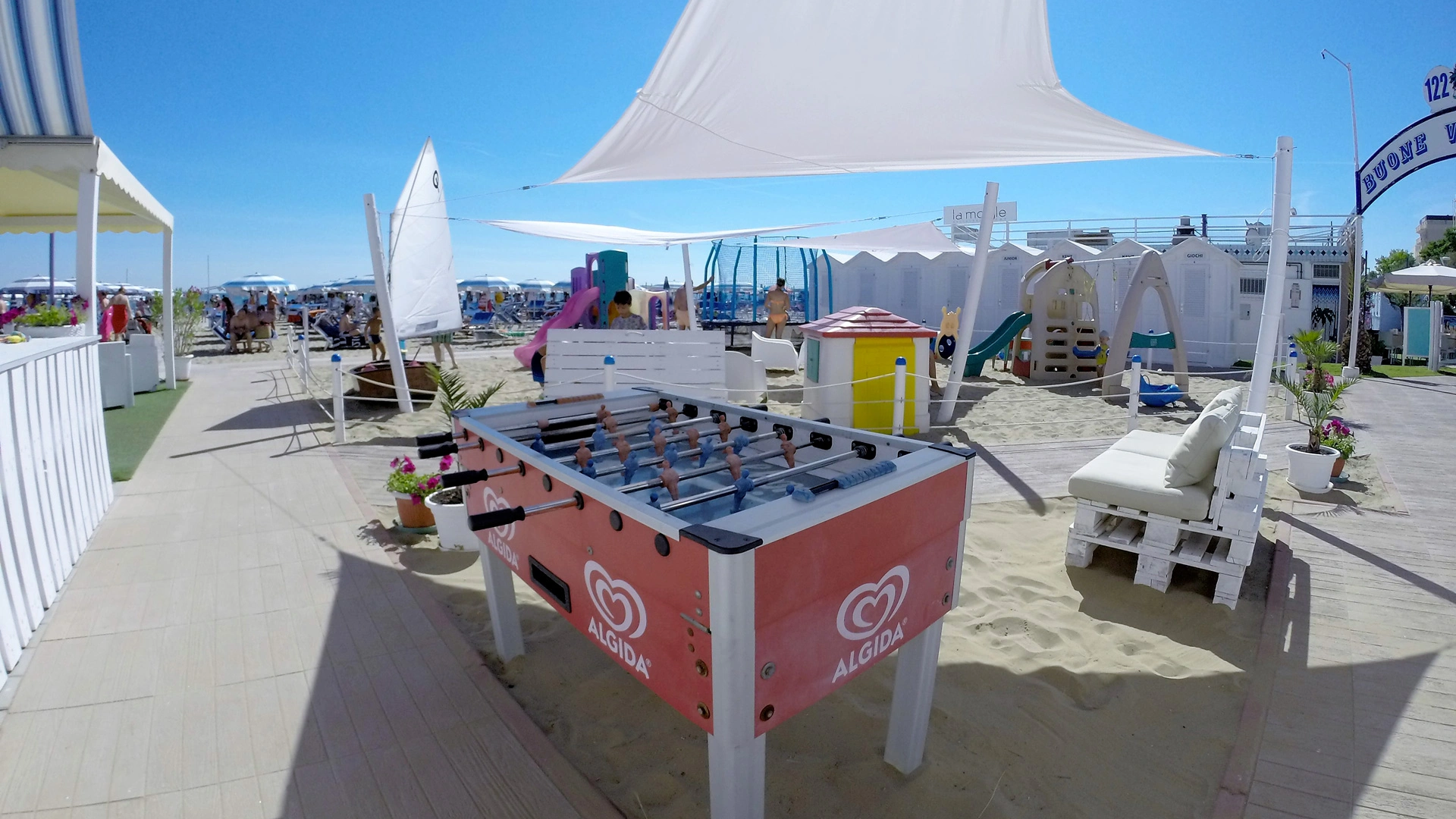 À la plage : aire de jeux, bassin pour enfants, table de ping-pong, table à langer.
