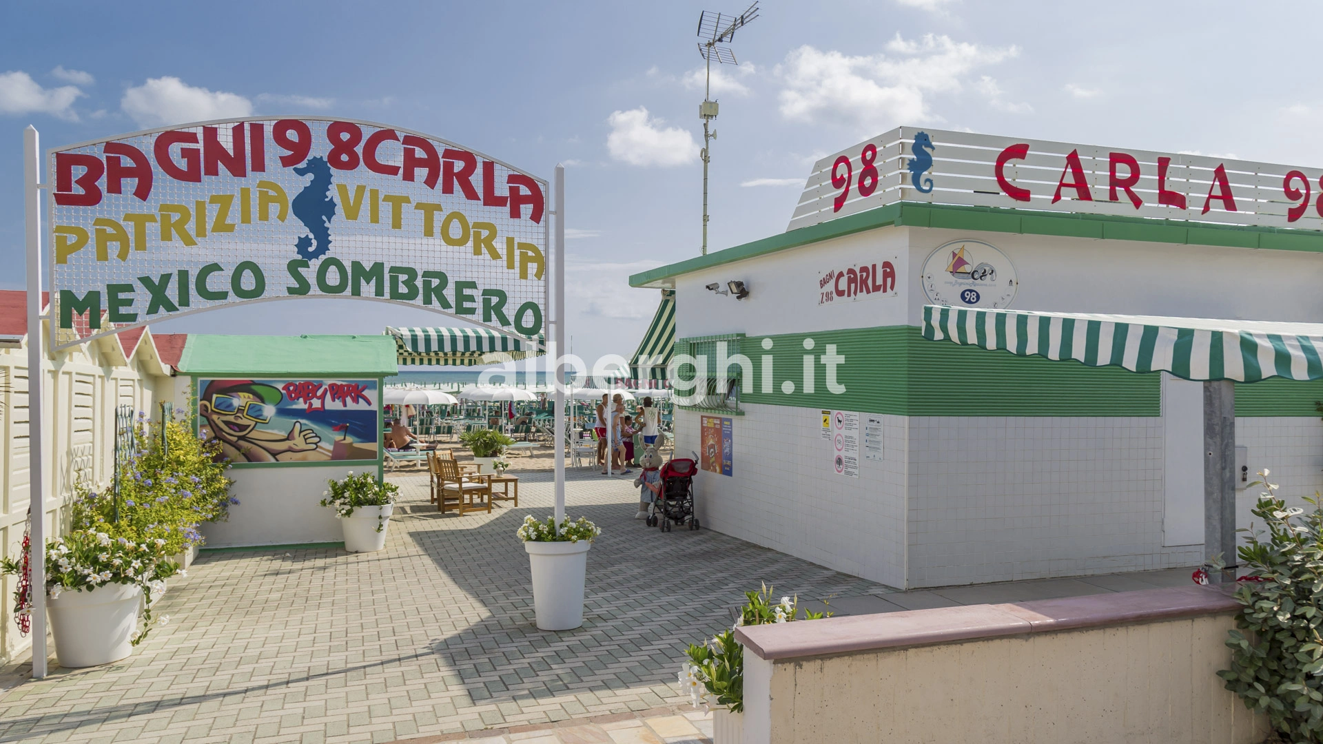 L'hôtel a un accord avec Bagno Carla n.98 et Bagno Rina n.99. Cette dernière est équipée d'un mini club, d'animations pour adultes et enfants, d'un espace détente et espace fitness pour jouer au beach-volley et au beach tennis, de location de canoës et pédalos.