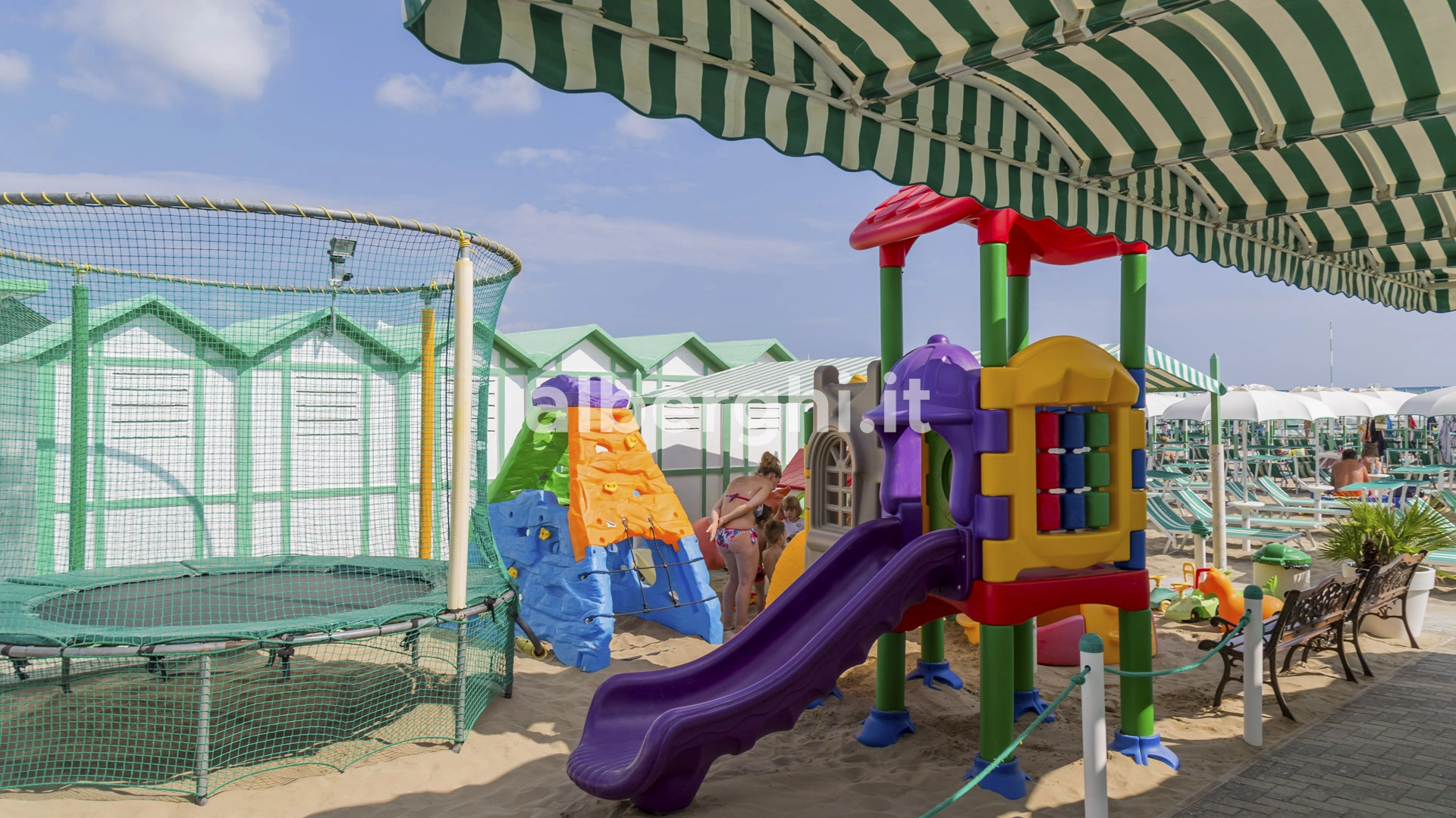 Sur la plage: aire de jeux équipée, jouets divers (pelles, seaux...), animations (baby dance, jeux d'équipe, goûters à thème), crèche, baignoire bébé et table à langer.