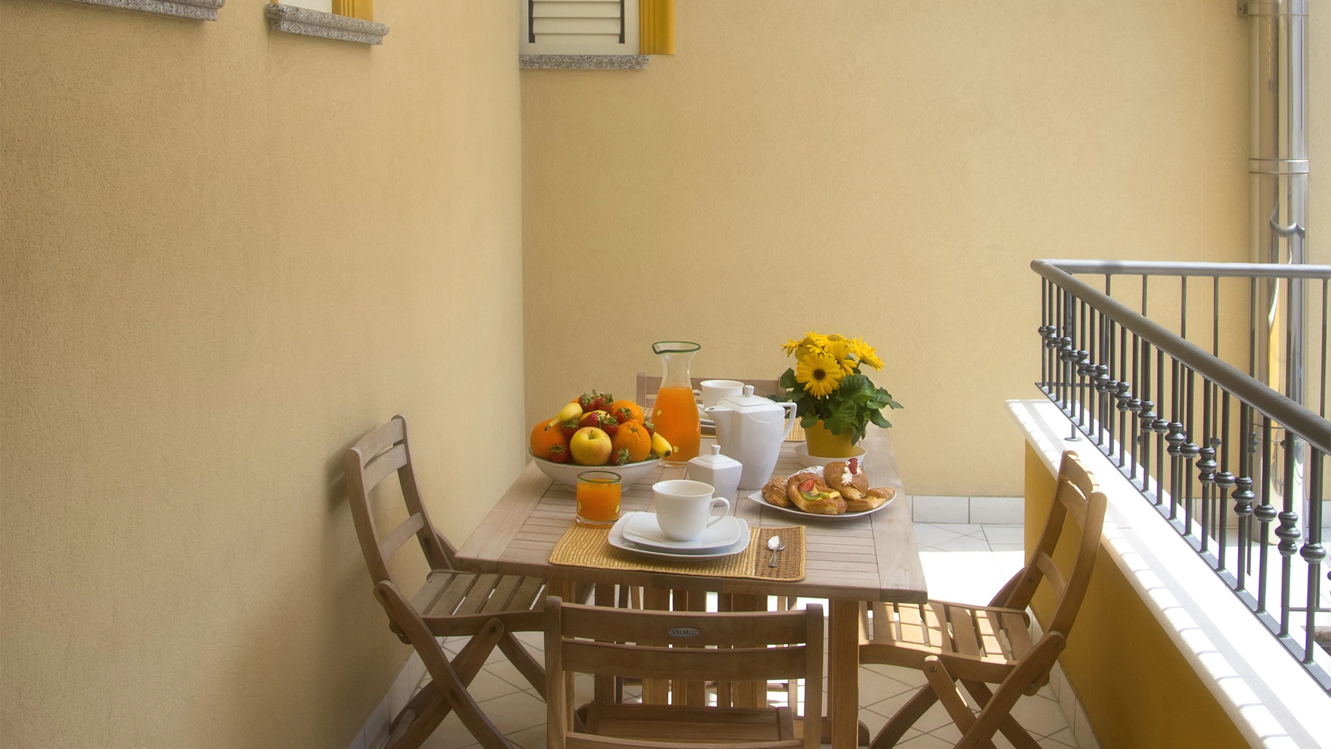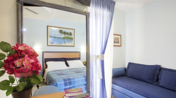 CHAMBRE DOUBLE + CHAMBRE: solutions composées d'une chambre double et d'une chambre simple. Corallo peut accueillir 4 personnes, dispose de 2 salles de bains et de 3 petits balcons; Perla peut accueillir 5 personnes, ne dispose que d'une seule salle de bain et d'une cour carrelée.