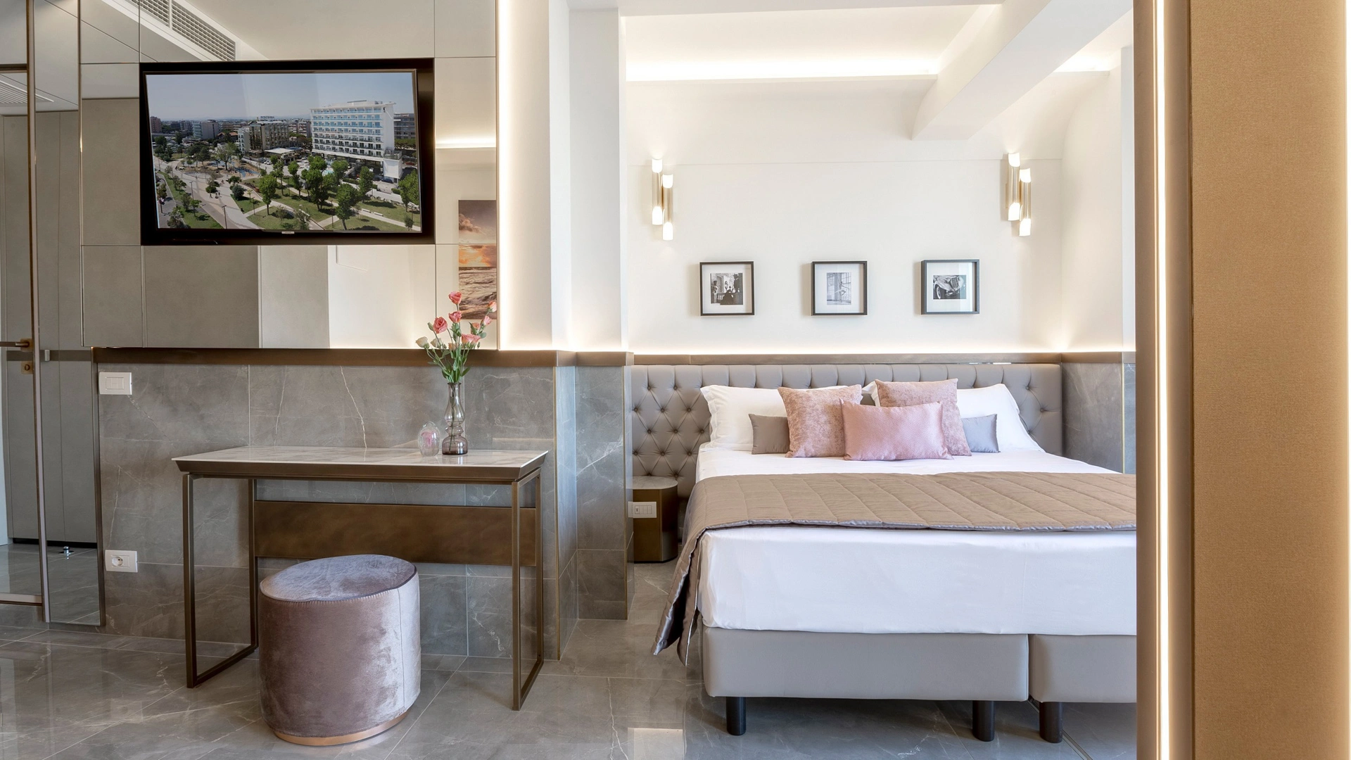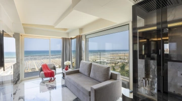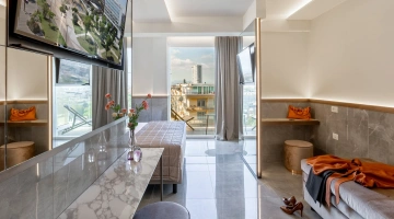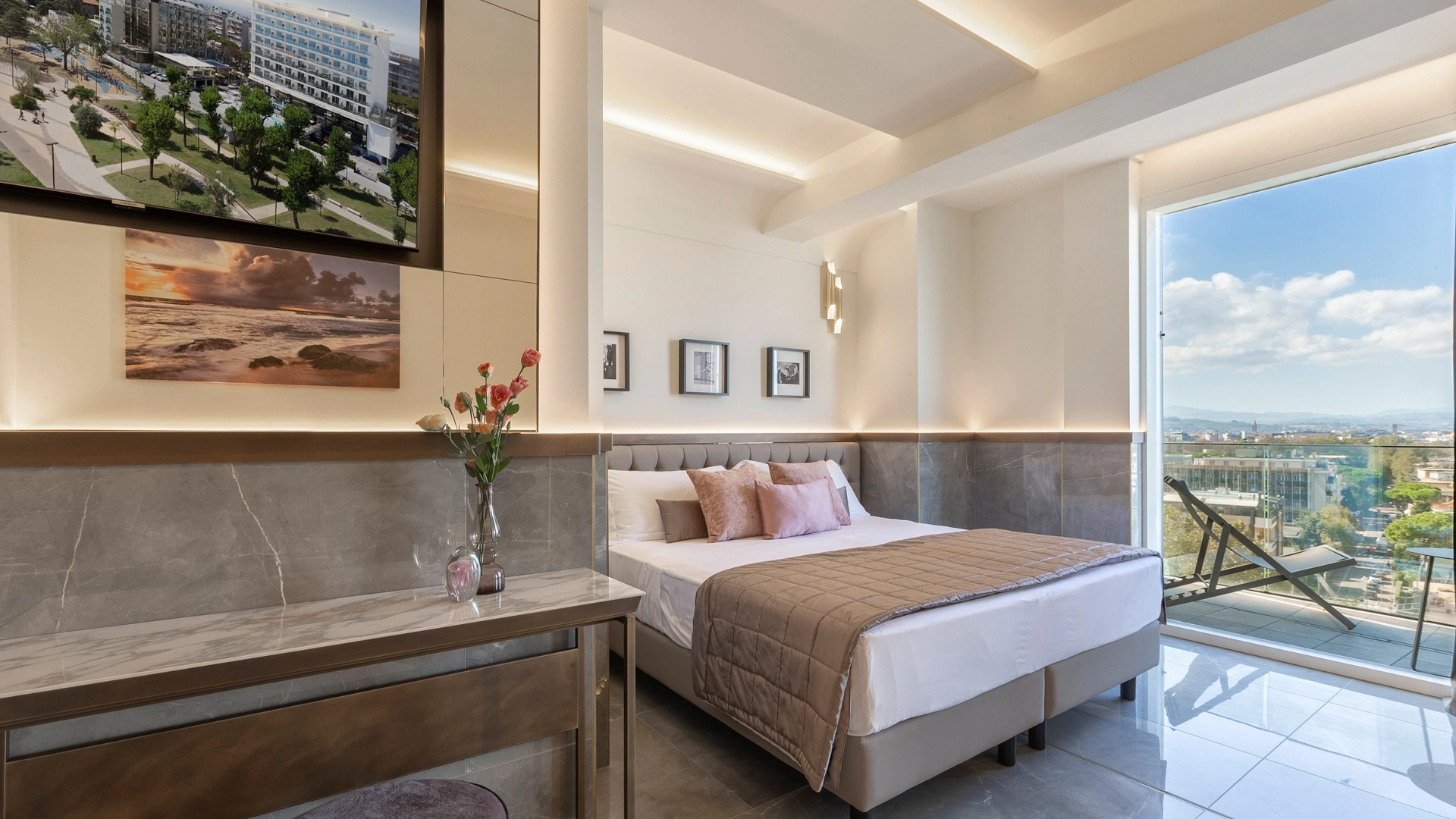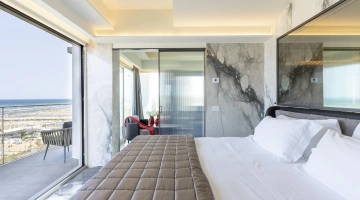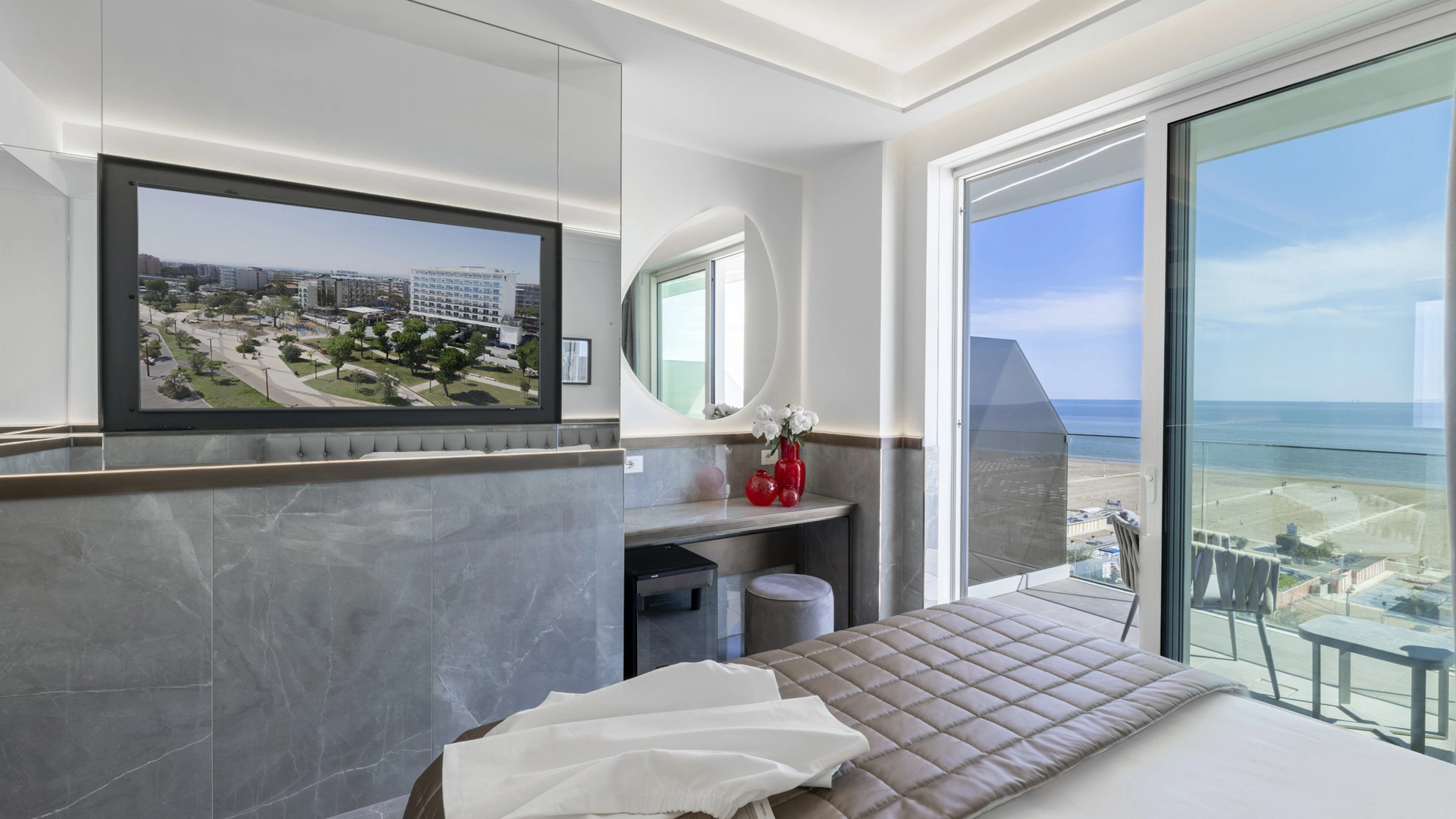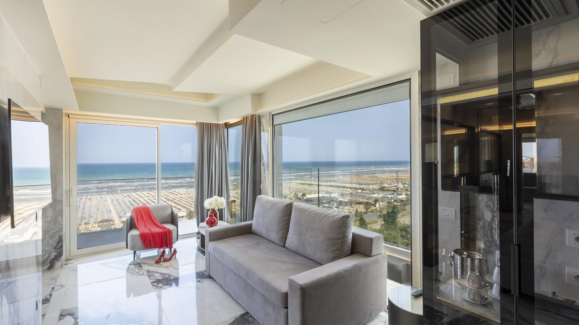 SUITE LUXURY: grandes suites avec vue panoramique au dernier étage de l'hôtel, ornées de marbre statuaire et dotées d'équipements de qualité.