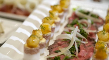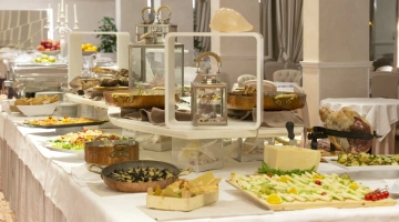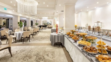 PETIT DÉJEUNER: buffet sucré et salé avec céréales, yaourts, fruits frais, confitures, charcuterie, bacon, œufs.