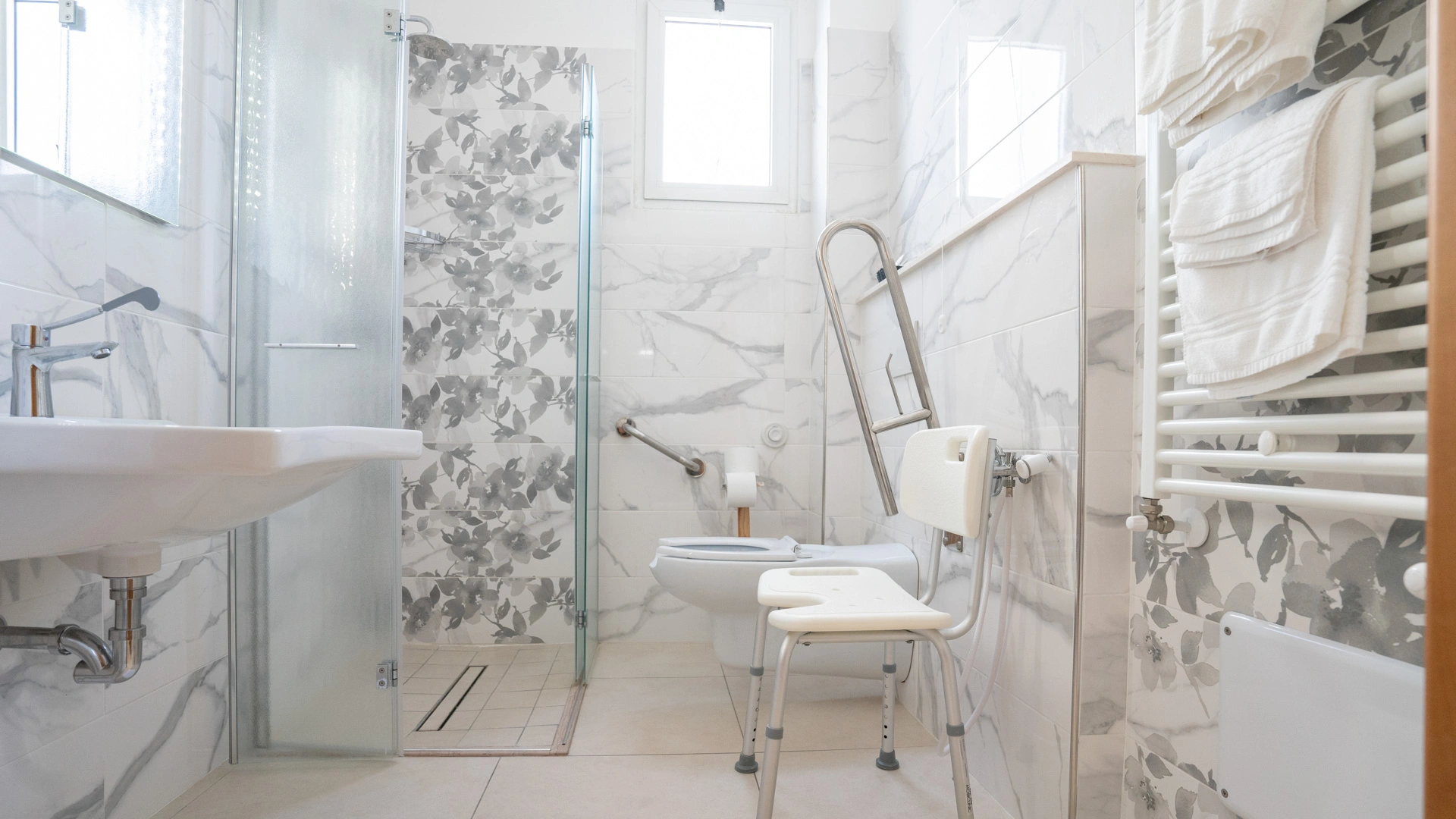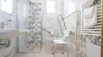 SERVICES AUX PERSONNES HANDICAPÉES: entrée au rez-de-chaussée avec rampe inclinée, chambre spacieuse avec aides, douche accessible par chaise et chaise de douche.