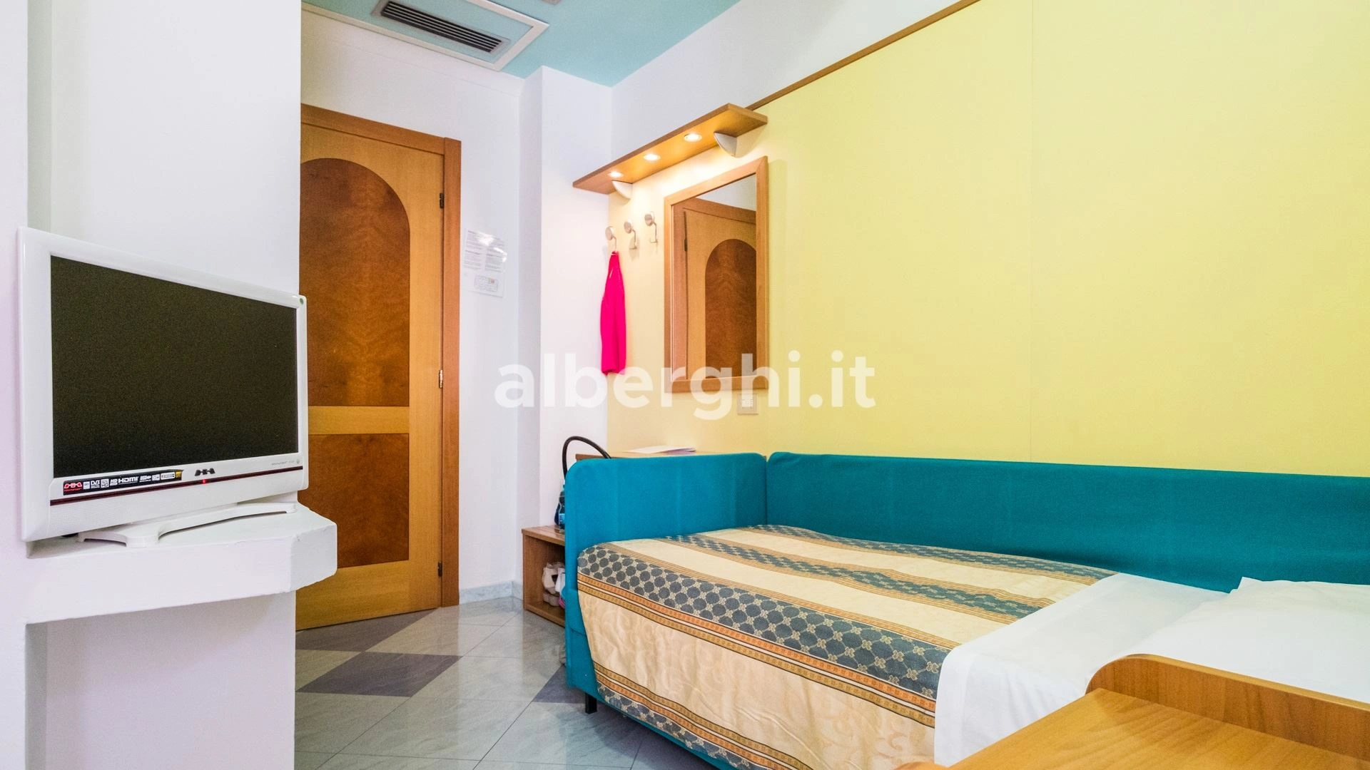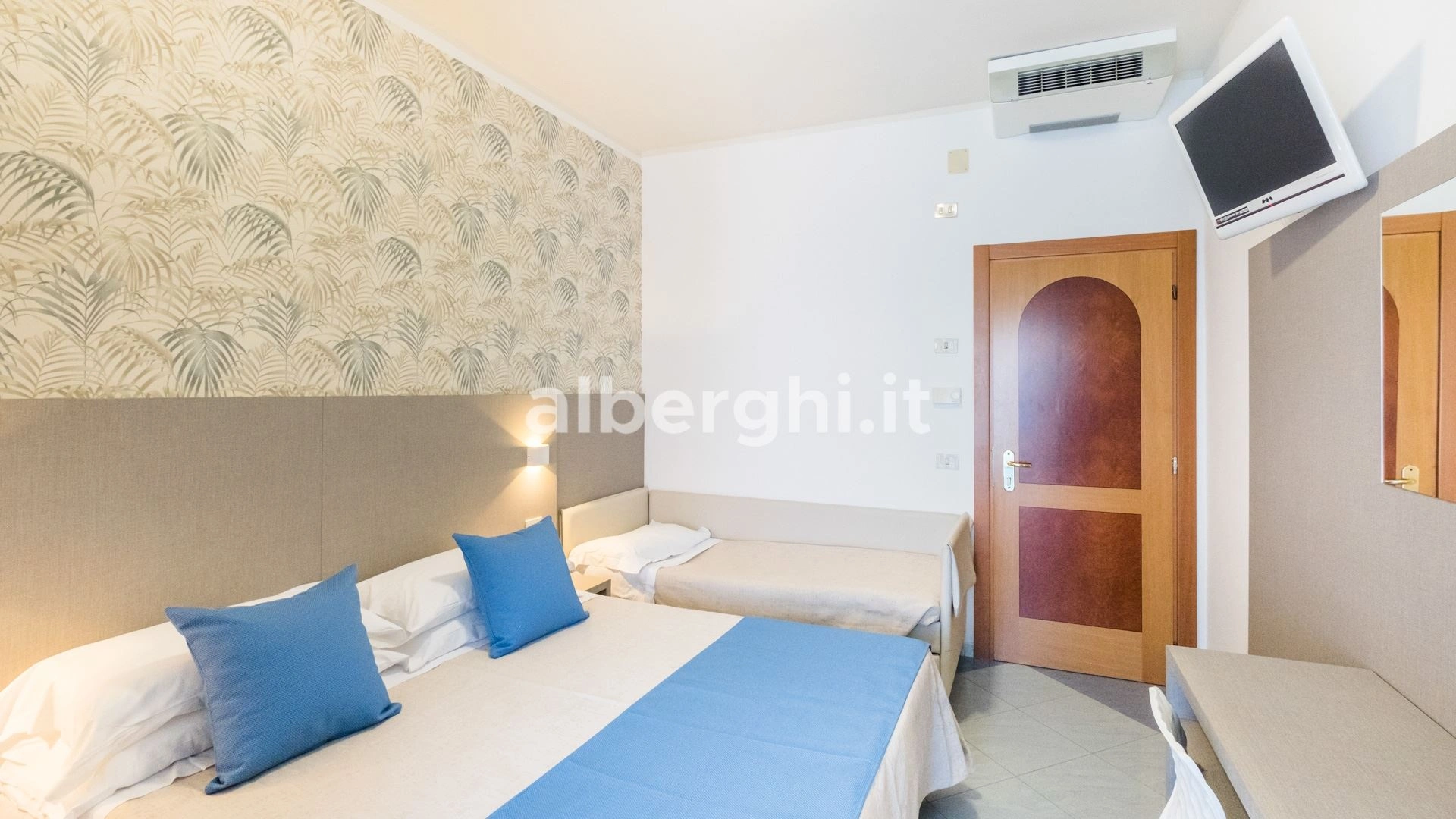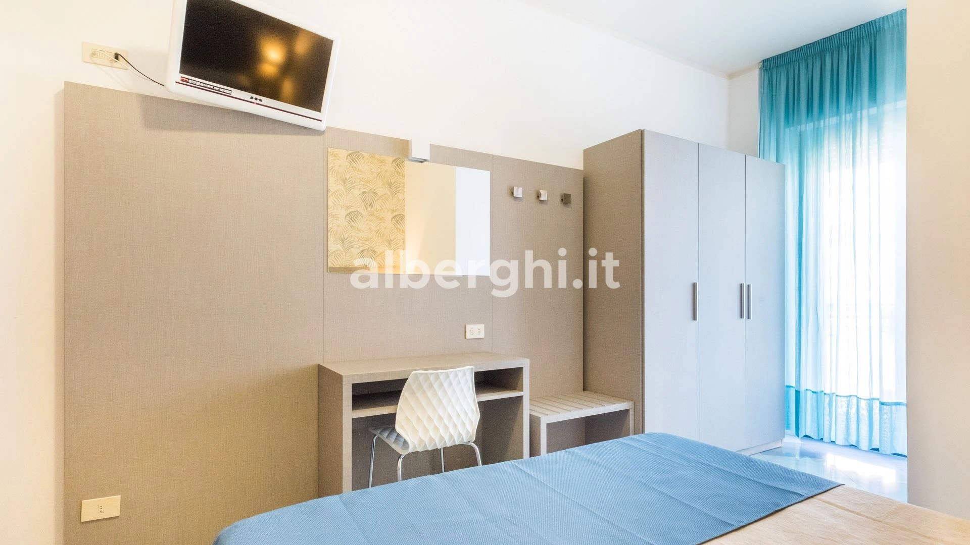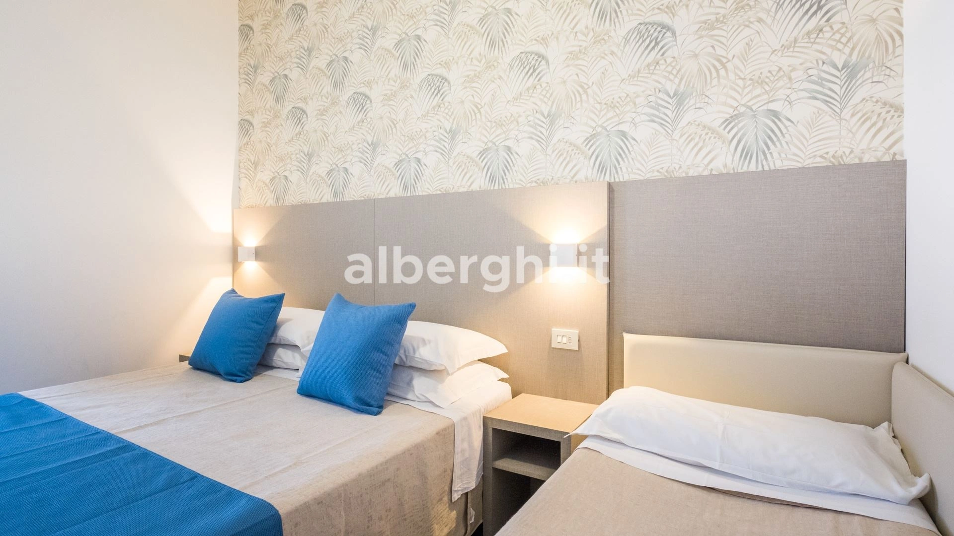 CONFORT PLUS: à l'avant de l'hôtel avec mobilier rénové en 2023, boissons de bienvenue dans le mini-réfrigérateur, balcon avec vue latérale sur la mer (plus visible à partir du deuxième étage; set de courtoisie avec 2 peignoirs, chaussons, serviettes de plage à usage personnel.