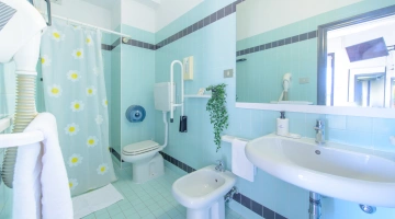 SERVICES AUX PERSONNES HANDICAPÉES: entrée au rez-de-chaussée, ascenseur conforme, chambre avec espace fauteuil roulant, douche et chaise de douche accessibles.
