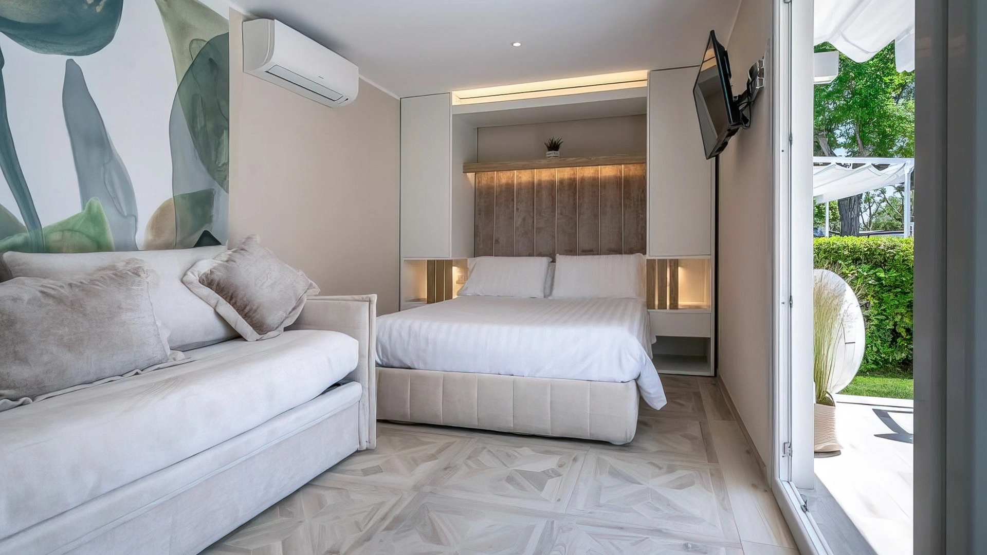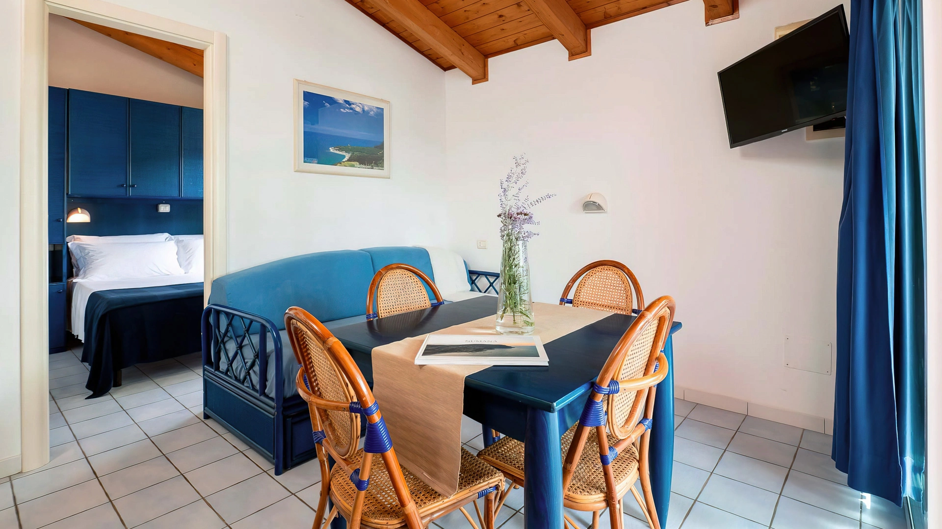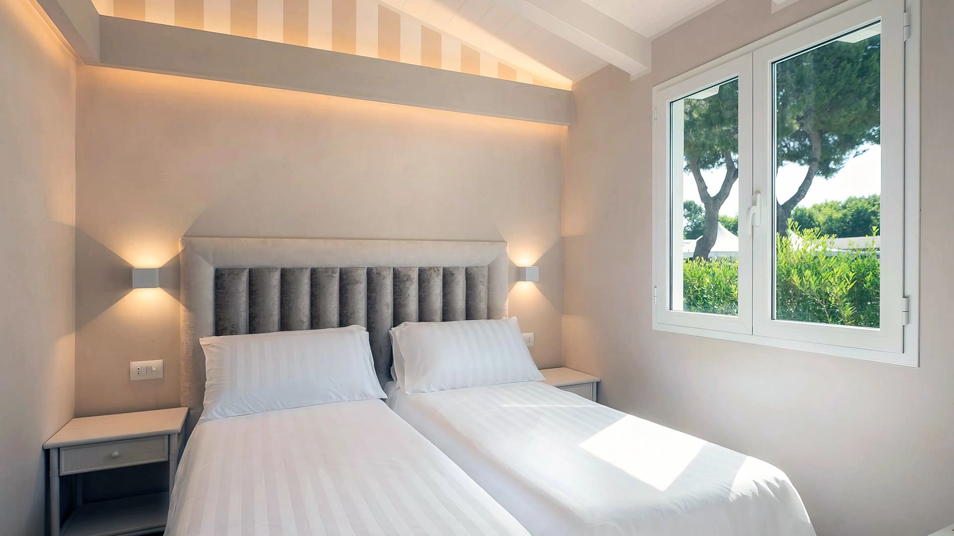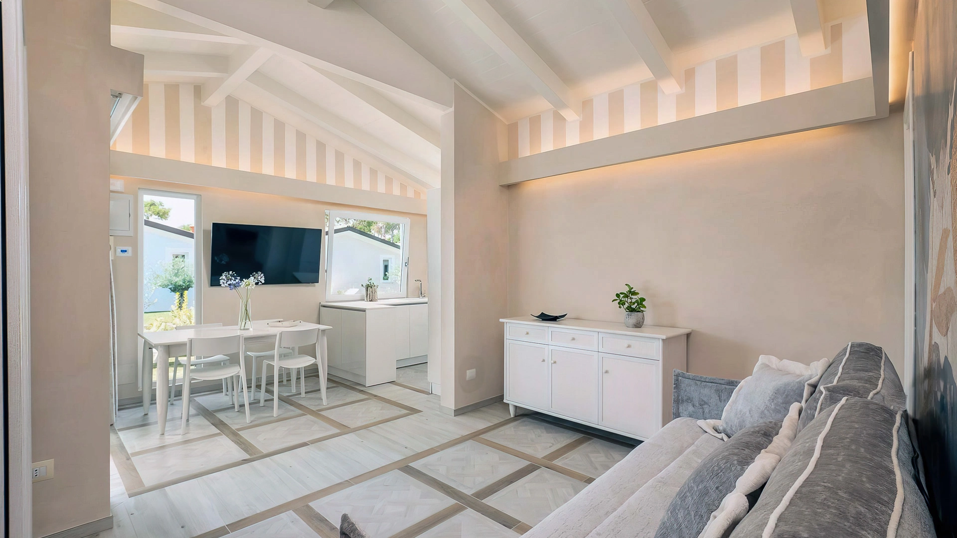 La propriété propose des hébergements dans des villas modernes ou des bungalows au mobilier classique, pouvant accueillir de 2 à 6 personnes. Villas et bungalows disposent d'une entrée privée, d'un jardin avec chaises longues, d'une véranda meublée, d'une kitchenette avec micro-ondes, d'une chambre double, d'une salle de bain, de la télévision avec Sky TV, de la climatisation, d'un coffre-fort, du Wi-Fi et d'un parking. Les villas sont disponibles avec une cuisine séparée ou ouverte avec four électrique, lave-vaisselle, lave-linge et deux salles de bain.