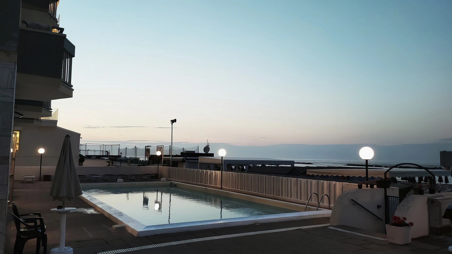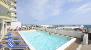 La piscine se trouve sur la terrasse de l'hôtel, avec vue directe sur la plage. Elle mesure 90 mètres carrés, a une profondeur de 110 cm et est entourée d'un espace solarium avec parasols et transats.