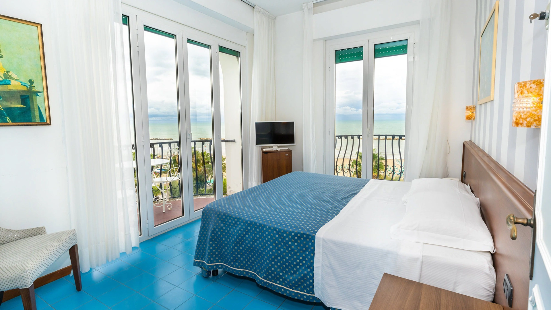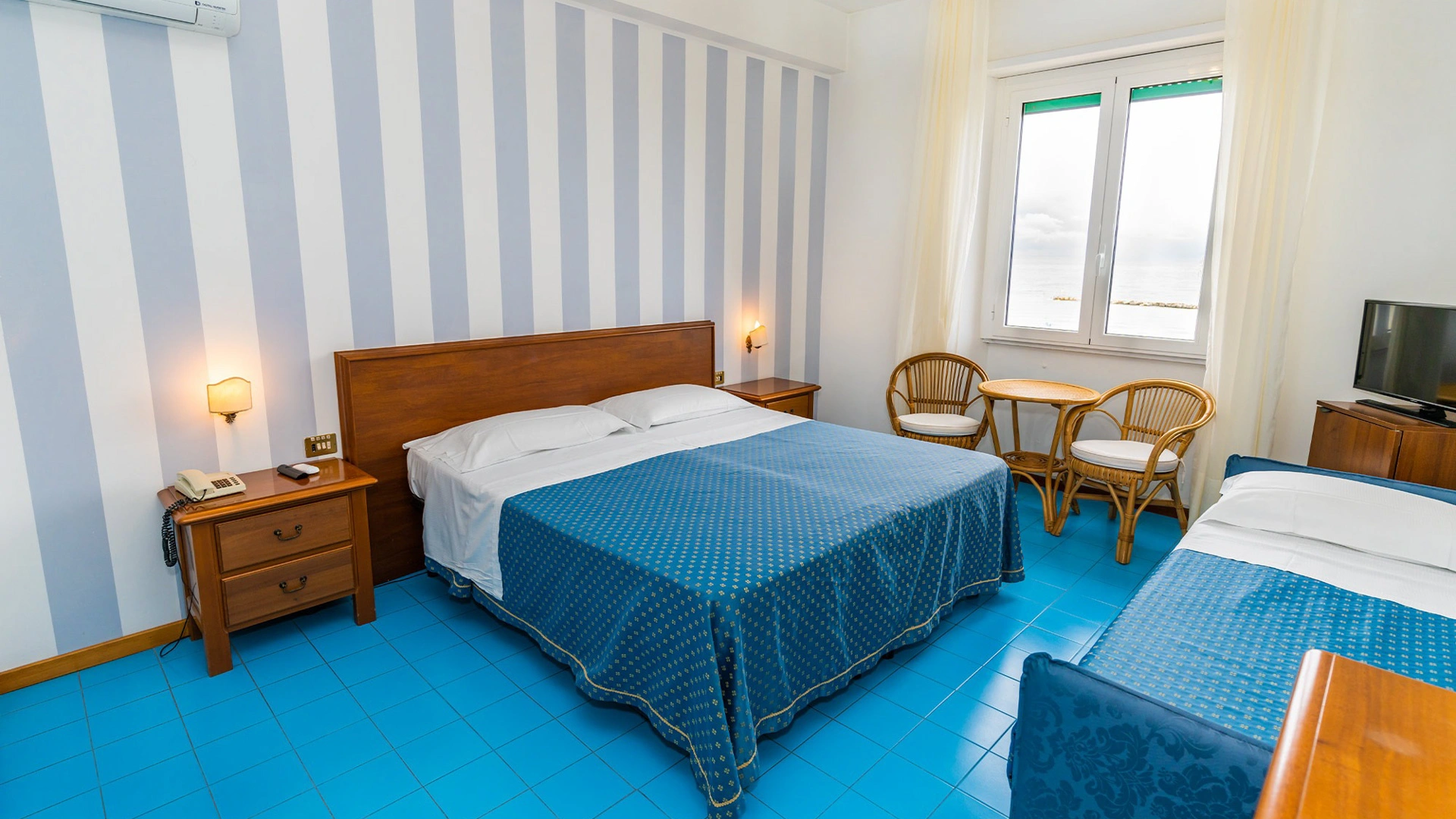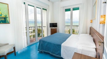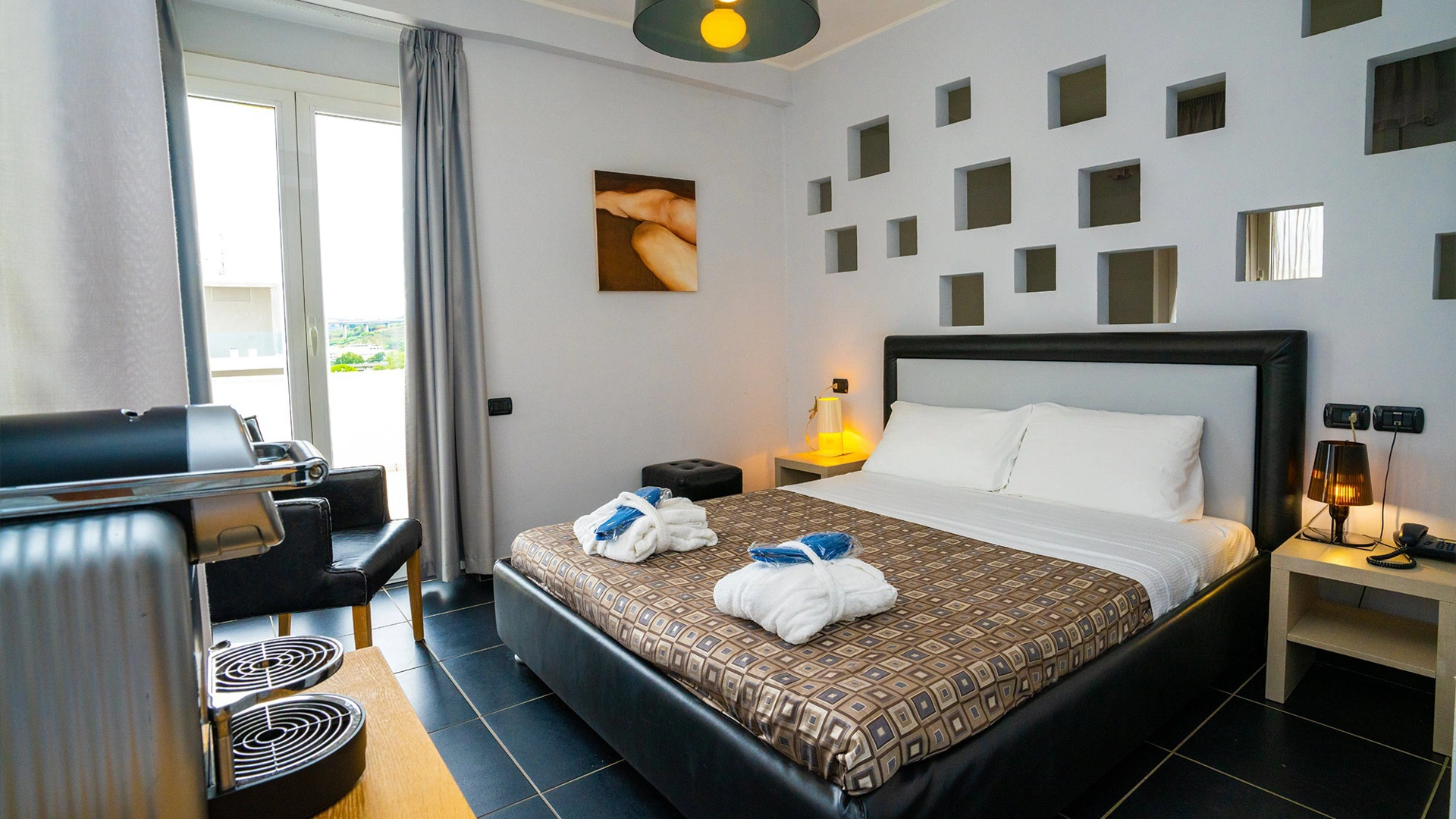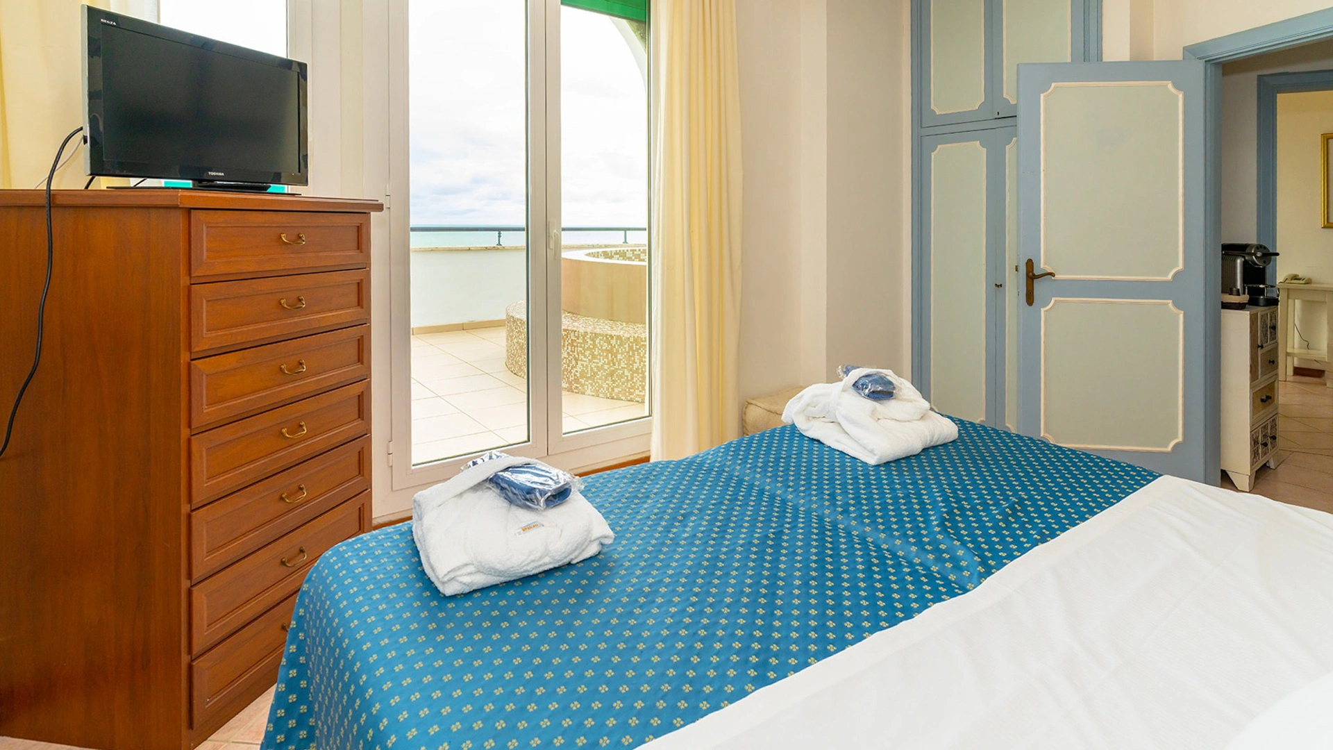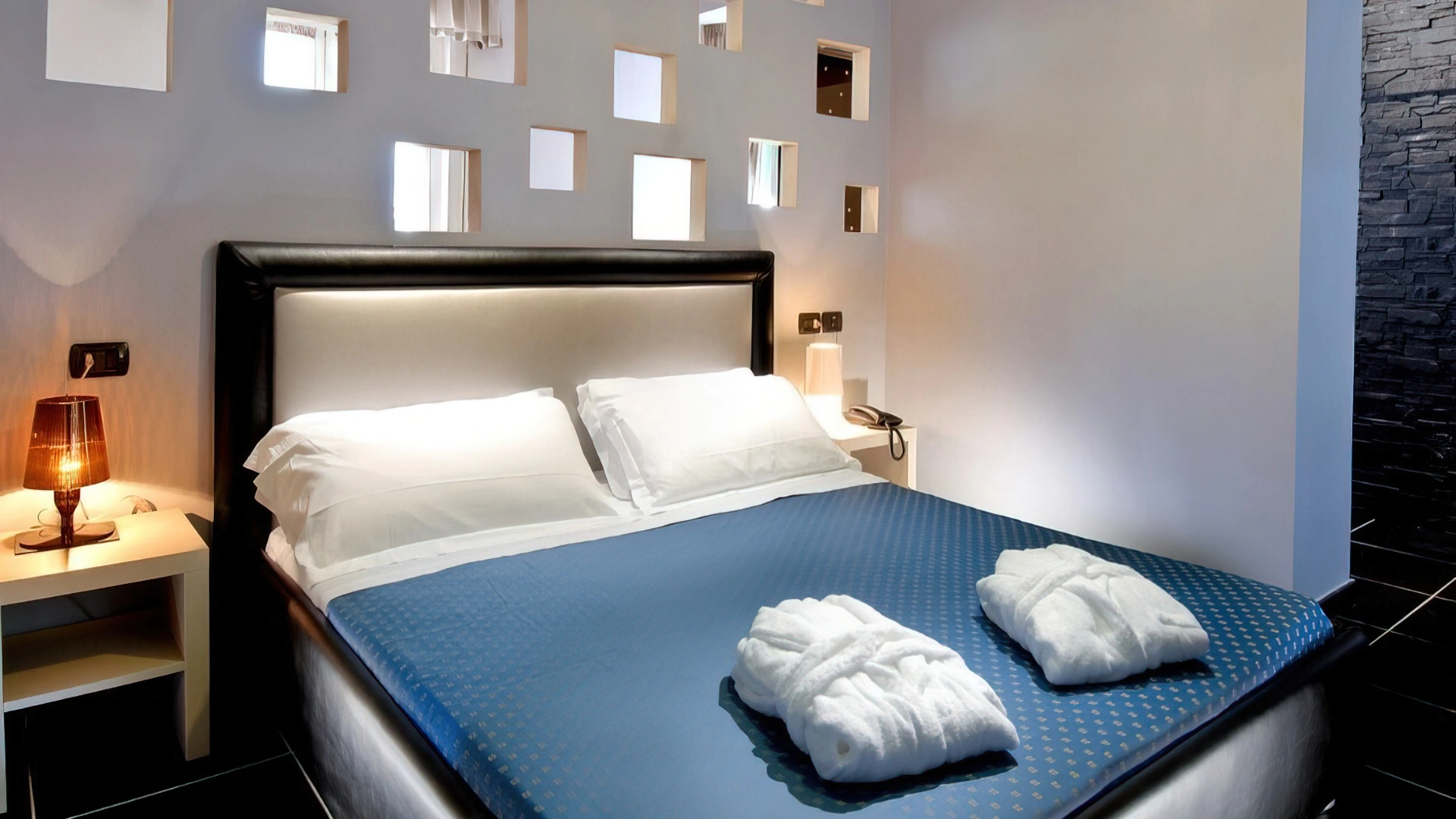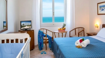 L'établissement propose des chambres, des solutions familiales avec entrée commune et espaces séparés, ainsi que des hébergements plus spacieux et plus élégants. Tous les logements sont équipés de la climatisation, du Wi-Fi, de la télévision par satellite avec chaînes Sky, d'un coffre-fort, d'un téléphone, d'un minibar et d'une salle de bain privative avec douche et sèche-cheveux. Certaines chambres disposent d'un balcon avec vue sur la mer. Les hébergements les plus exclusifs bénéficient de vastes terrasses face à la mer, équipées d'une mini-piscine, tandis que d'autres sont également agrémentés d'un sauna et d'un espace bien-être privé.