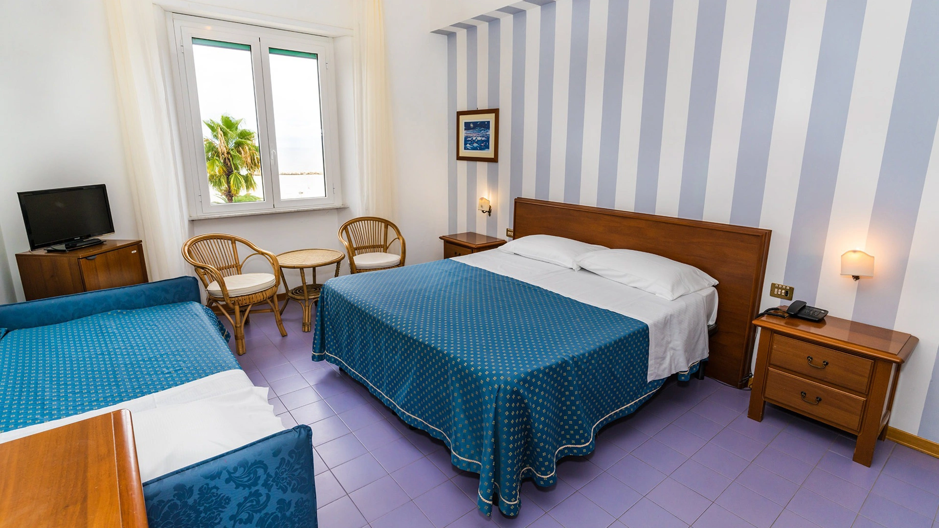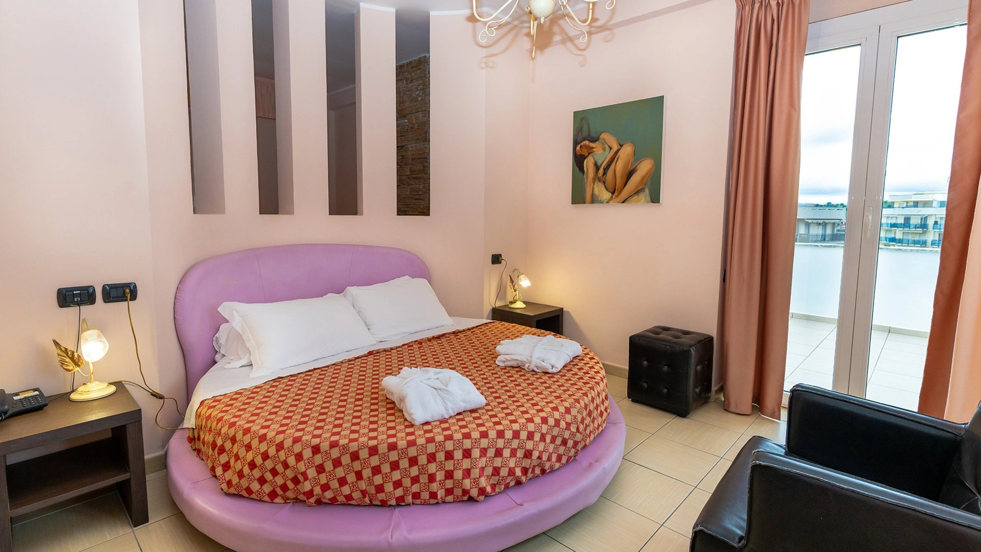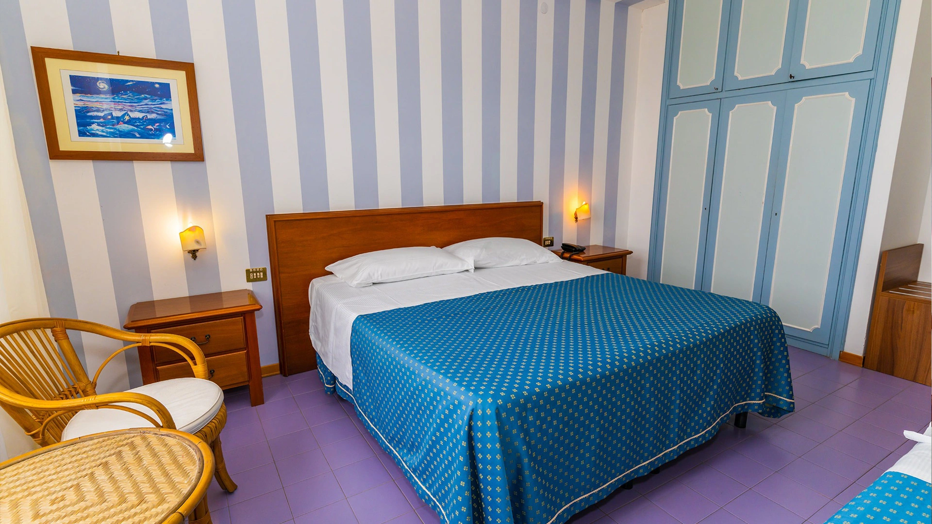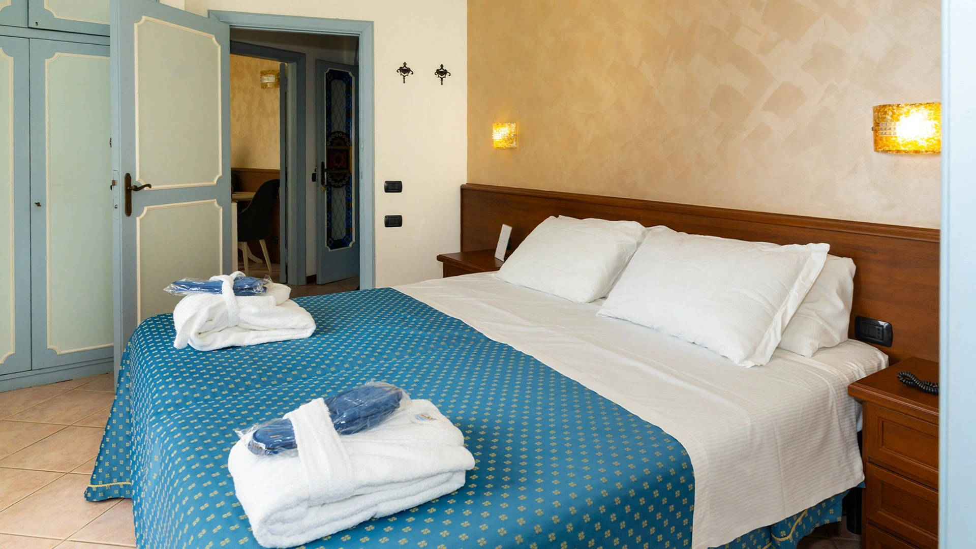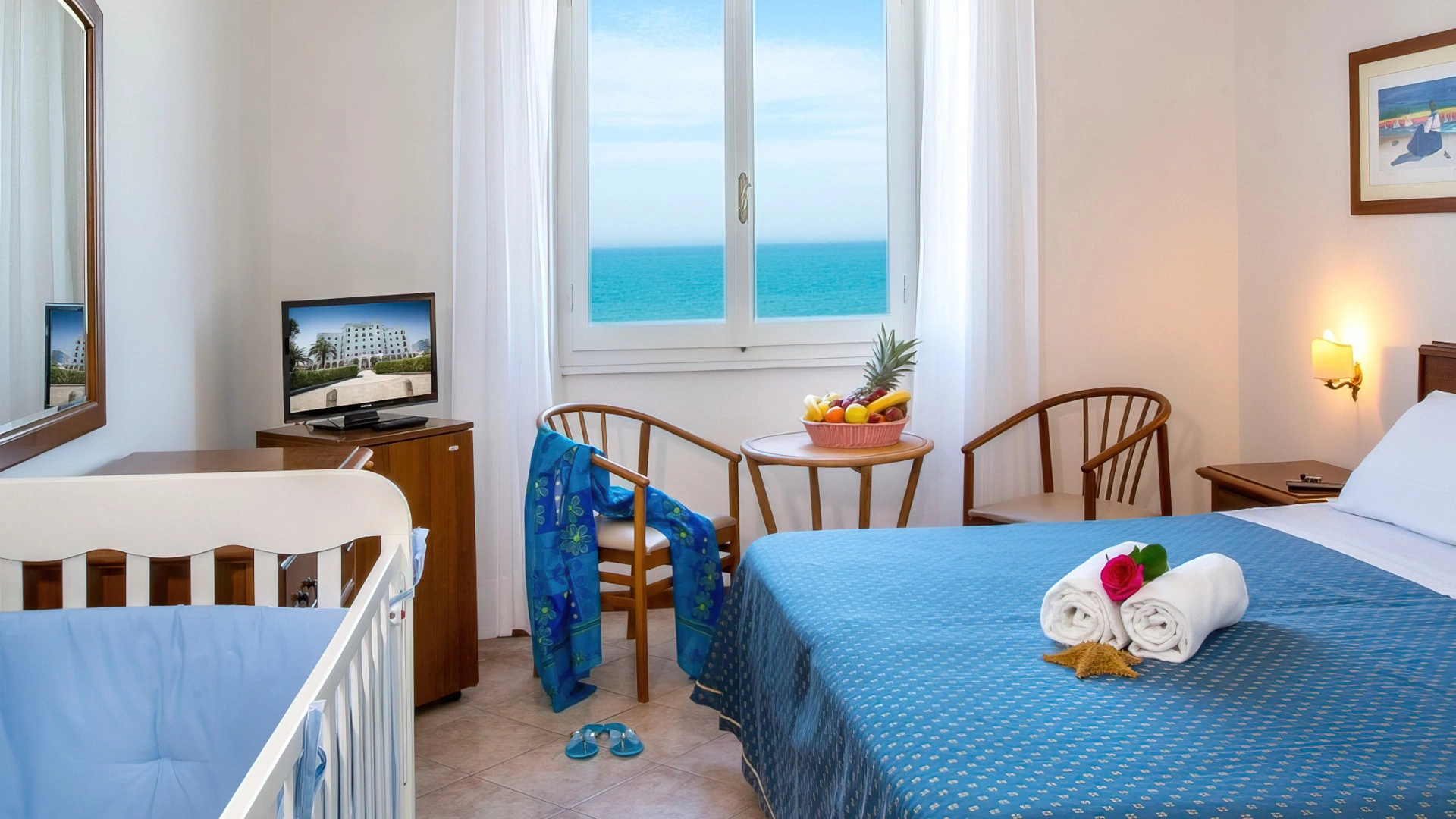 L'établissement propose des chambres, des solutions familiales avec entrée commune et espaces séparés, ainsi que des hébergements plus spacieux et plus élégants. Tous les logements sont équipés de la climatisation, du Wi-Fi, de la télévision par satellite avec chaînes Sky, d'un coffre-fort, d'un téléphone, d'un minibar et d'une salle de bain privative avec douche et sèche-cheveux. Certaines chambres disposent d'un balcon avec vue sur la mer. Les hébergements les plus exclusifs bénéficient de vastes terrasses face à la mer, équipées d'une mini-piscine, tandis que d'autres sont également agrémentés d'un sauna et d'un espace bien-être privé.