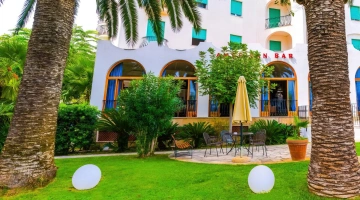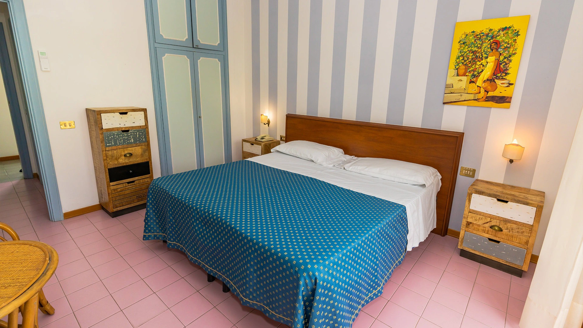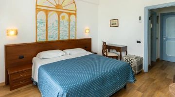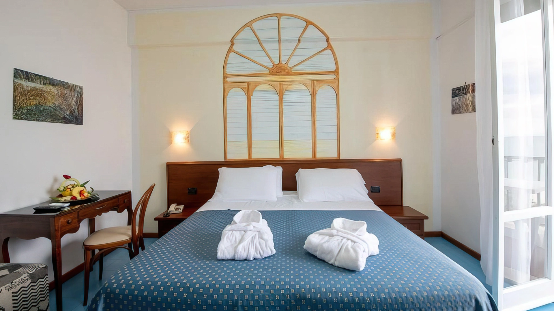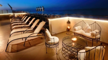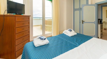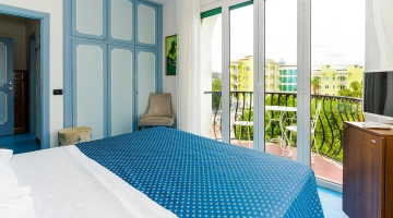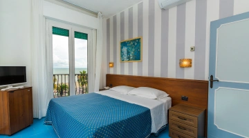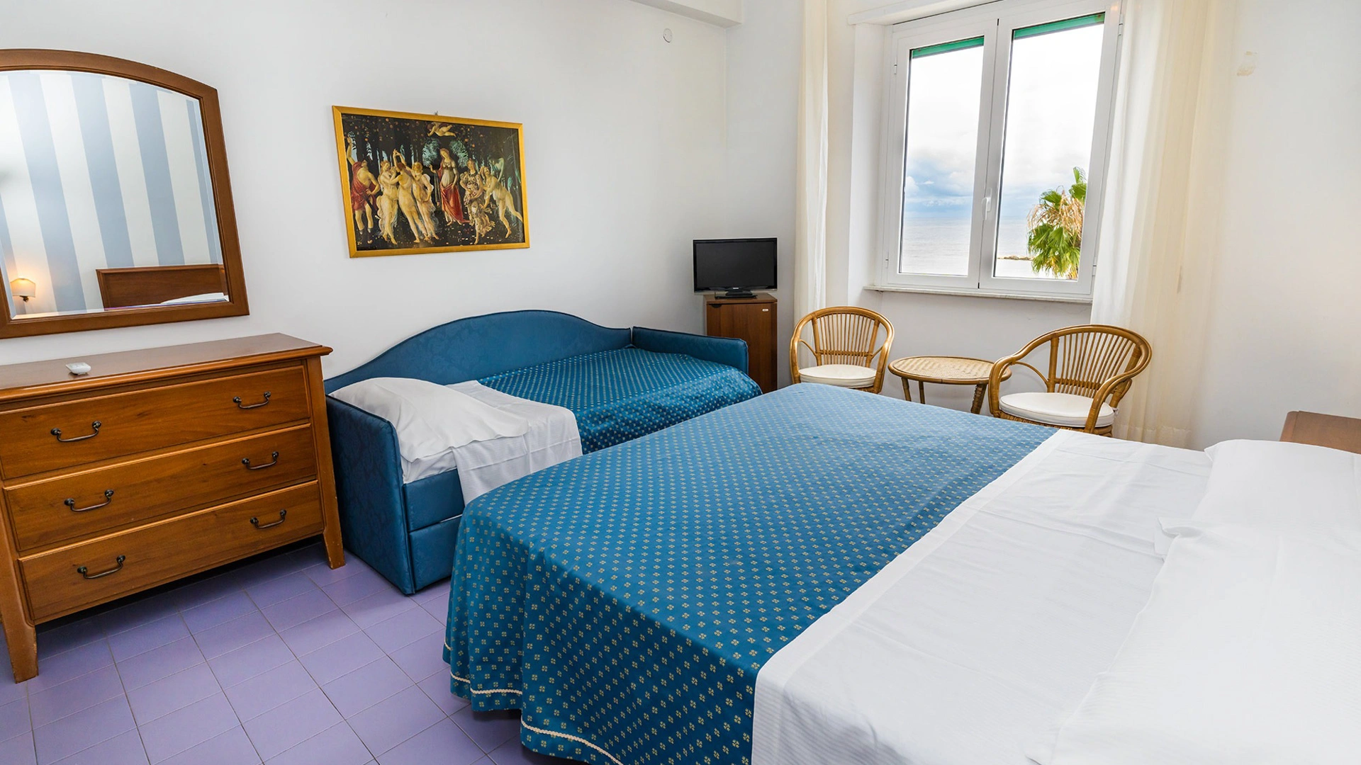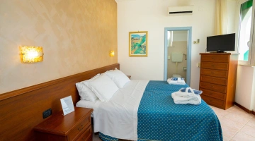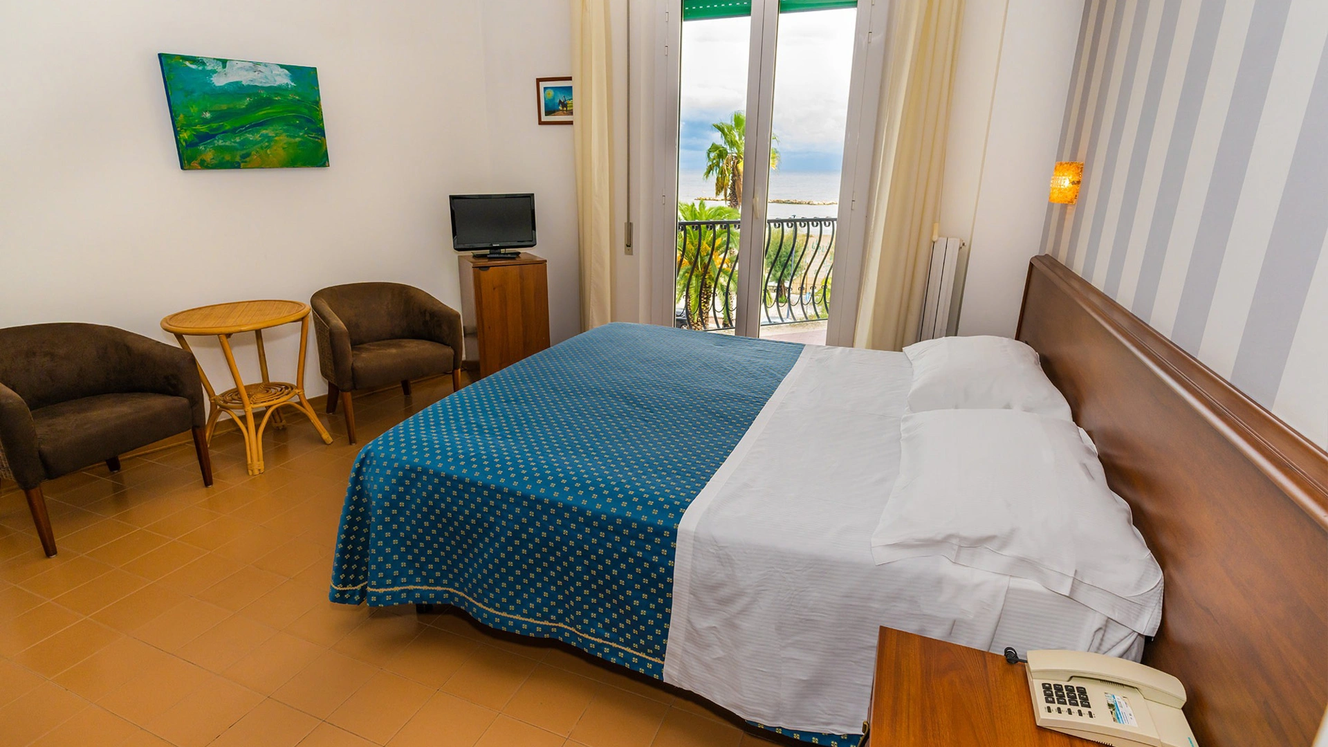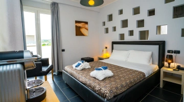 L'établissement propose des chambres, des solutions familiales avec entrée commune et espaces séparés, ainsi que des hébergements plus spacieux et plus élégants. Tous les logements sont équipés de la climatisation, du Wi-Fi, de la télévision par satellite avec chaînes Sky, d'un coffre-fort, d'un téléphone, d'un minibar et d'une salle de bain privative avec douche et sèche-cheveux. Certaines chambres disposent d'un balcon avec vue sur la mer. Les hébergements les plus exclusifs bénéficient de vastes terrasses face à la mer, équipées d'une mini-piscine, tandis que d'autres sont également agrémentés d'un sauna et d'un espace bien-être privé.