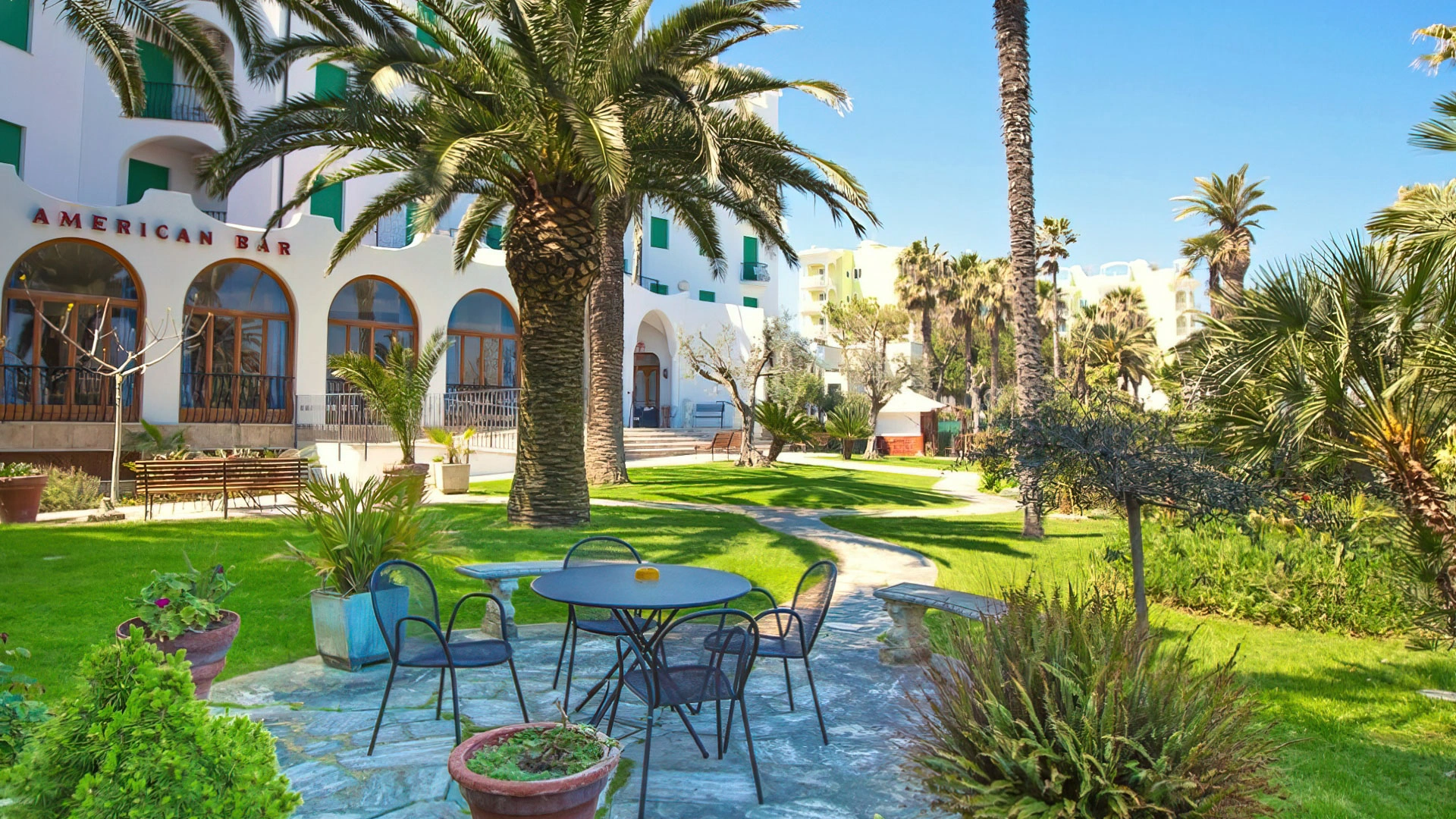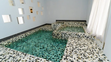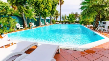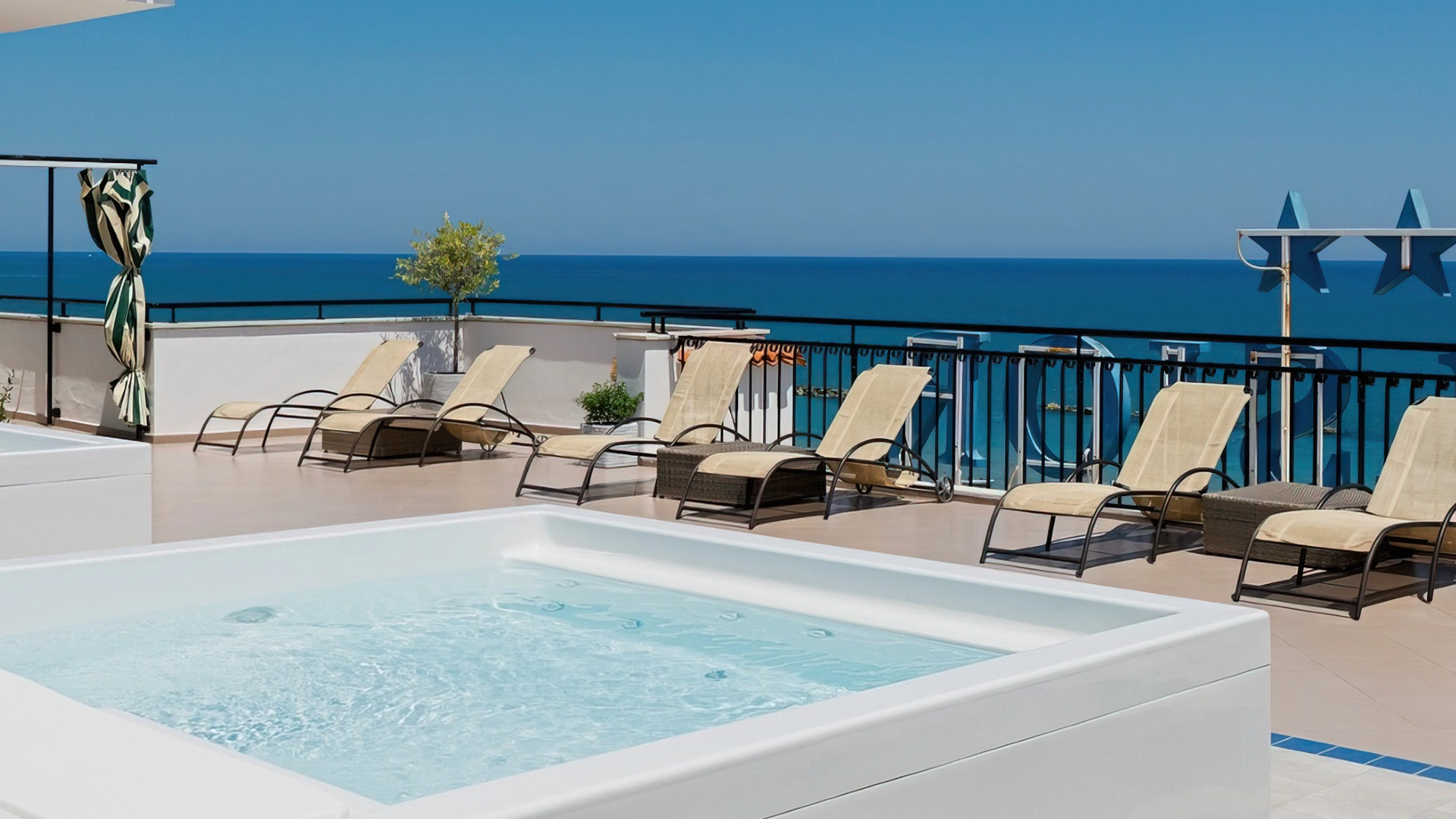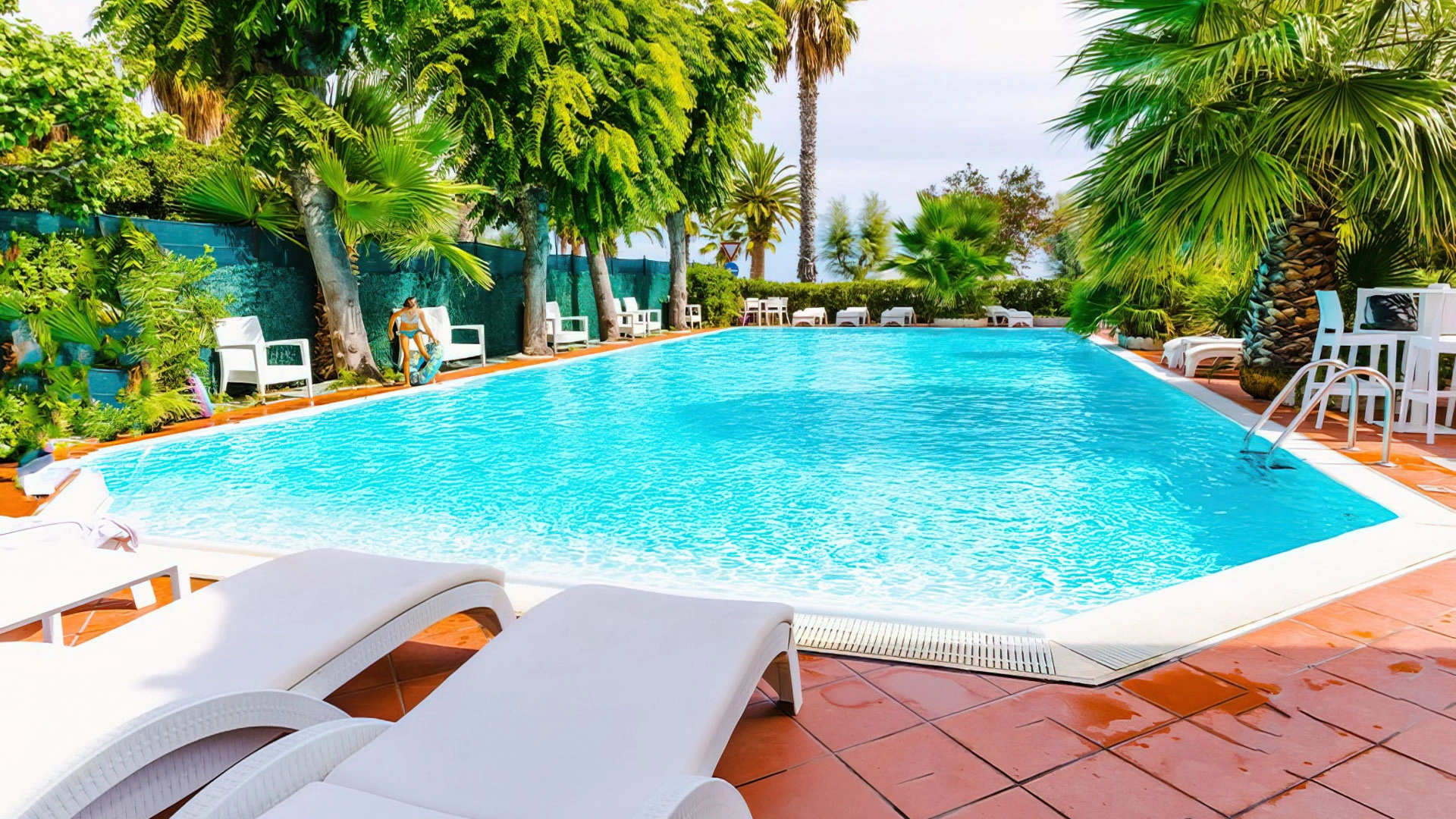 Le jardin abrite deux piscines, une plus grande pour adultes (avec plongeoir) et une pour enfants avec eau peu profonde et stations d'hydromassage. Sur le toit de l'hôtel se trouvent également un espace solarium et deux baignoires d'hydromassage panoramiques.