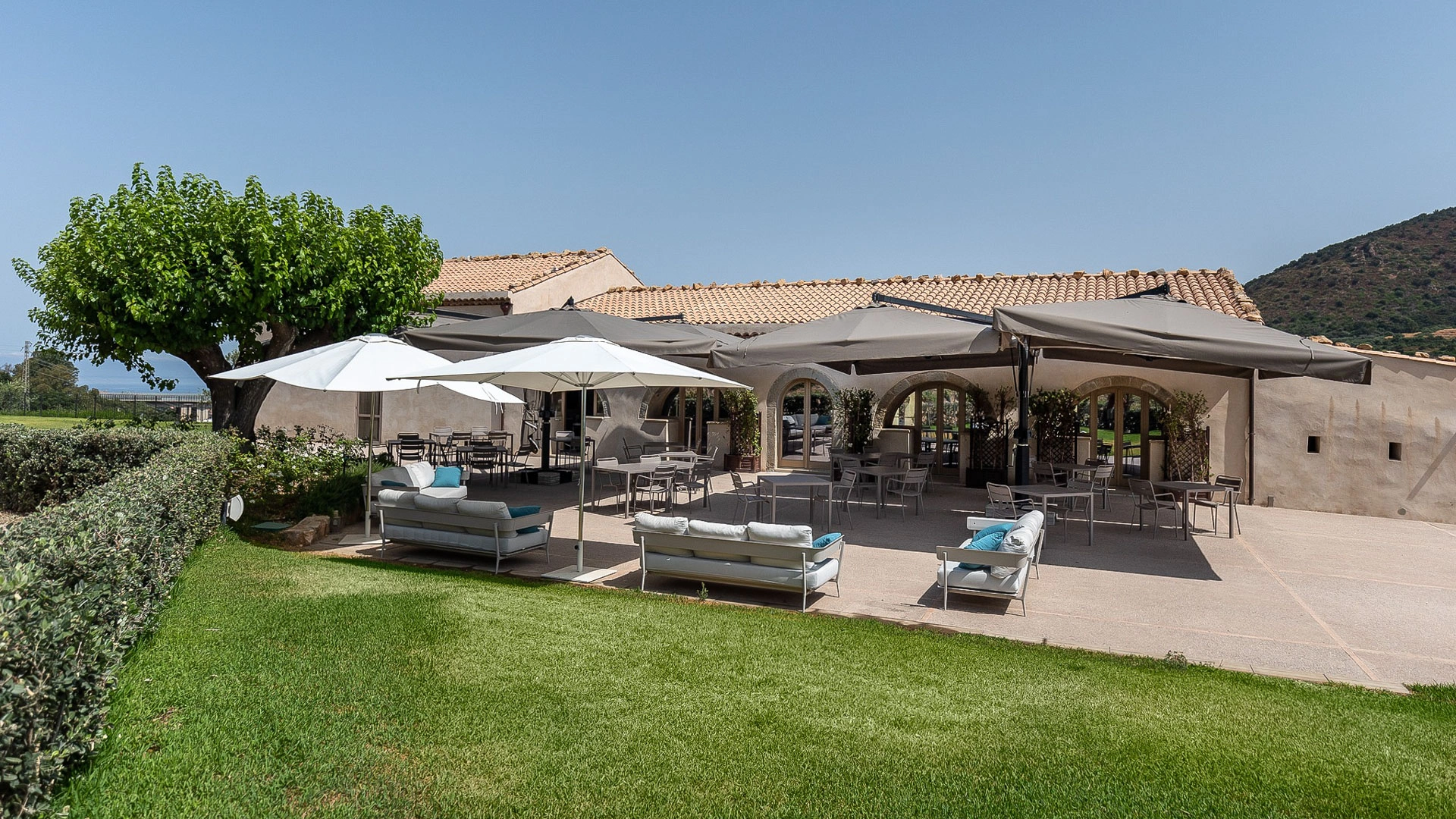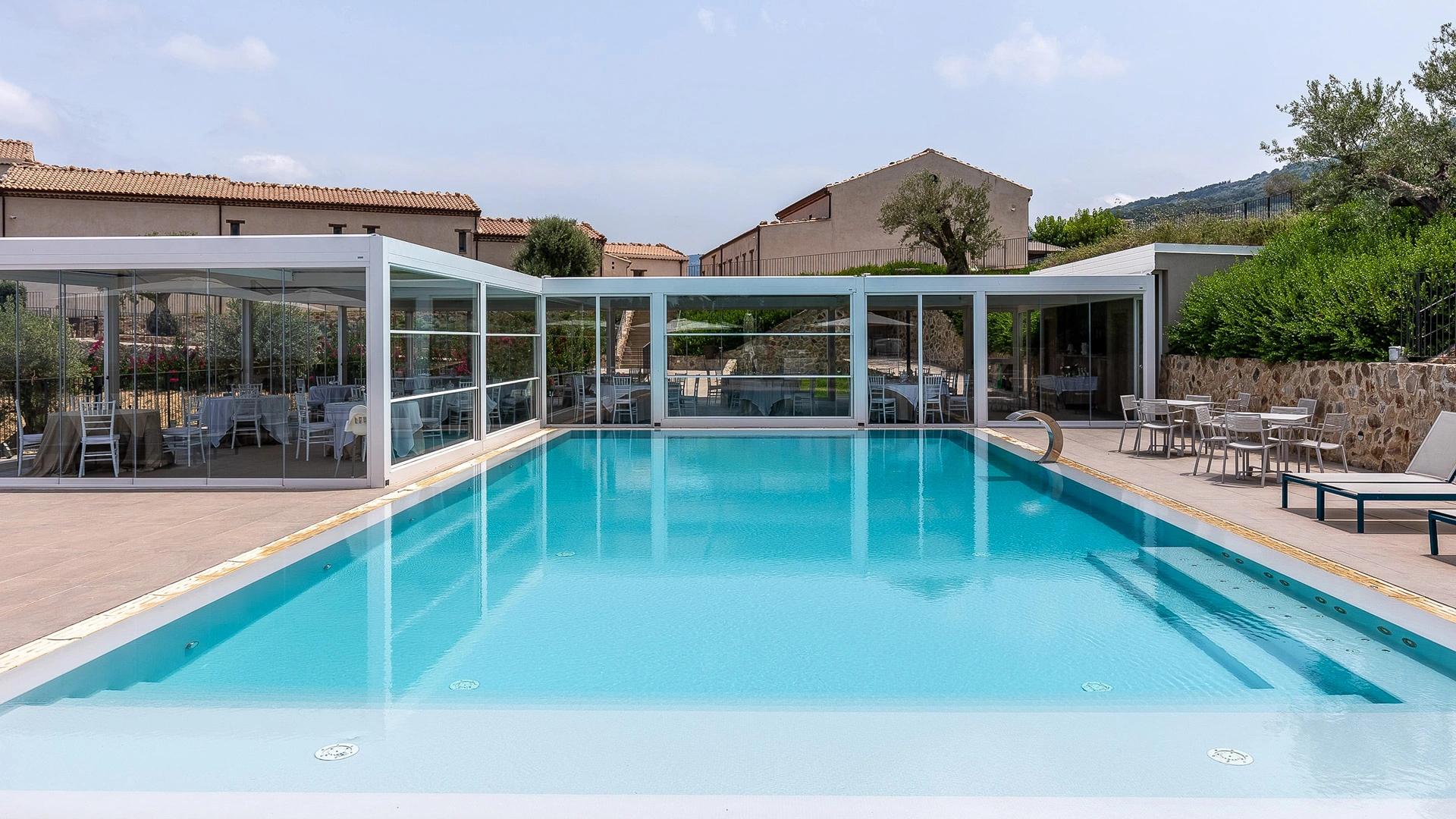 La propriété dispose d'espaces extérieurs spacieux et bien entretenus. L'espace central comprend une grande piscine rectangulaire entourée de chaises longues et d'un kiosque avec tables et chaises. Cet espace est idéal pour les événements et les réceptions.
