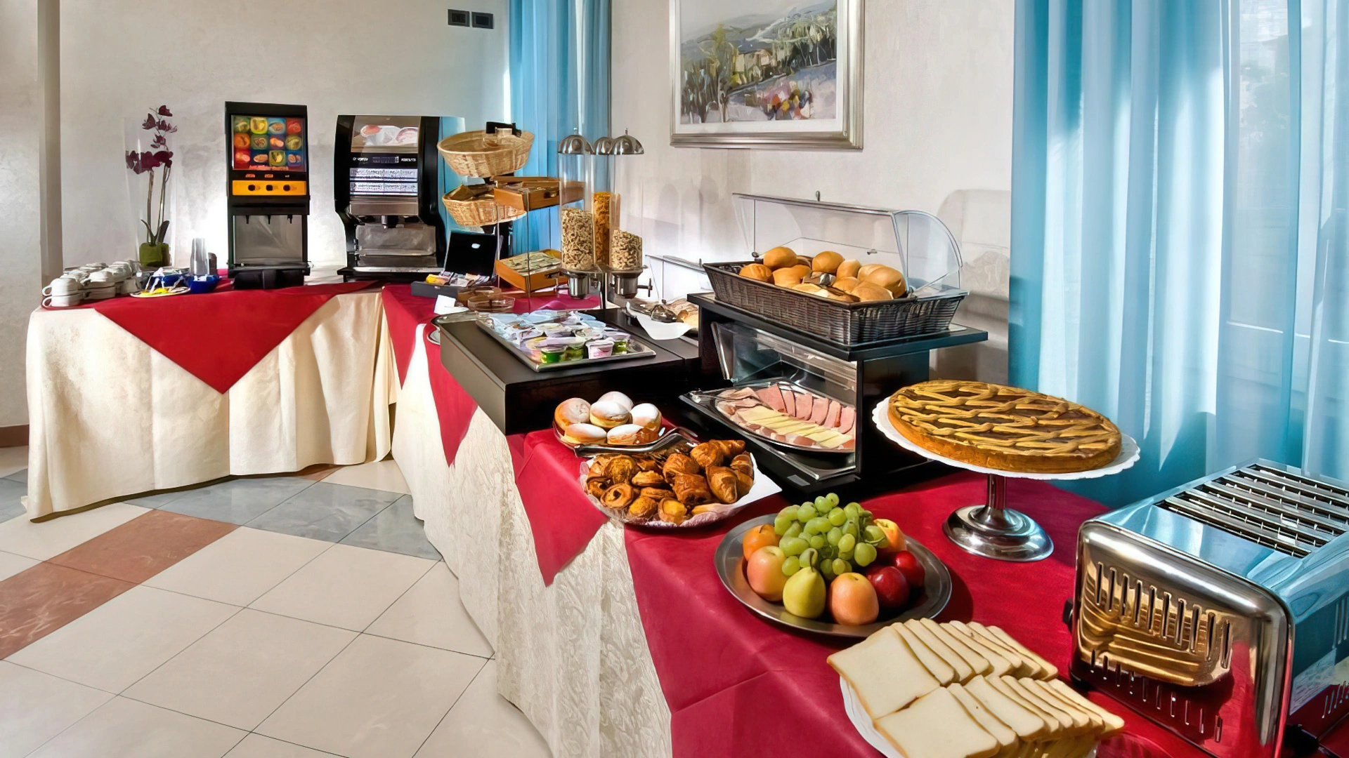 La colazione è a buffet con prodotti dolci e salati, frutta, succhi e bevande calde.