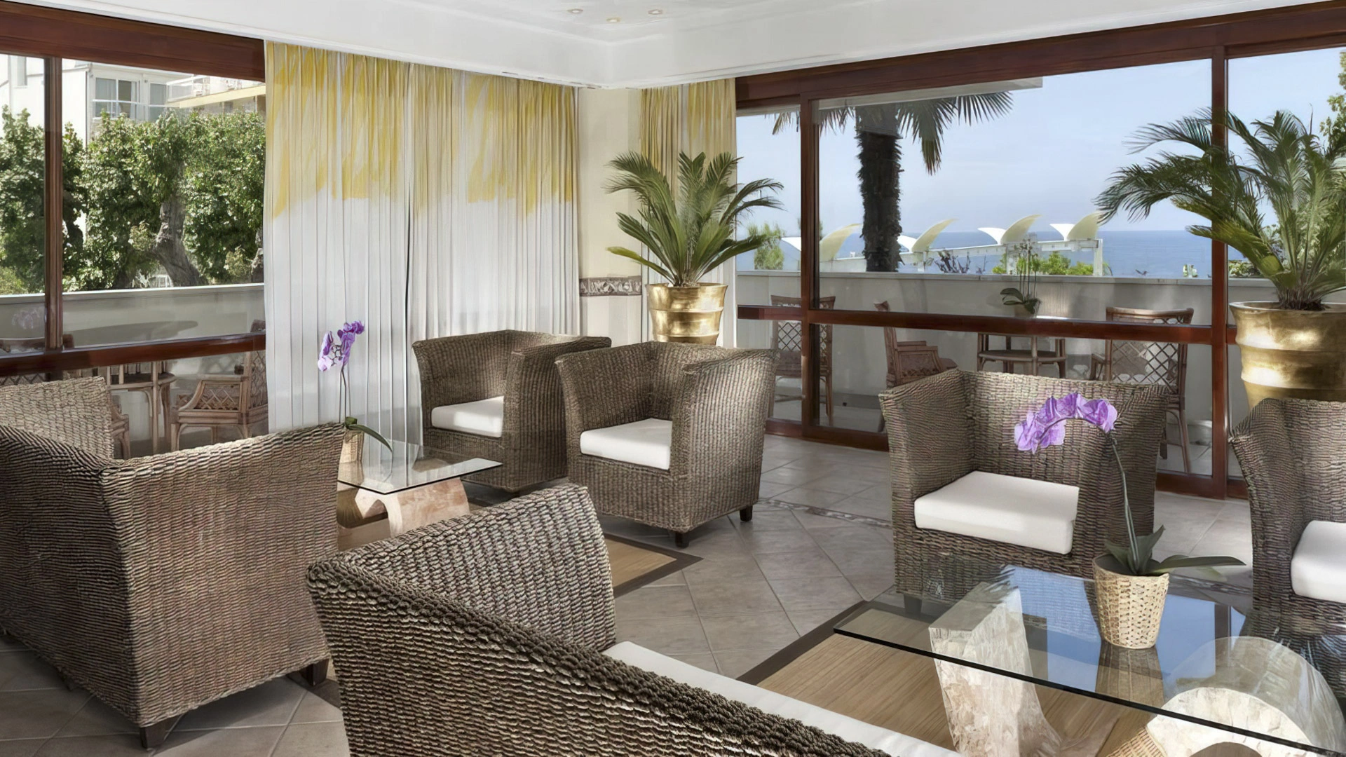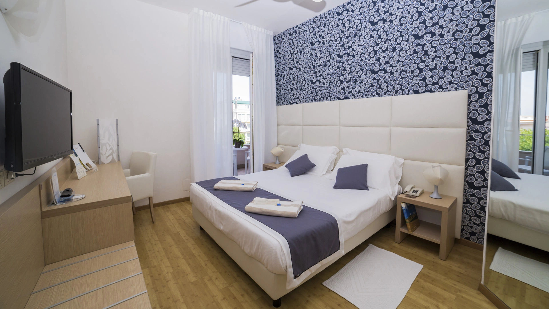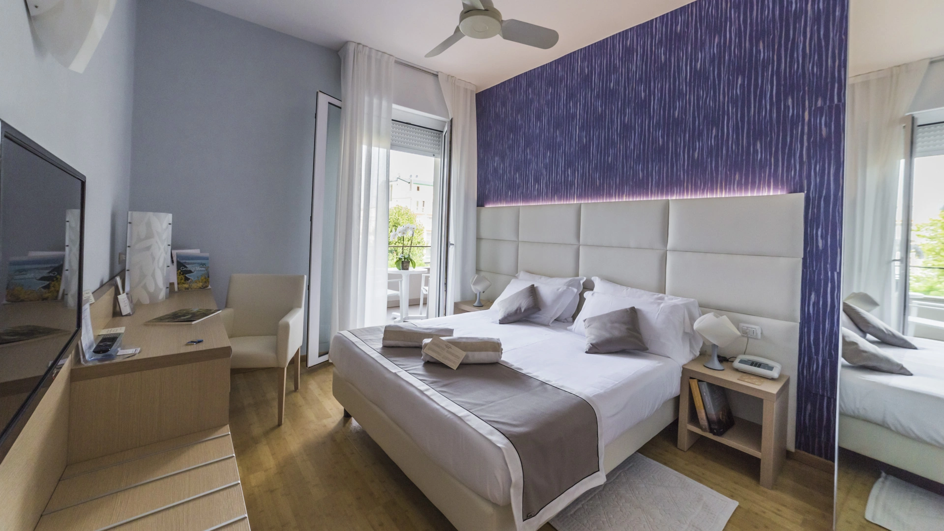 FAMILY ROOM: ampia 40 mq si affaccia sul lato piscina e si compone di due camere comunicanti con balcone vista mare laterale.Ogni camera dispone di aria condizionata, minibar, TV 32" con programmi SKY, asciugacapelli e cassaforte. Ripasso pomeridiano.