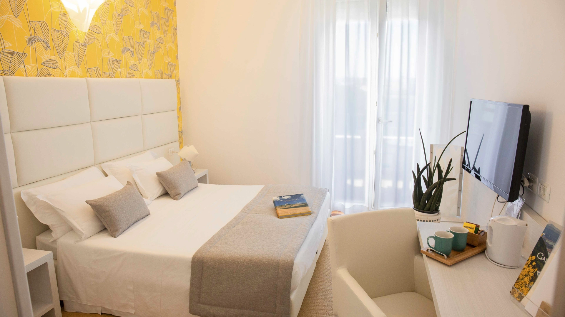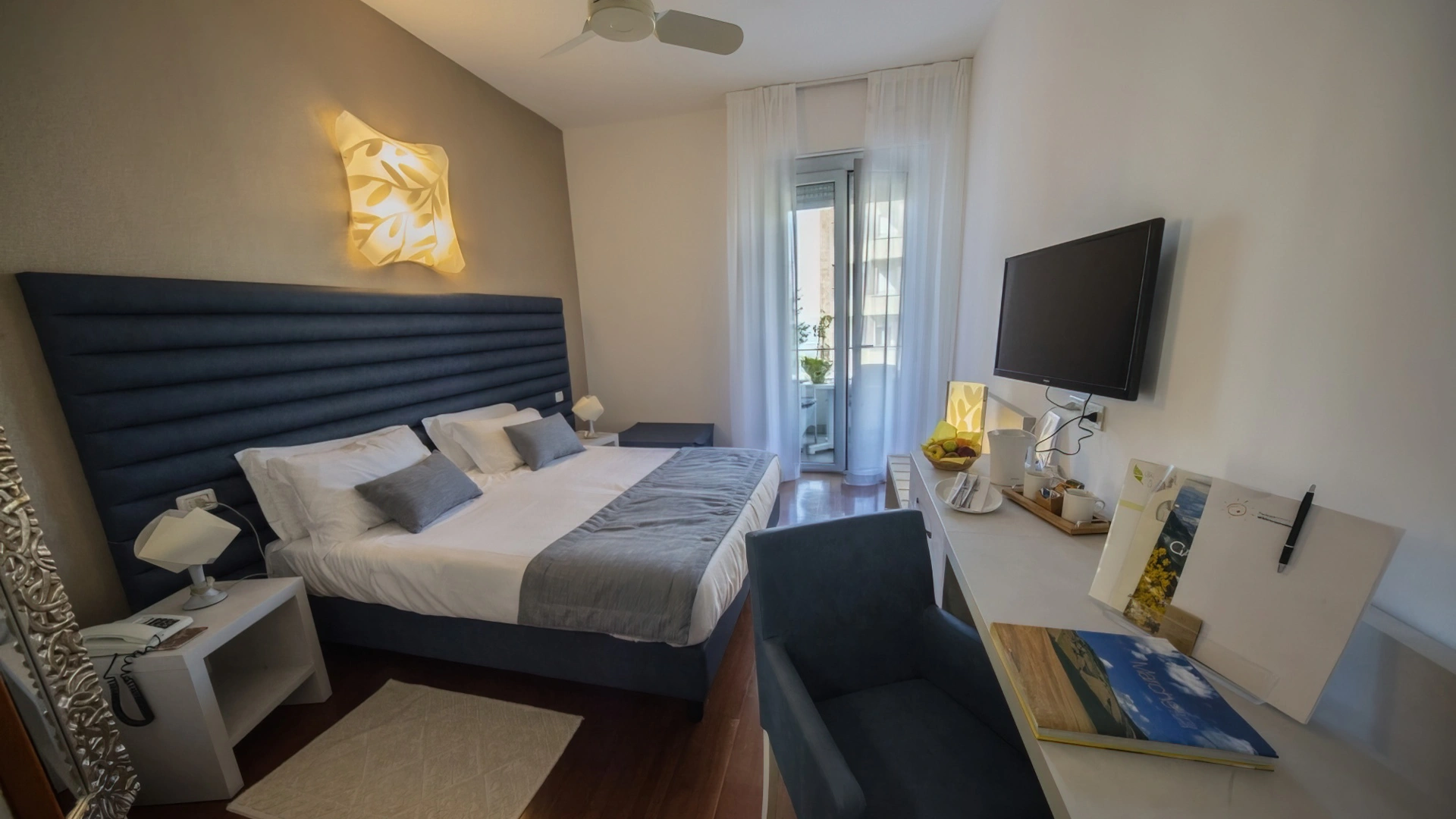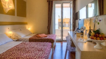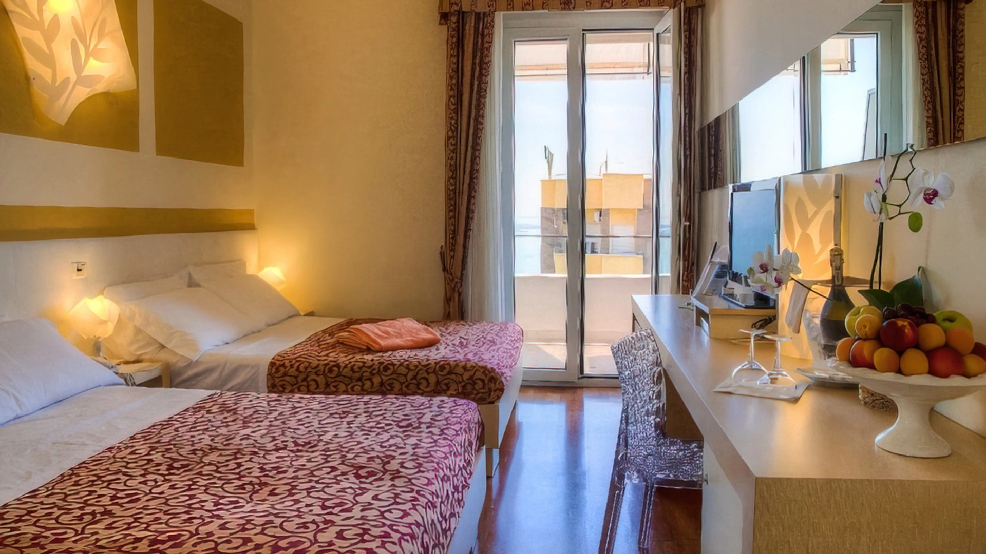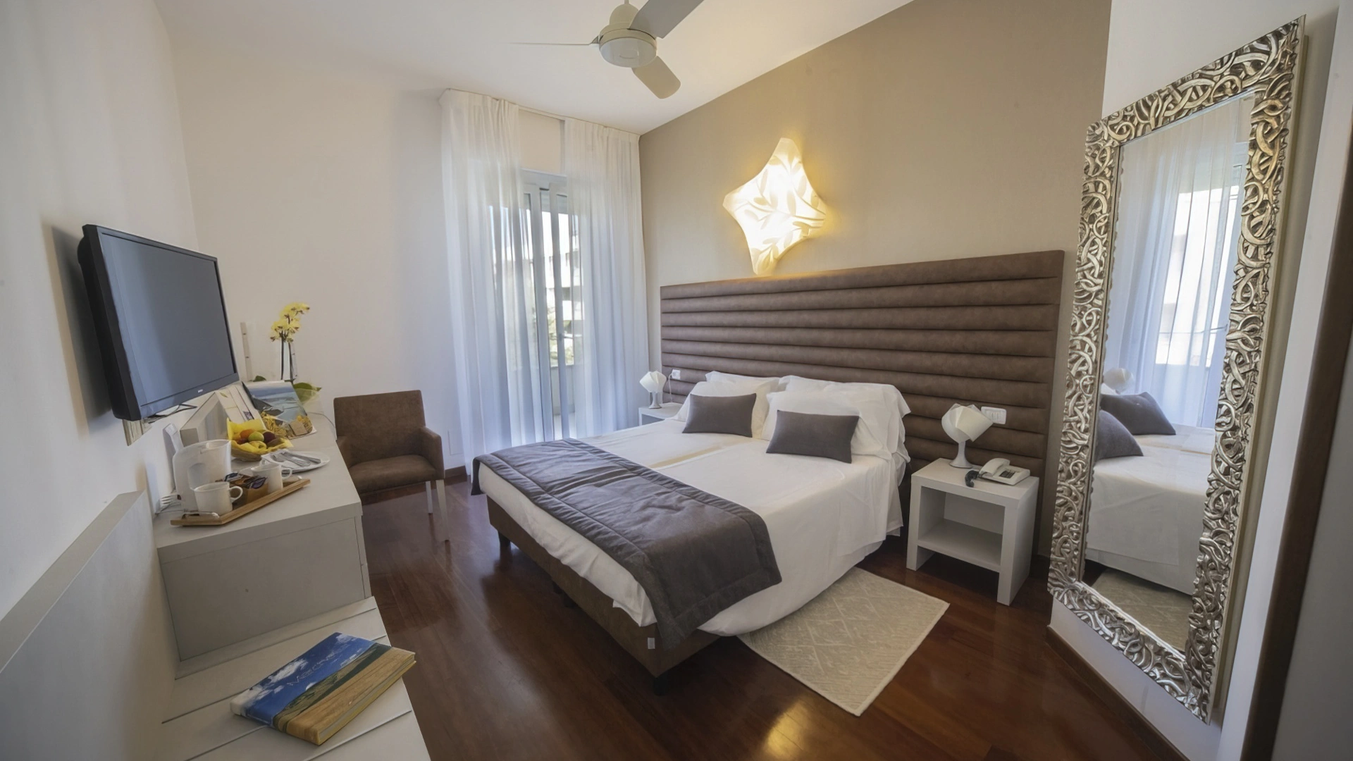 DIAMANTE: ampia 22 mq con balcone con vista mare frontale, insonorizzazione e numerosi servizi esclusivi: aria condizionata, TV 32" con programmi SKY, telefono, minibar, cassaforte e bagno con box doccia e asciugacapelli e bilancia. Include: cestino di frutta fresca e bottiglia di prosecco all'arrivo, quotidiano preferito ogni mattina (da ritirare in reception), accappatoio, telo piscina, colazione in camere su richiesta, bevande analcoliche dal minibar, un piccolo angolo per la preparazione di tè e caffè, ripasso pomeridiano. City e-bike a disposizione (su prenotazione).