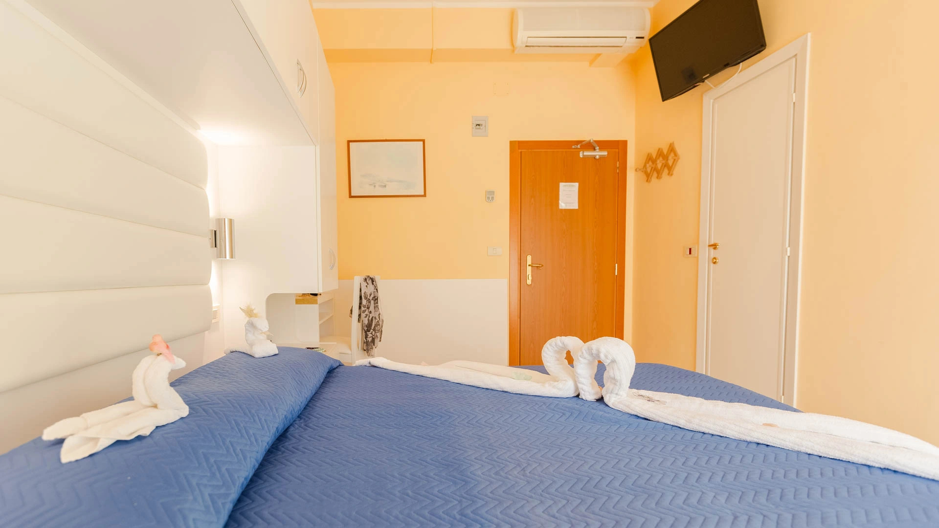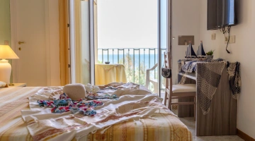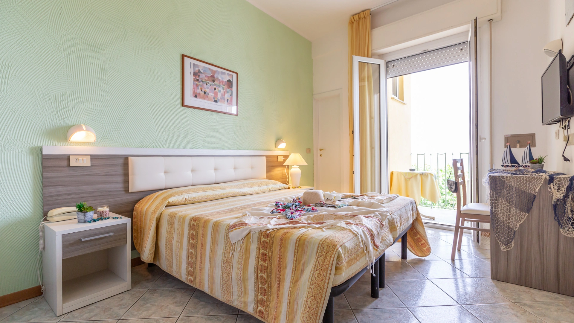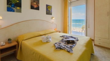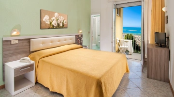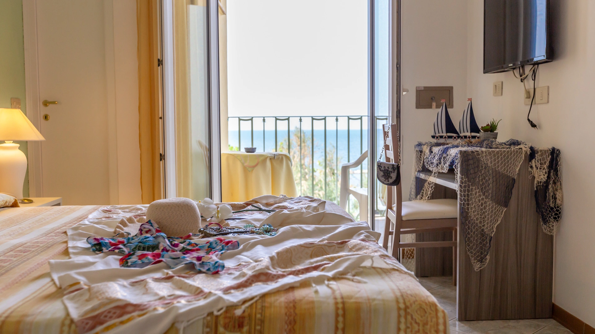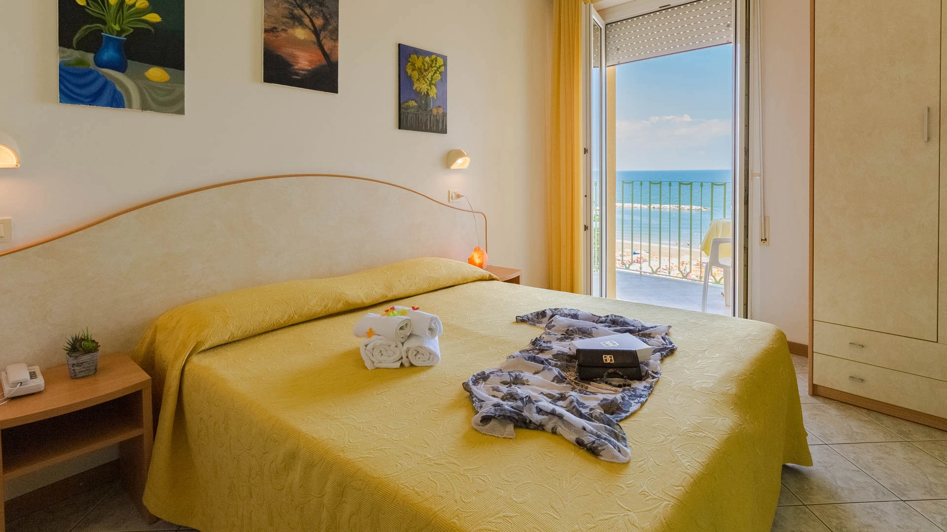 Le camere hanno balcone vista mare (frontale o laterale), aria condizionata, Wi-Fi fibra 100 Mbit/s, cassaforte, telefono, bagno con phon e box doccia, TV digitale terrestre e satellitare; frigobar non fornito disponibile su richiesta, a pagamento. La pulizia avviene a cadenza giornaliera.