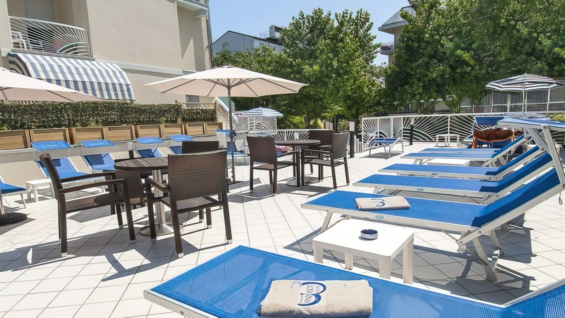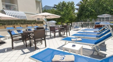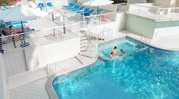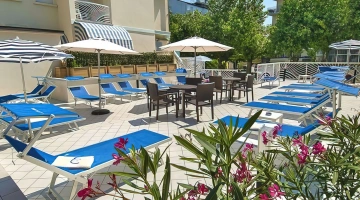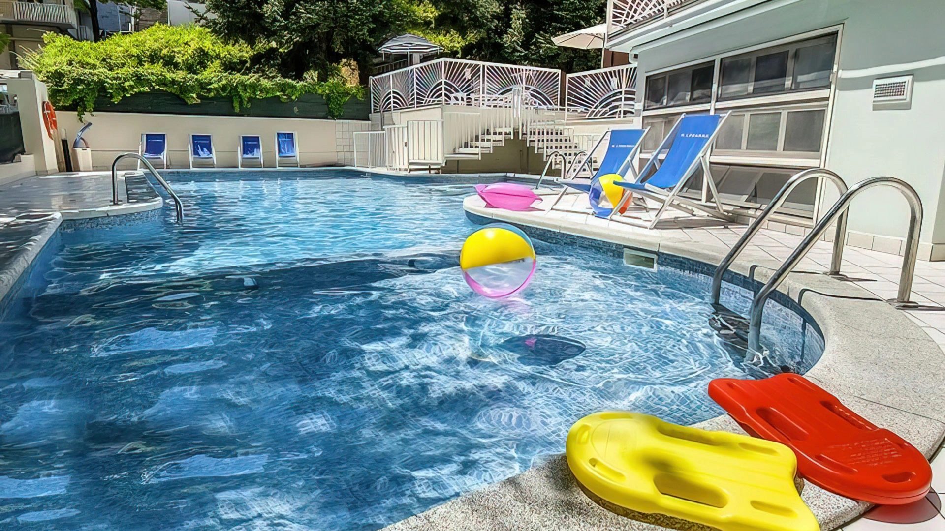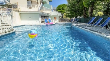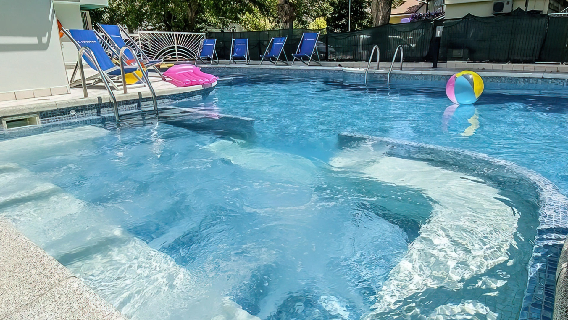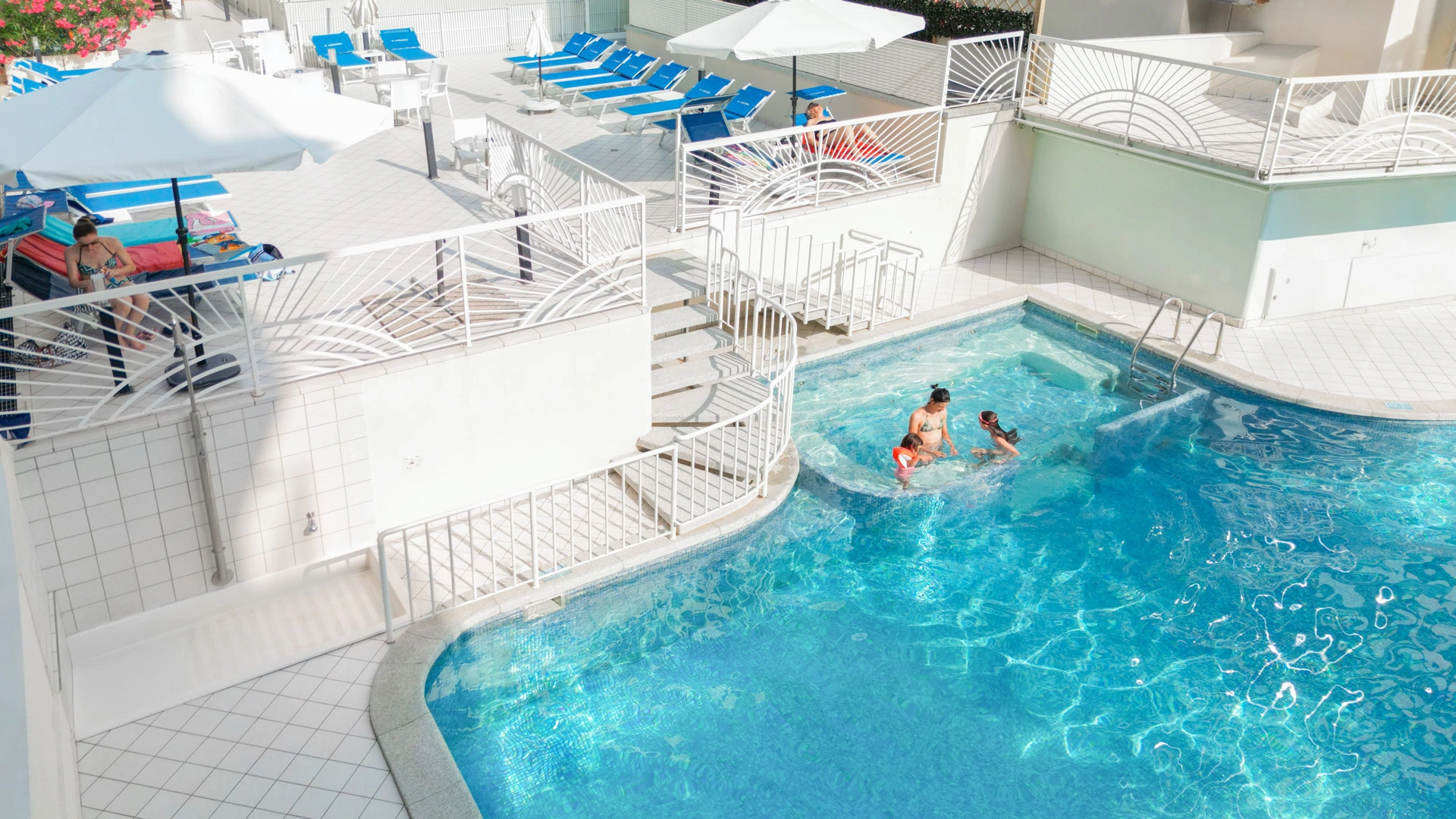 Al piano rialzato è presente una piscina riscaldata dotata di area con acqua bassa, piscina per i più piccoli e zona con getti idromassaggio. Nell’area adiacente alla vasca è presente un solarium attrezzato con lettini e ombrelloni.
