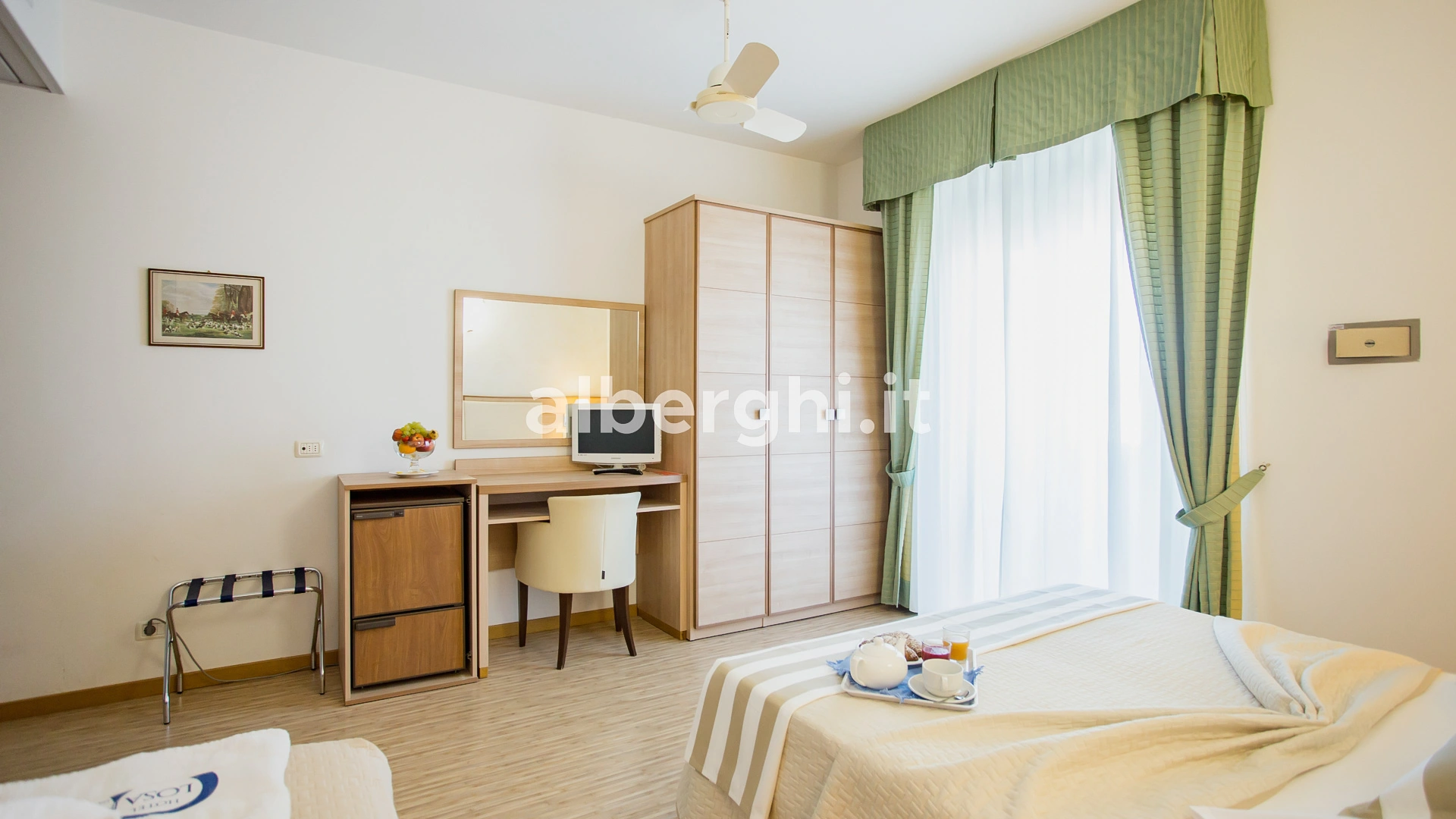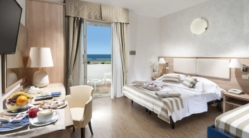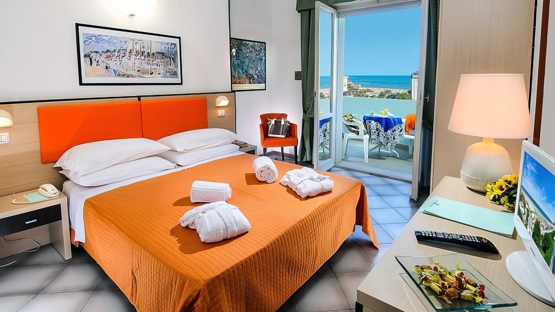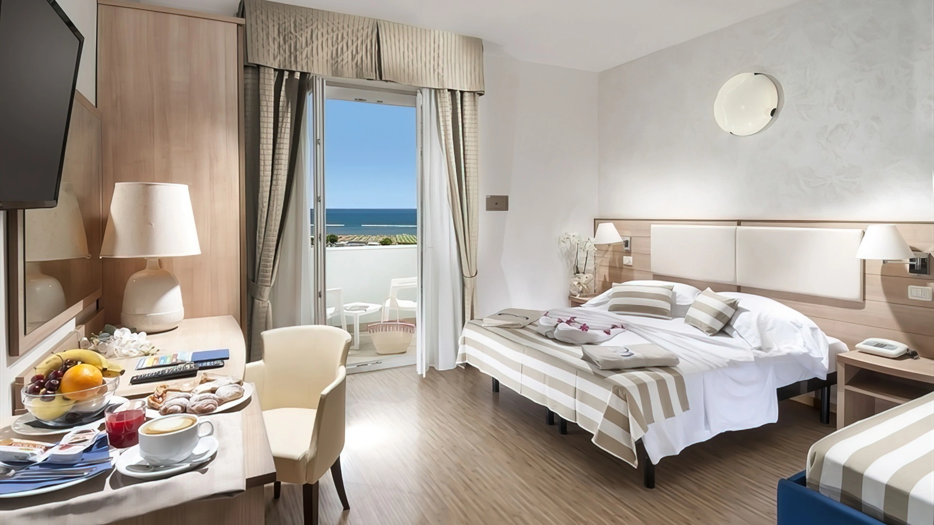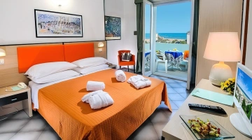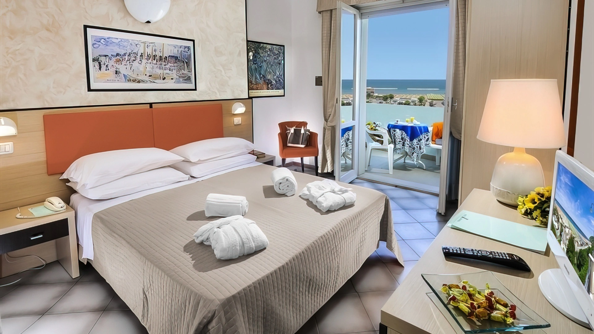 Le stanze dispongono di balcone, cassaforte, TV sat, telefono diretto, aria condizionata, connessione Wi-Fi fibra 100 Mbit/s, minifrigo, bagno privato con box doccia, phon e set di cortesia all'arrivo. Con supplemento: servizio in camera e camera lato mare.