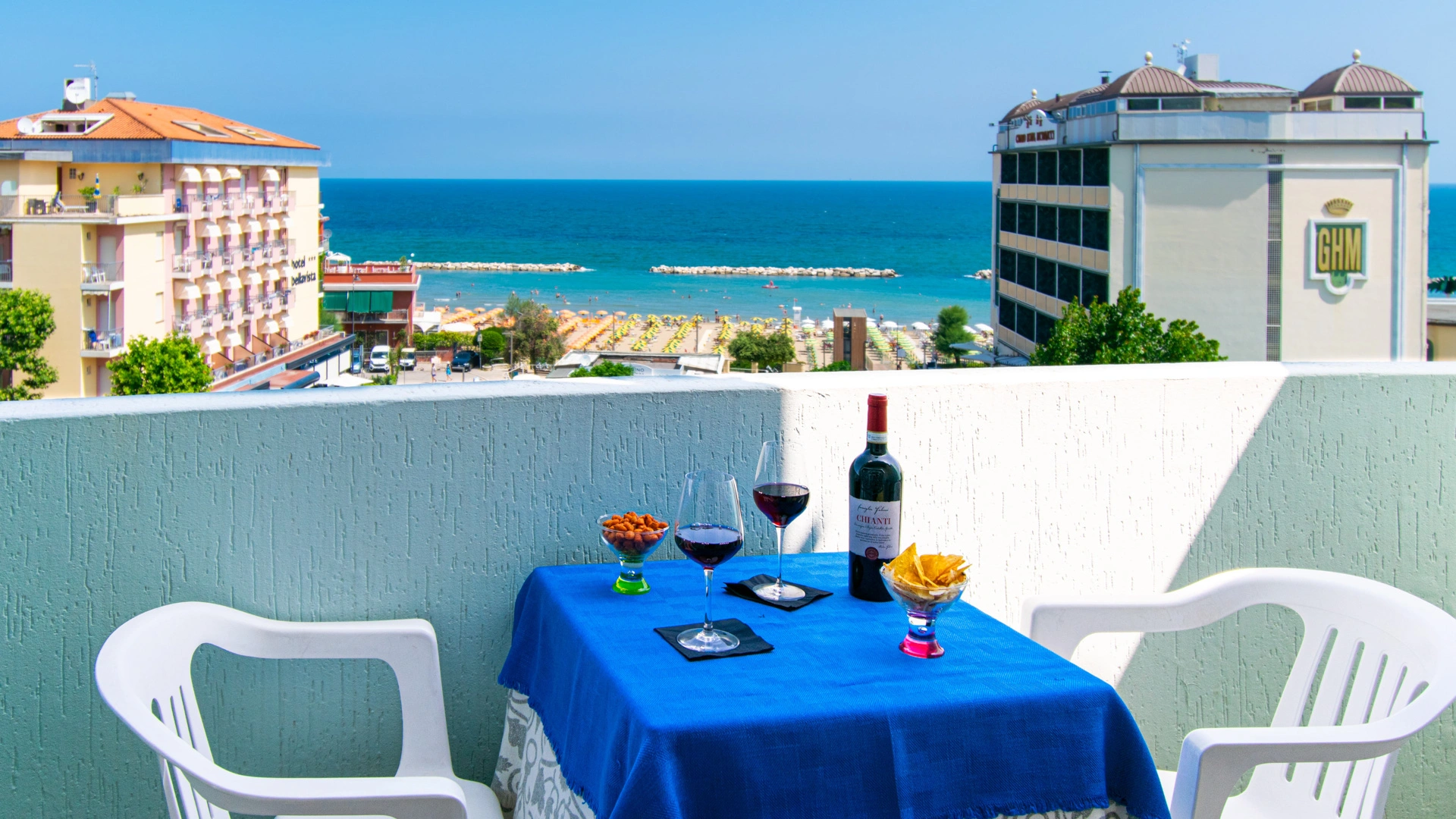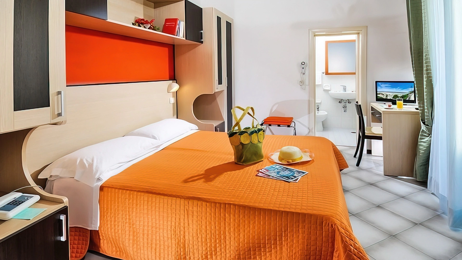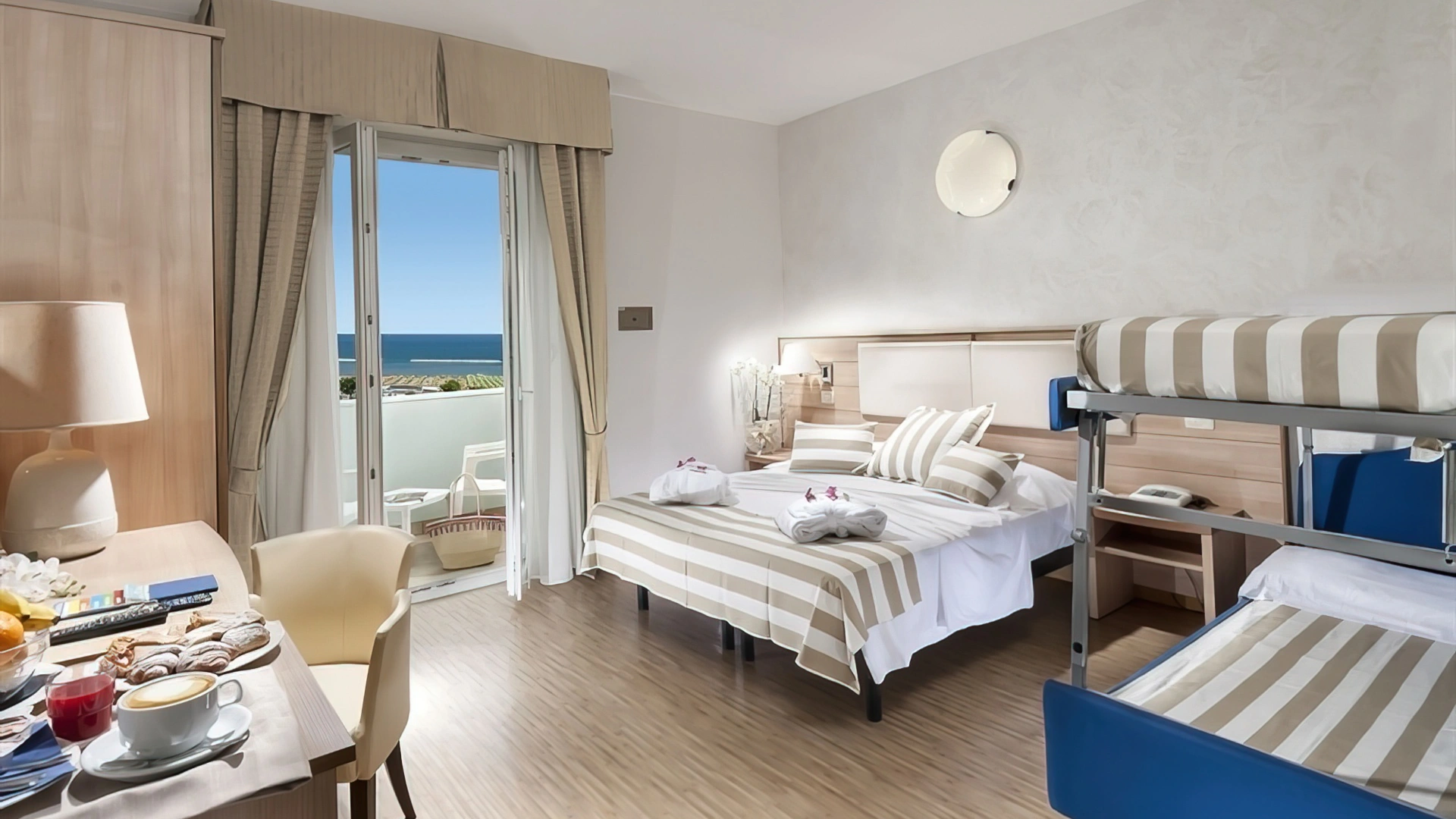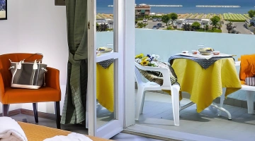 Le stanze dispongono di balcone, cassaforte, TV sat, telefono diretto, aria condizionata, connessione Wi-Fi fibra 100 Mbit/s, minifrigo, bagno privato con box doccia, phon e set di cortesia all'arrivo. Con supplemento: servizio in camera e camera lato mare.