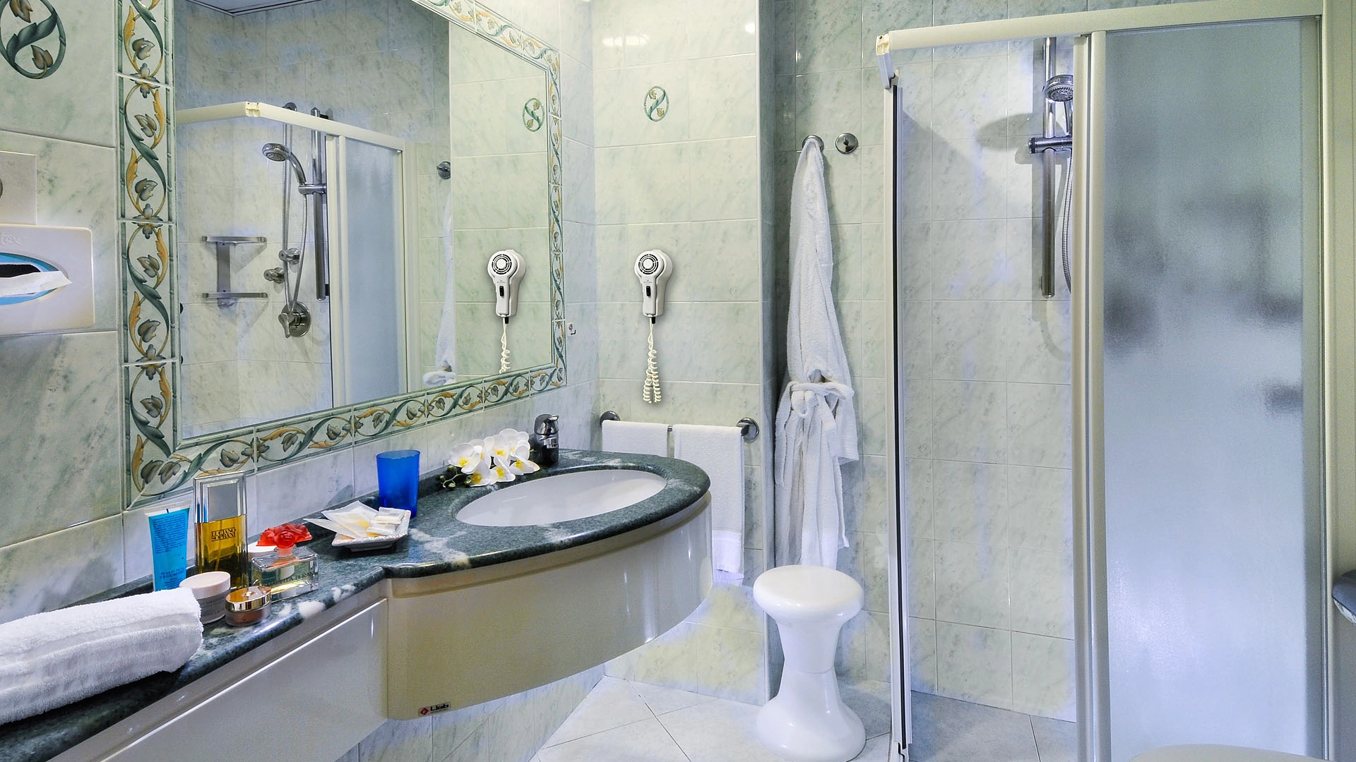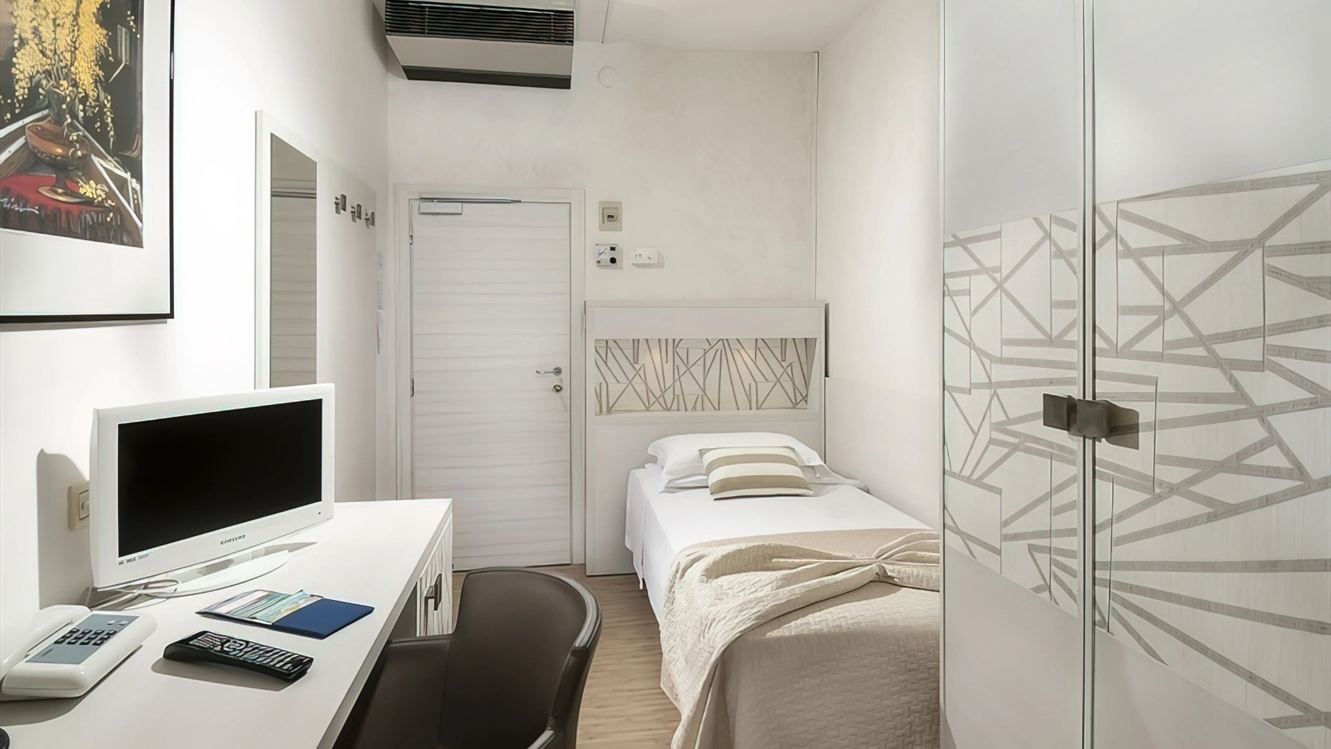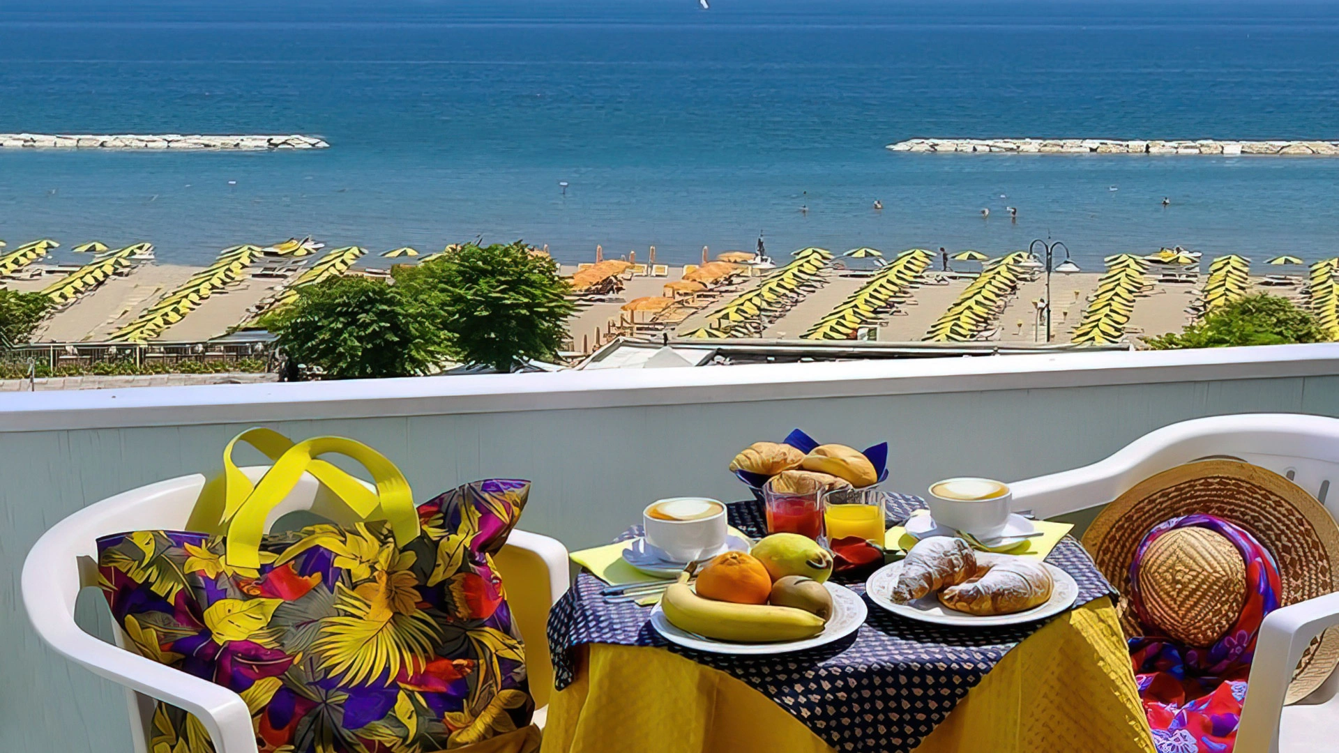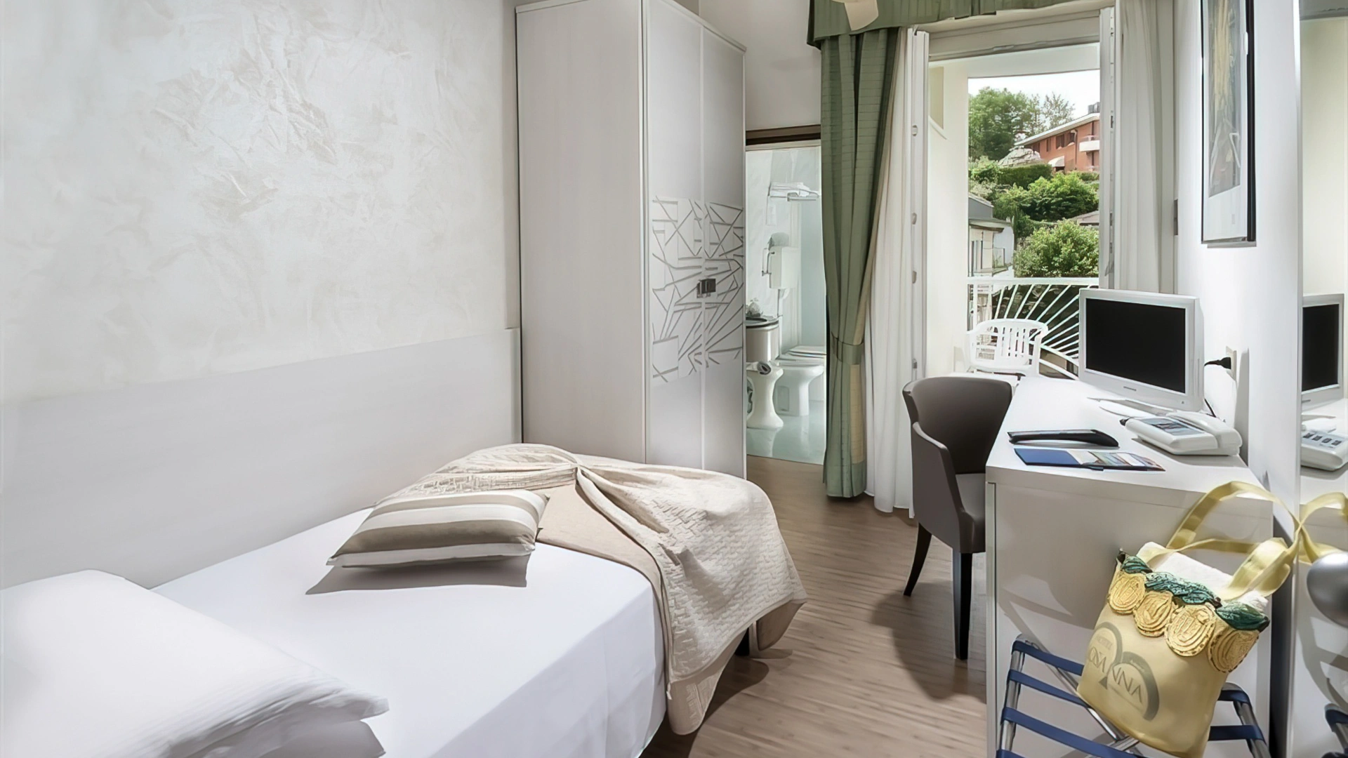 Le stanze dispongono di balcone, cassaforte, TV sat, telefono diretto, aria condizionata, connessione Wi-Fi fibra 100 Mbit/s, minifrigo, bagno privato con box doccia, phon e set di cortesia all'arrivo. Con supplemento: servizio in camera e camera lato mare.