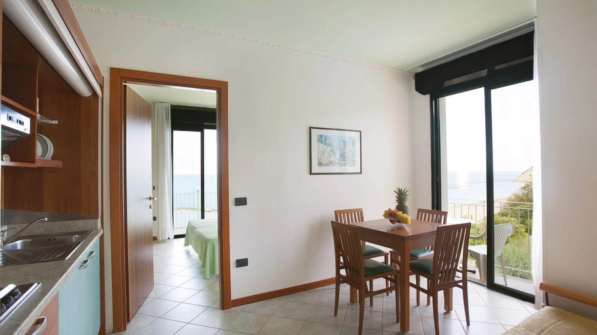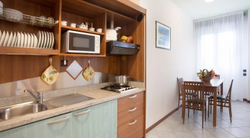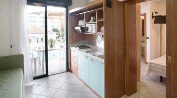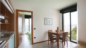 Sono disponibili bilocali con o senza vista mare, dotati di angolo cucina attrezzato, bagno con box doccia e phon, lavatrice, ferro da stiro su richiesta, area stendibiancheria oltre a tutti i servizi presenti nelle camere.