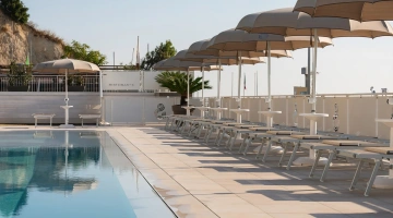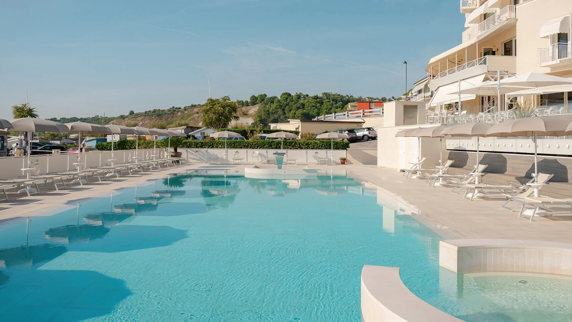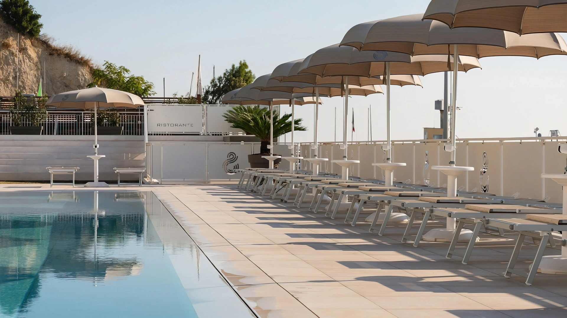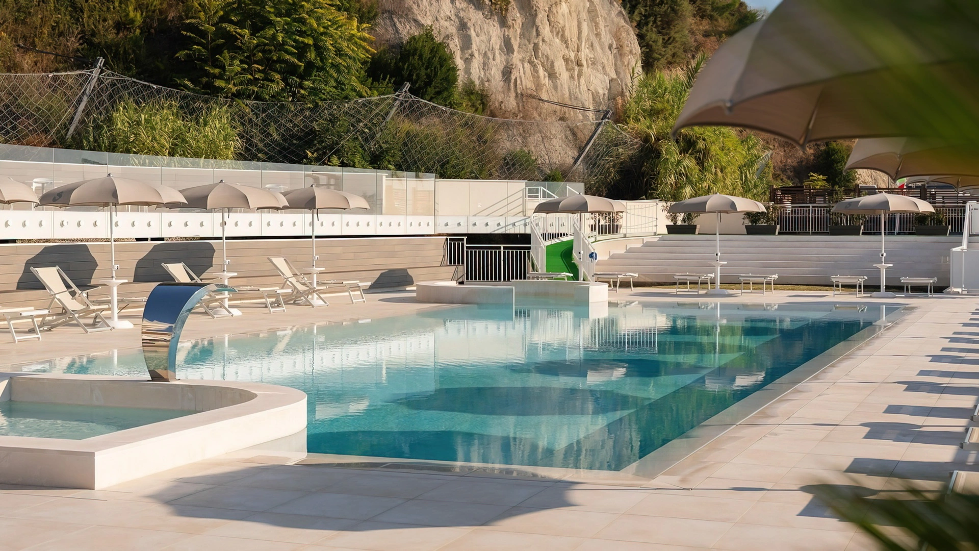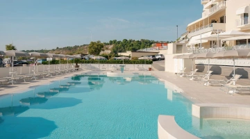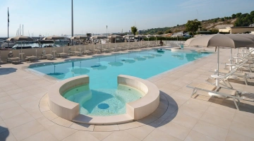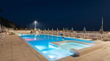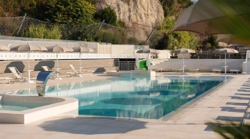 Nell'ampio spazio esterno arredato è collocata una grande piscina stagionale di 200 mq e profonda 140 cm, corredata da angolo idromassaggio e getti d'acqua massaggianti. Collegata alla vasca principale anche una vasca secondaria più piccola e profonda 35 cm, dedicata ai bambini. Intorno sono a disposizione ombrelloni, lettini prendisole, docce e cabine spogliatoio.