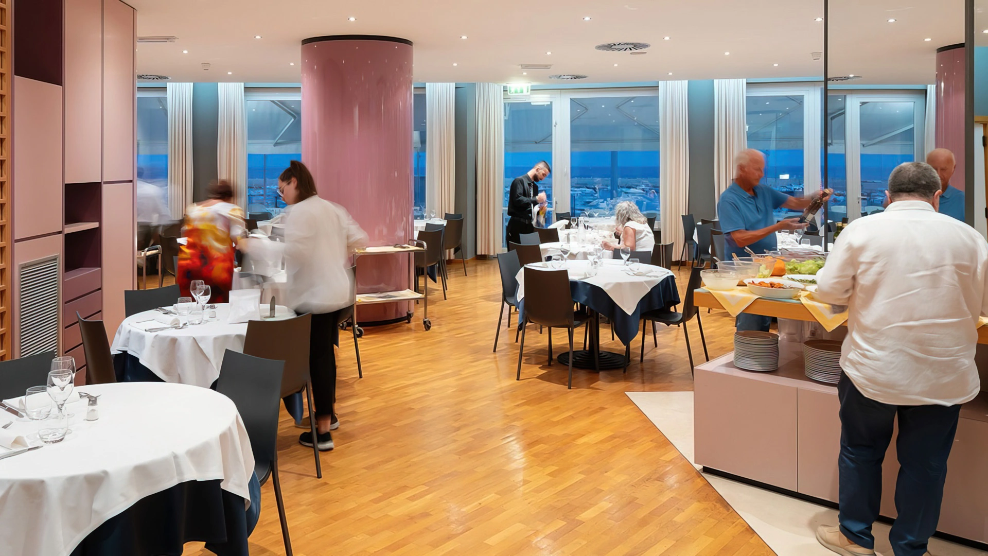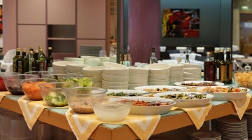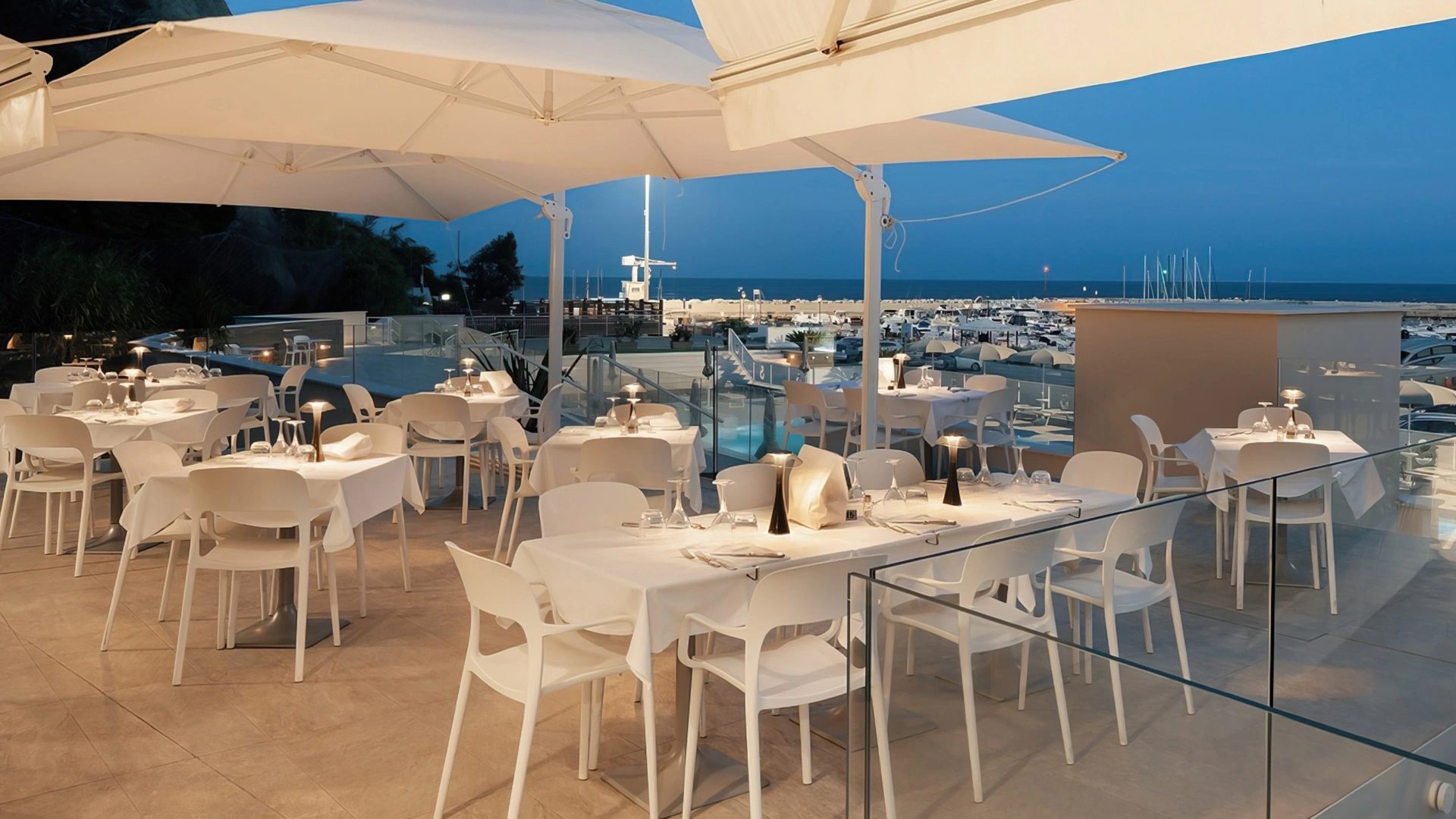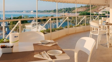 La prima colazione, inclusa nel prezzo, viene servita a buffet e prevede prodotti dolci e salati come marmellate, torte di produzione interna, macedonie, affettati, yogurt. In loco è presente un ristorante con terrazza vista mare che propone piatti tipici del territorio principalmente a base di pesce. Gli ospiti possono scegliere tra trattamento di mezza pensione o pensione completa con menu fissi a 3 scelte e buffet di contorni e verdure.