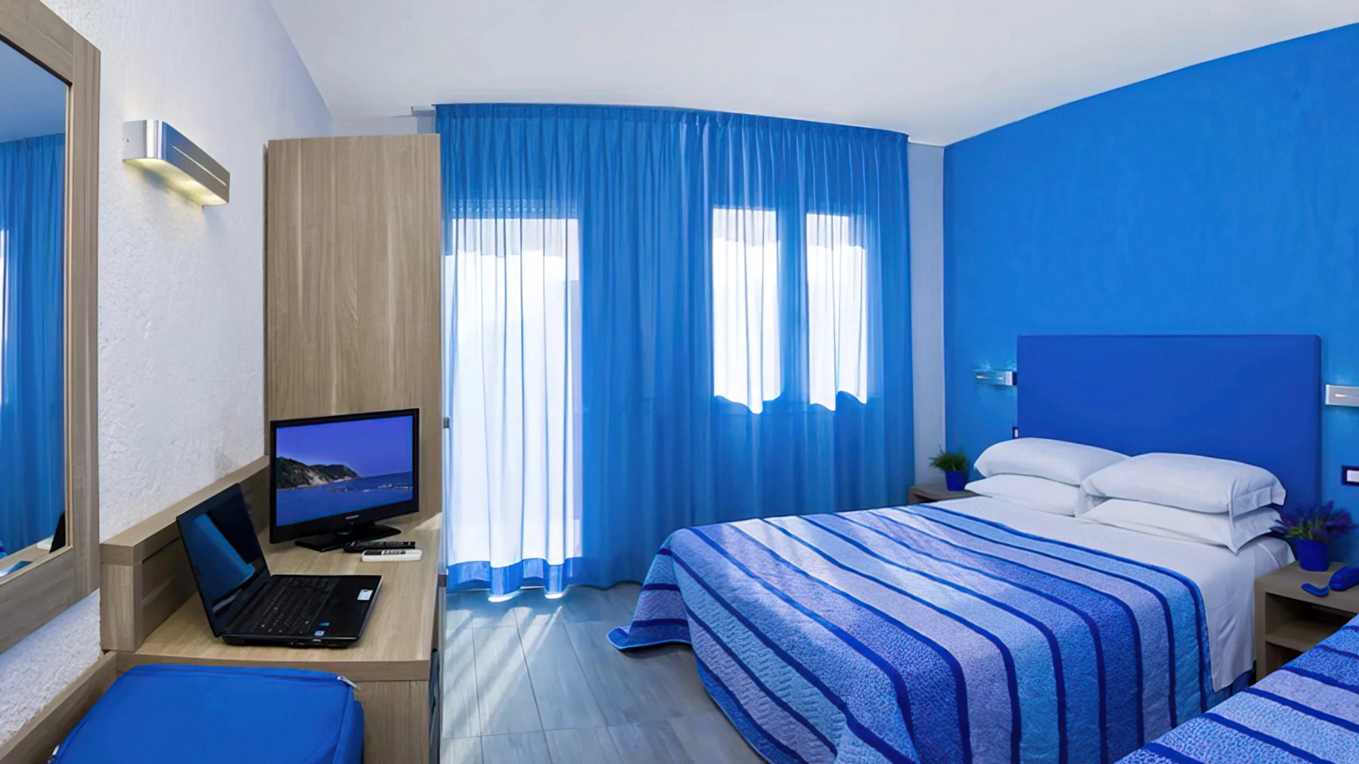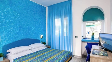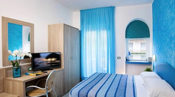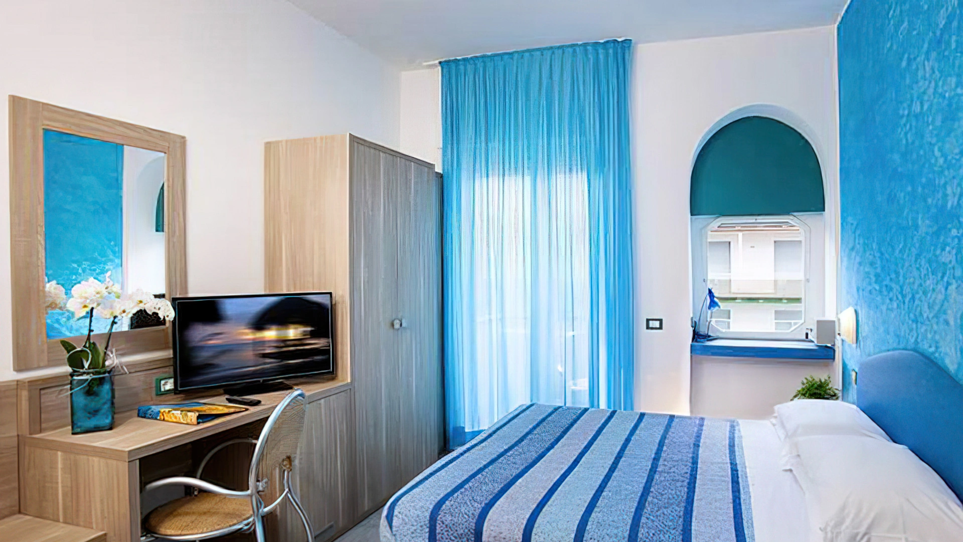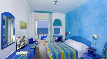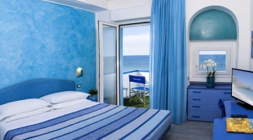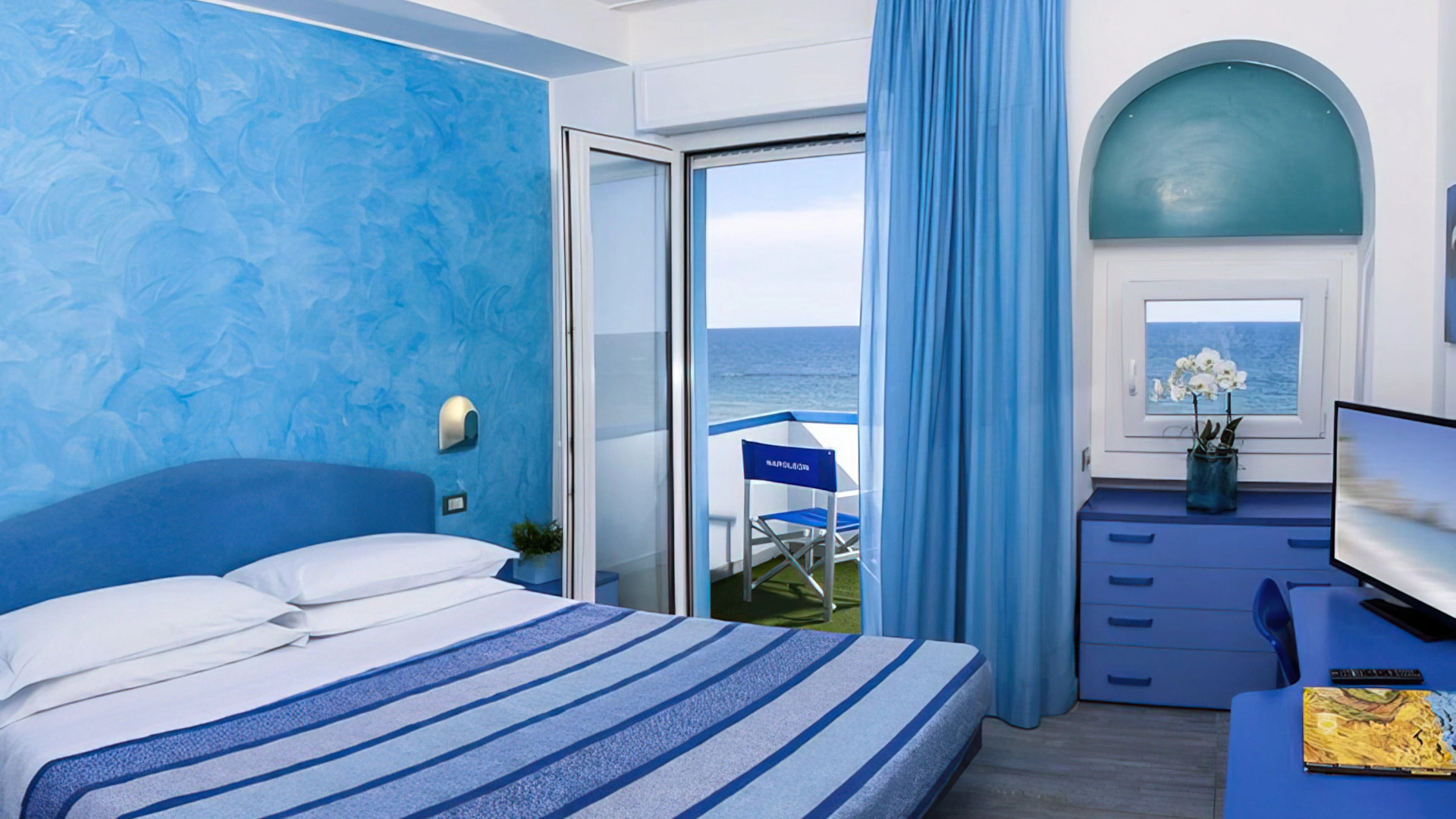 Le camere sono dotate di balcone, vista mare, aria condizionata, Wi-Fi fibra, TV, cassaforte, telefono, frigobar (rifornito con acqua), bagno con asciugacapelli e box doccia. Possibilità di room service e colazione in camera a pagamento.
