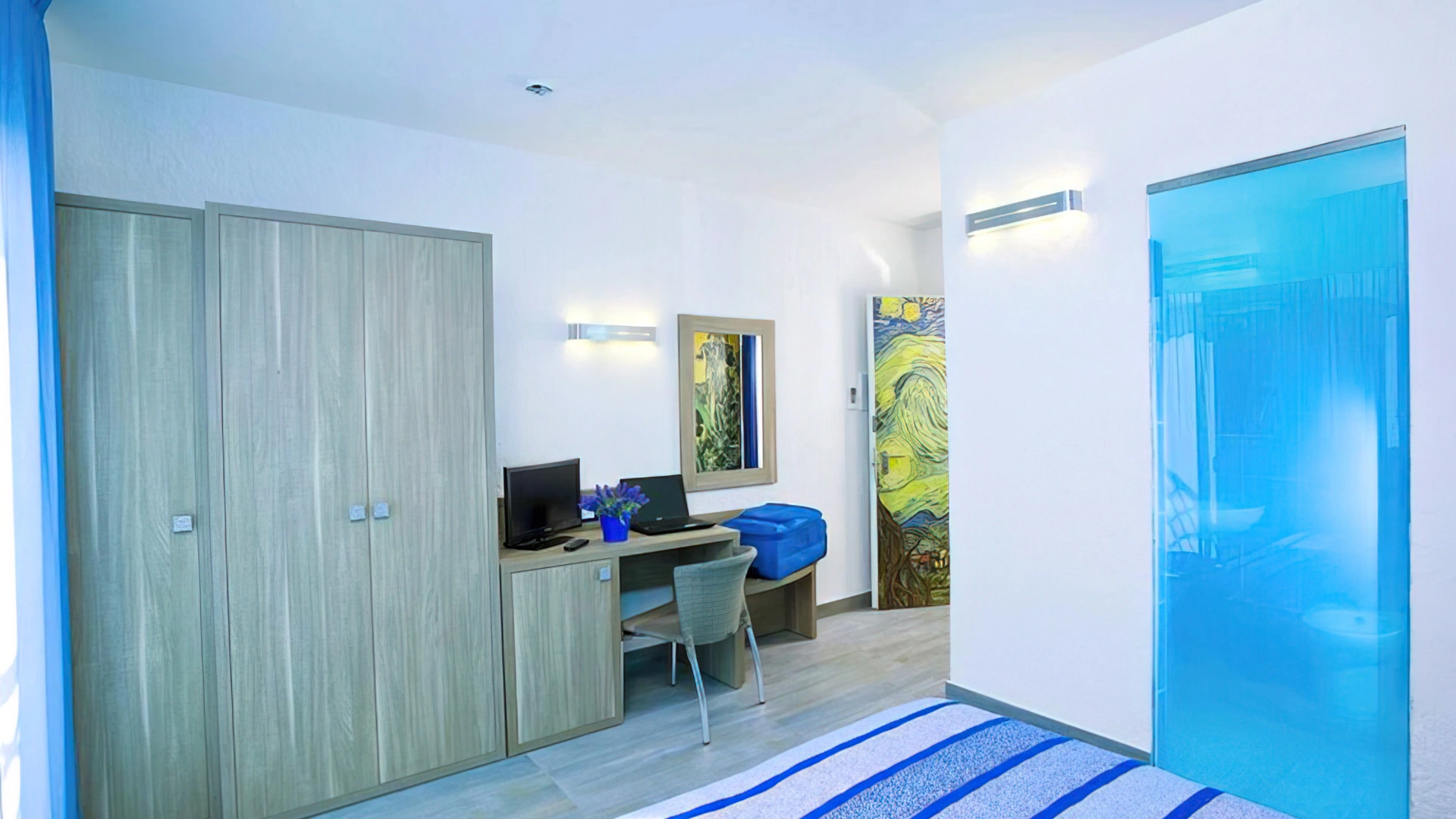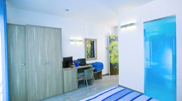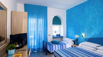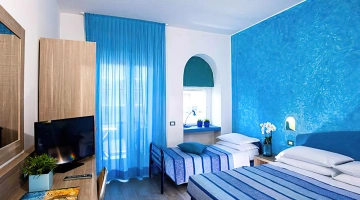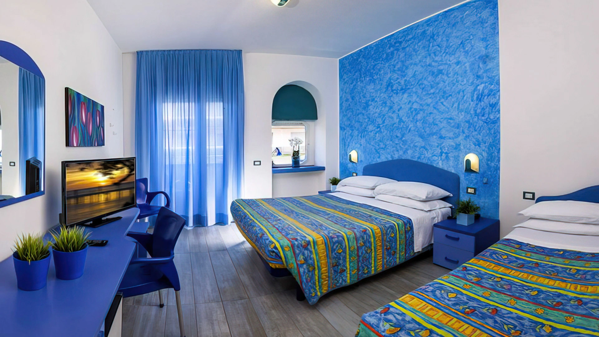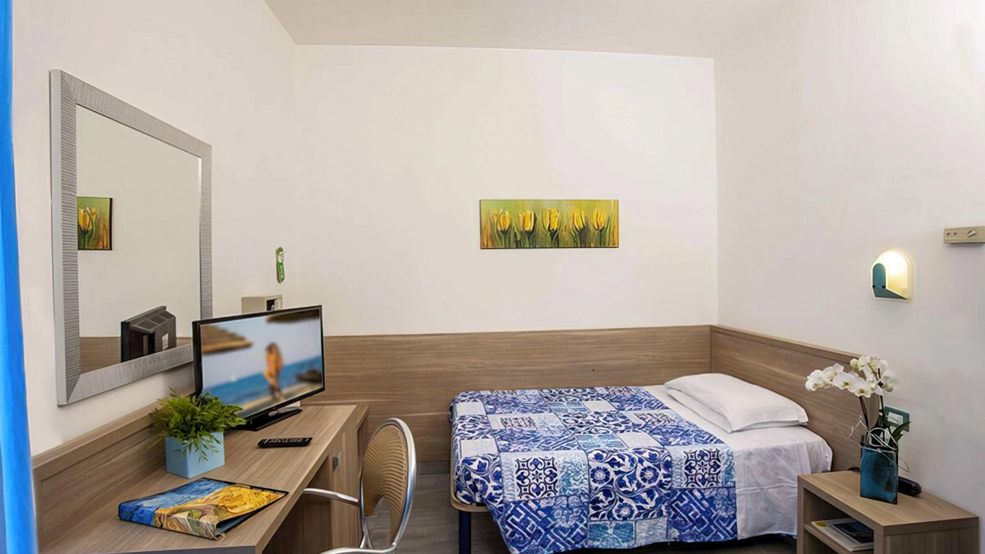 Le camere sono dotate di balcone, vista mare, aria condizionata, Wi-Fi fibra, TV, cassaforte, telefono, frigobar (rifornito con acqua), bagno con asciugacapelli e box doccia. Possibilità di room service e colazione in camera a pagamento.