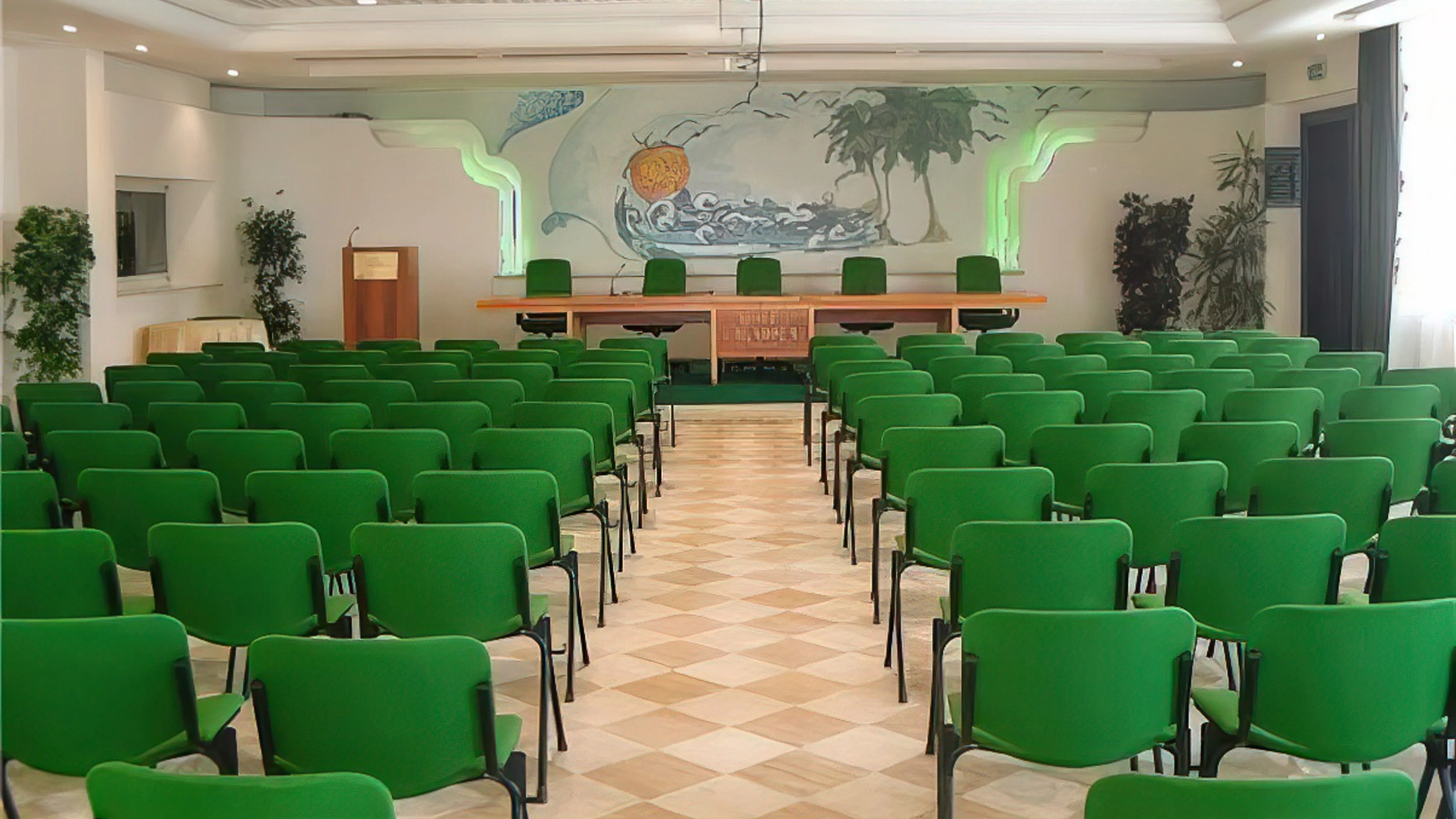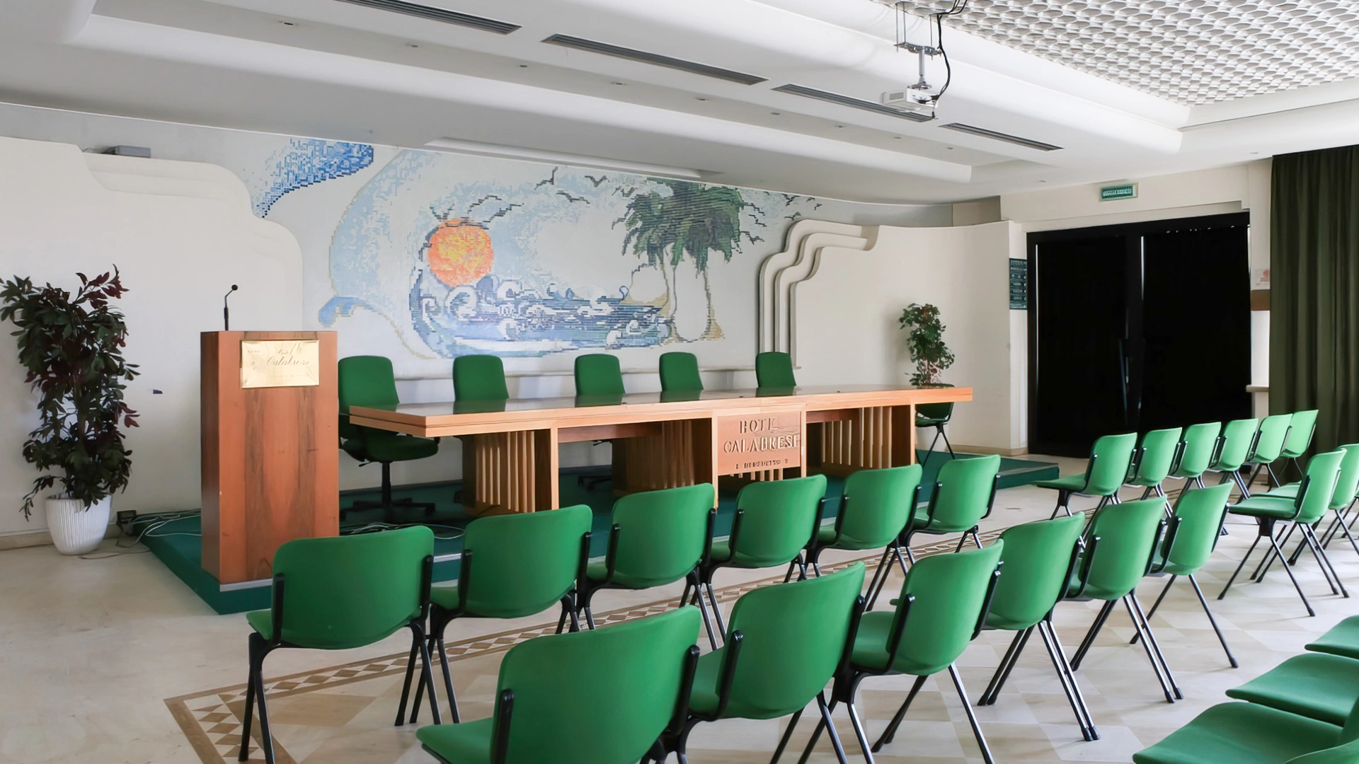 Business: conference center dotato di attrezzature audiovisive e tavolo relatori.