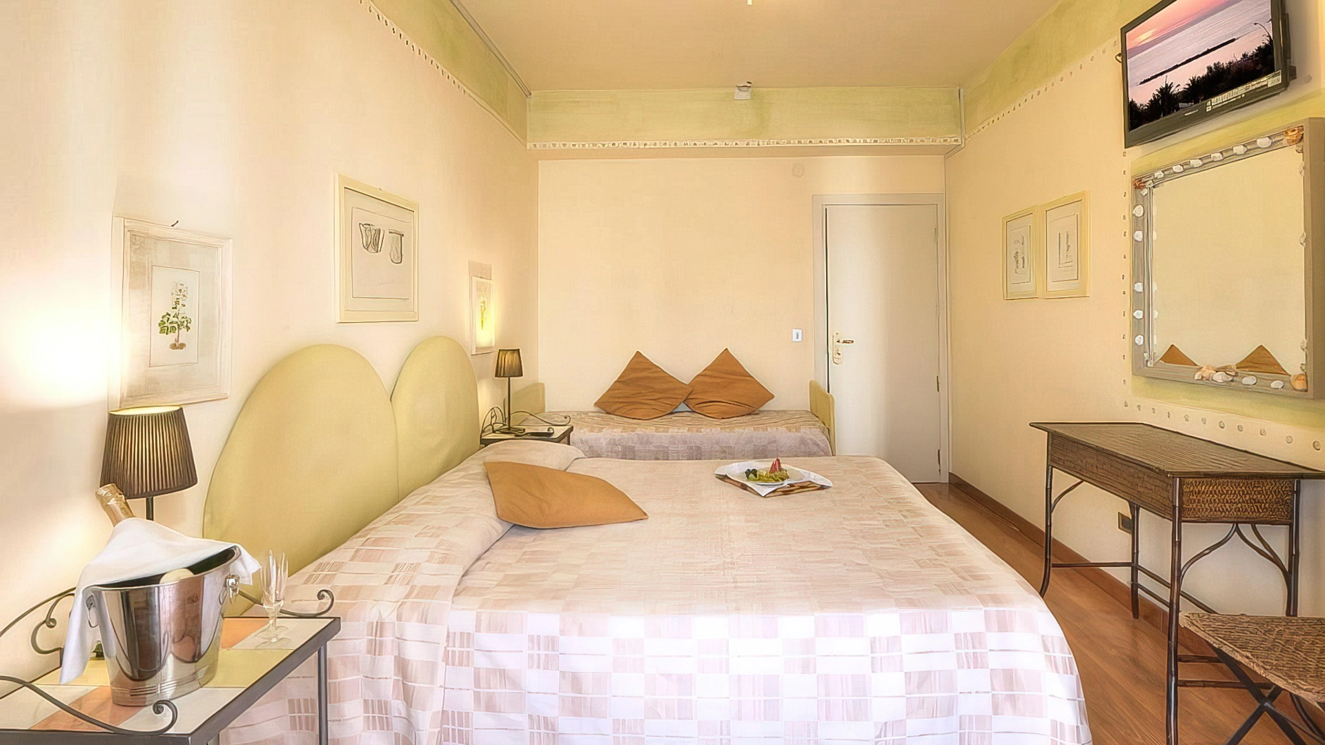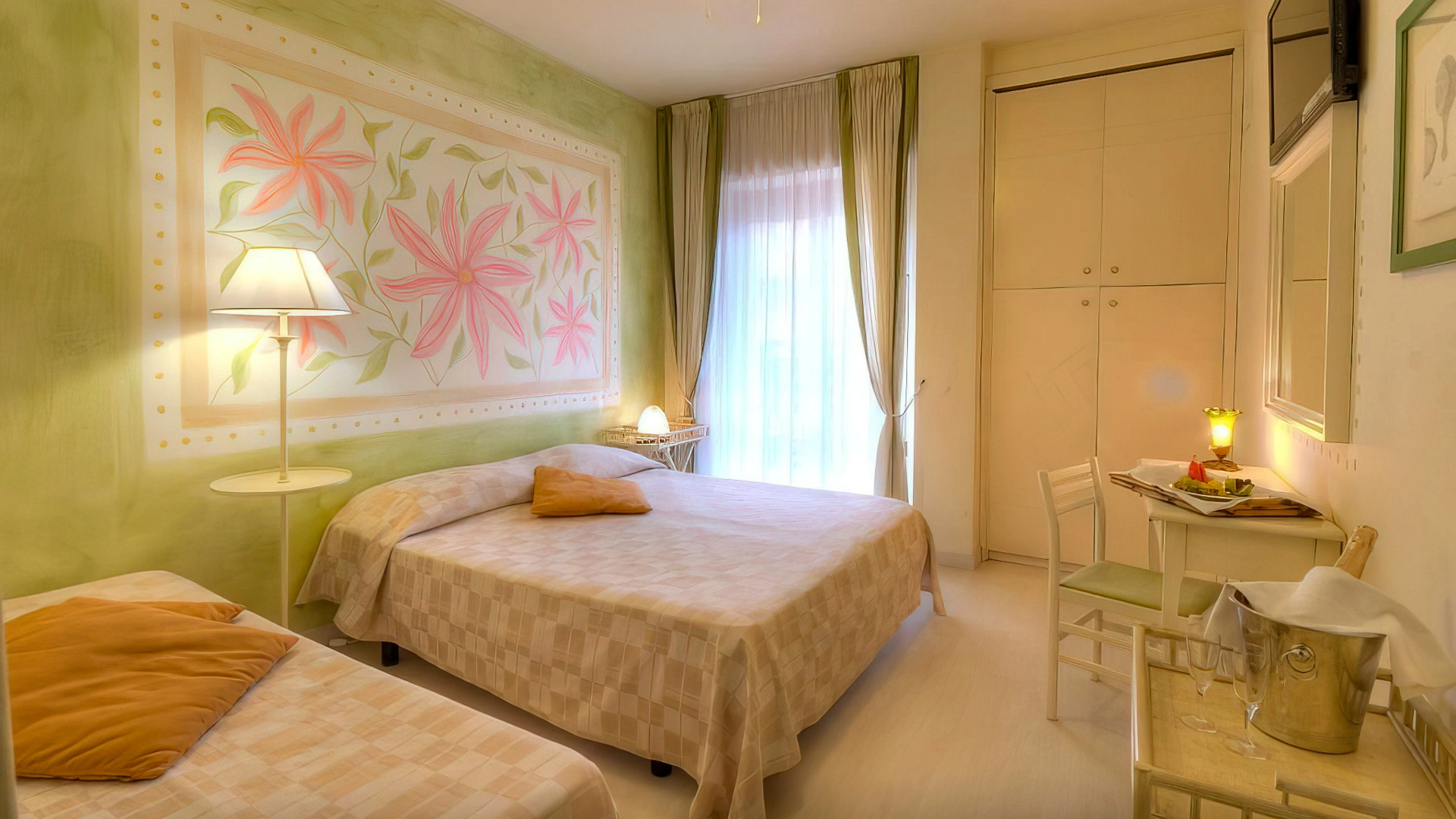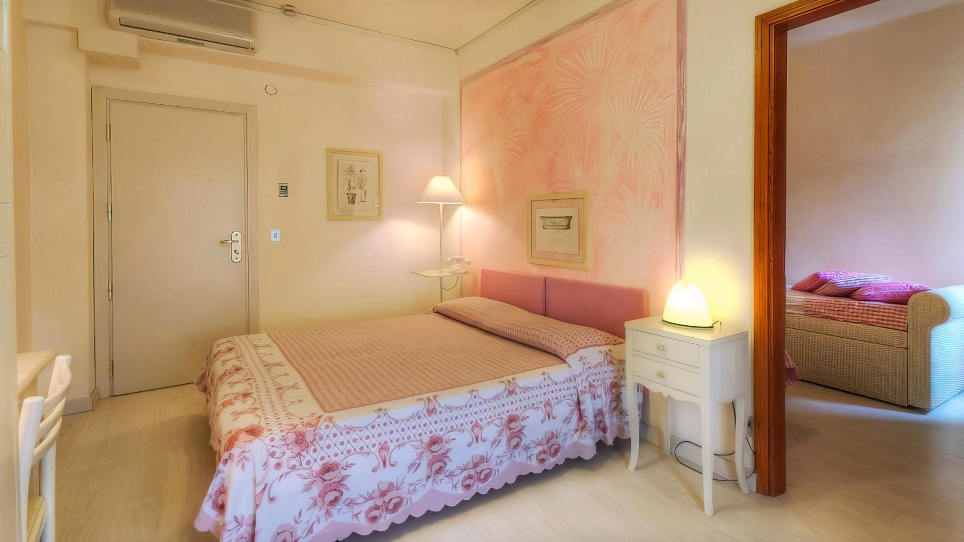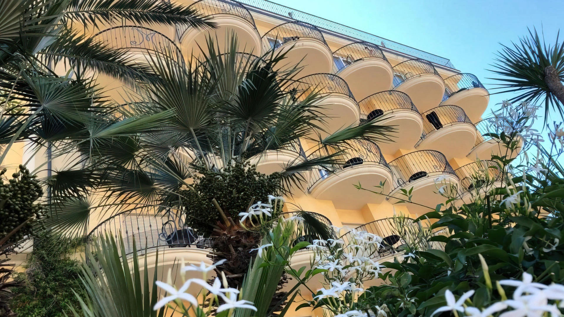 L’hotel offre sistemazioni di vario tipo, tutte dotate di aria condizionata, connessione Wi-Fi, cassaforte, TV da 32”, bagno privato con phon, box doccia e set di cortesia. Alcune camere dispongono di balcone con vista sul lungomare, altre sono arricchite da frigobar e canali Sky, mentre le soluzioni più esclusive includono un terrazzo panoramico e vasca idromassaggio. È inoltre disponibile un’ampia sistemazione composta da tre ambienti separati e due bagni, con terrazza vista mare e Jacuzzi esterna.