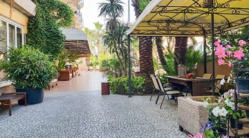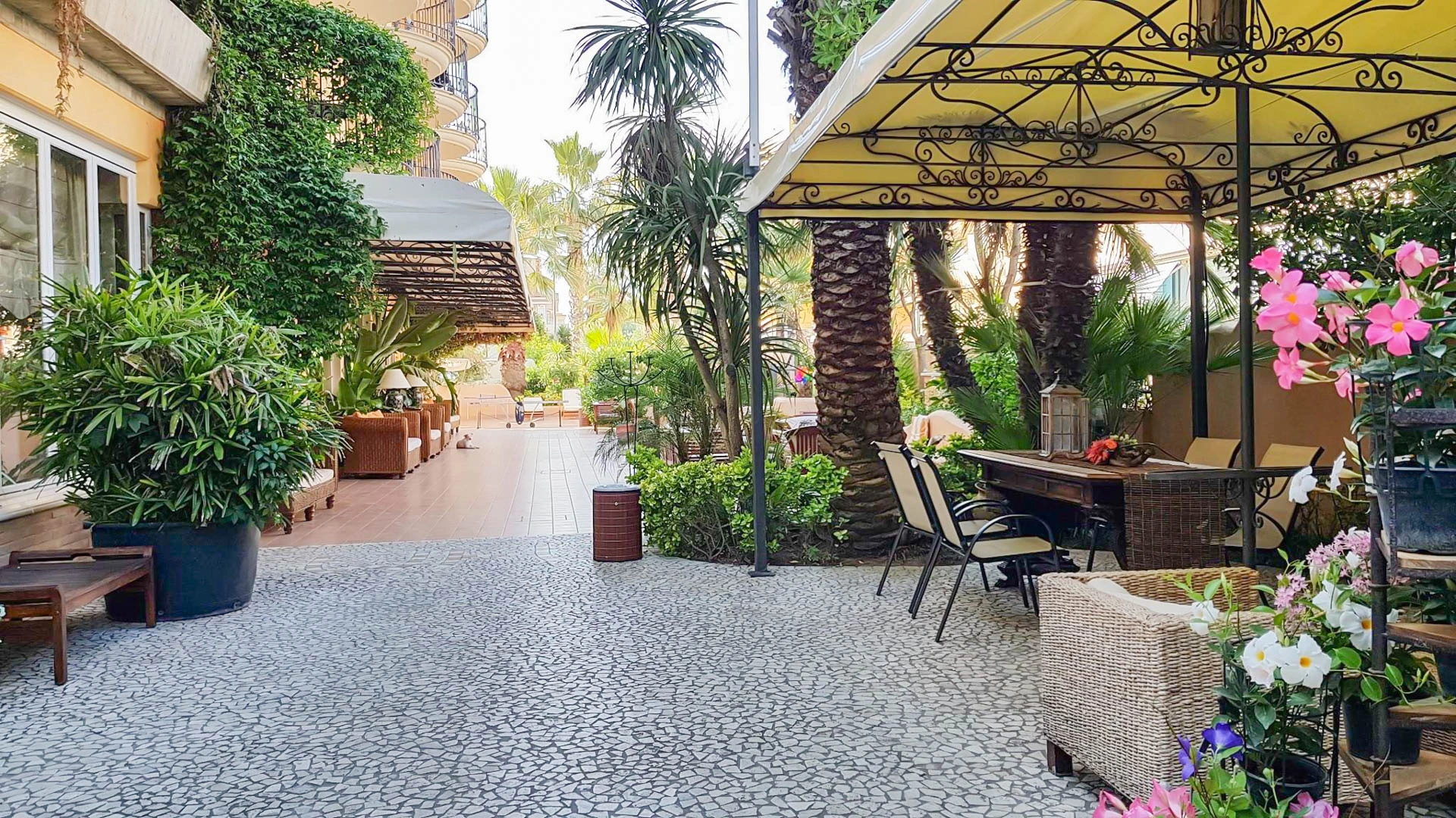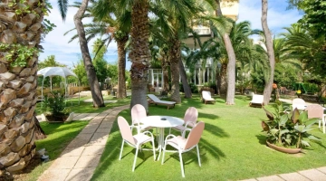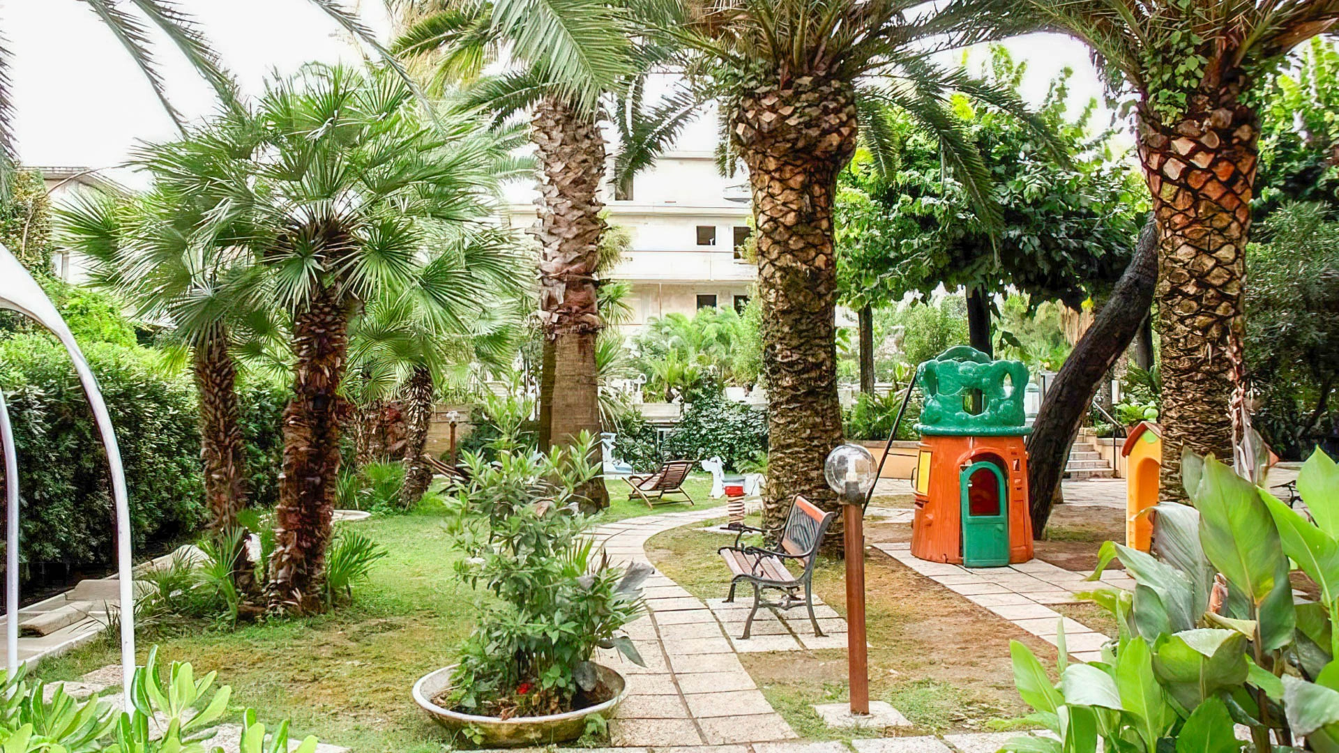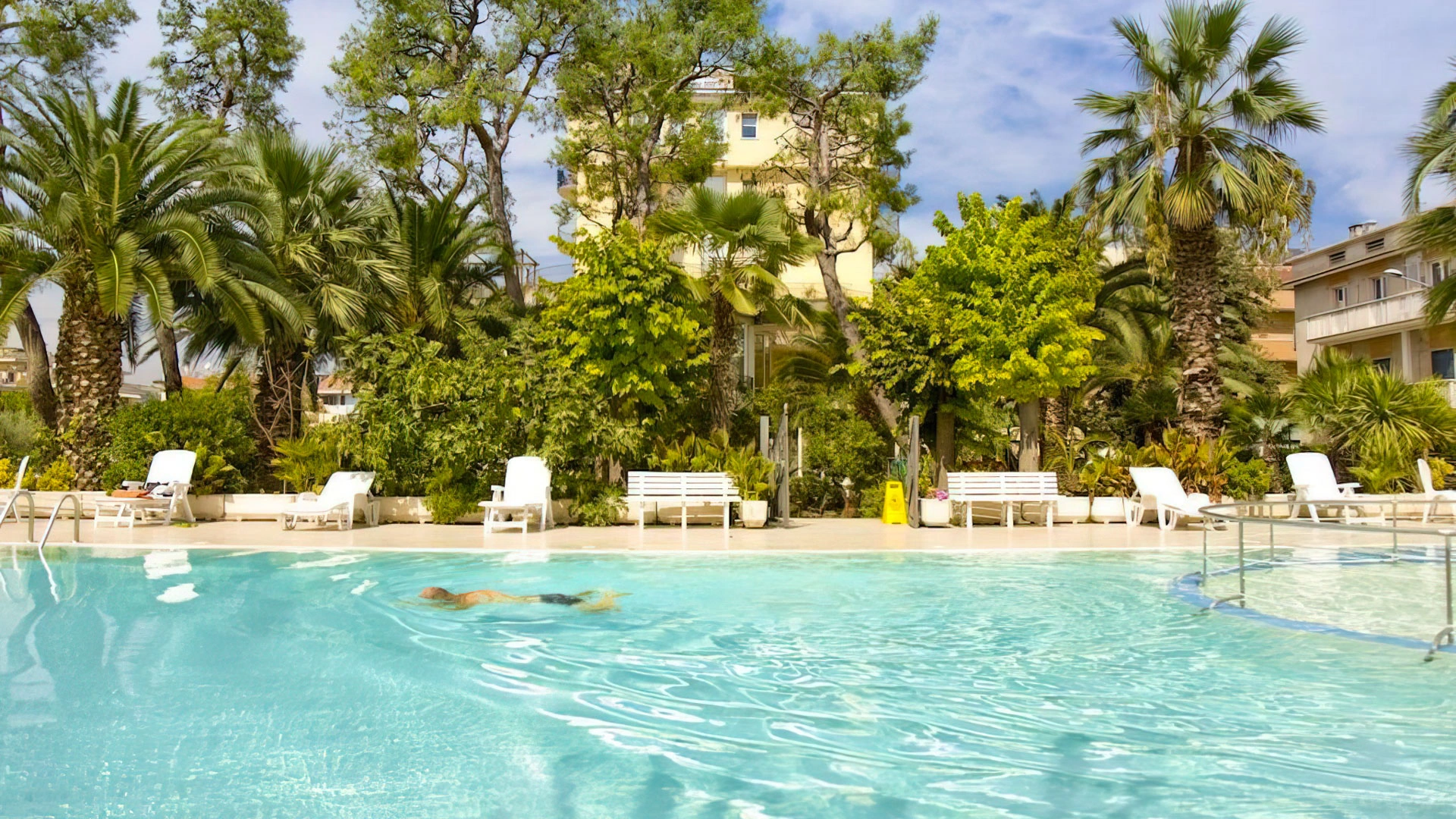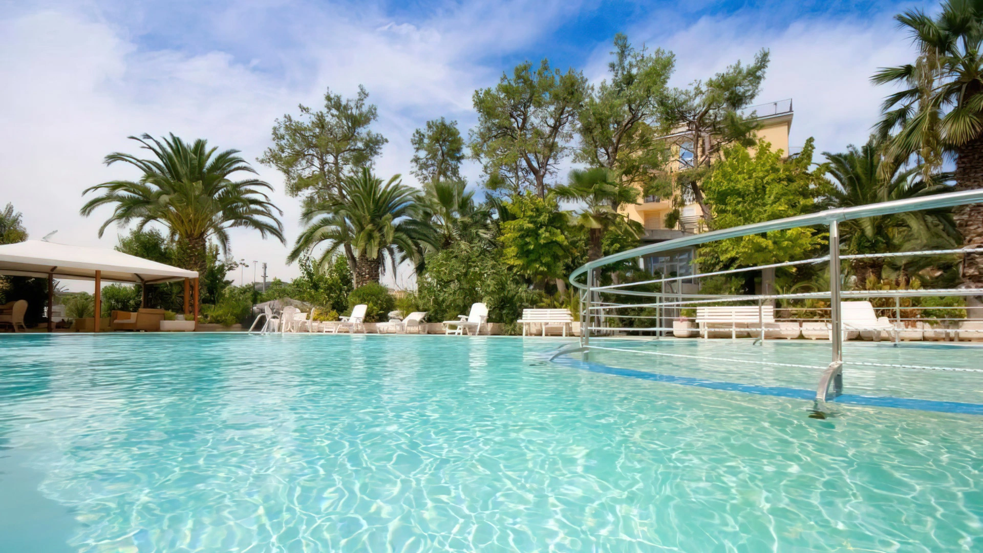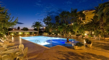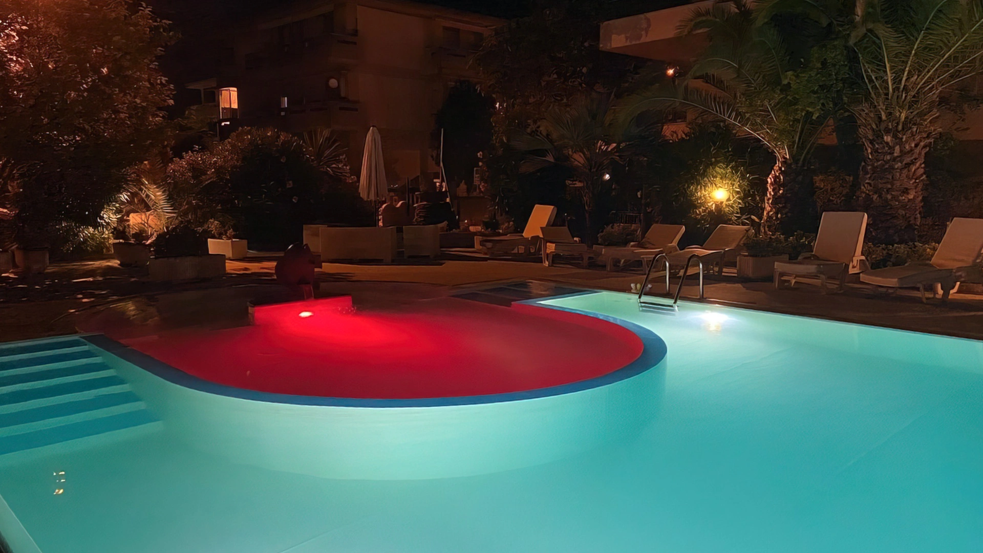 Il giardino ospita una piscina scoperta con idromassaggio, illuminata nelle ore serali. L'area è circondata da ombrelloni e lettini prendisole.