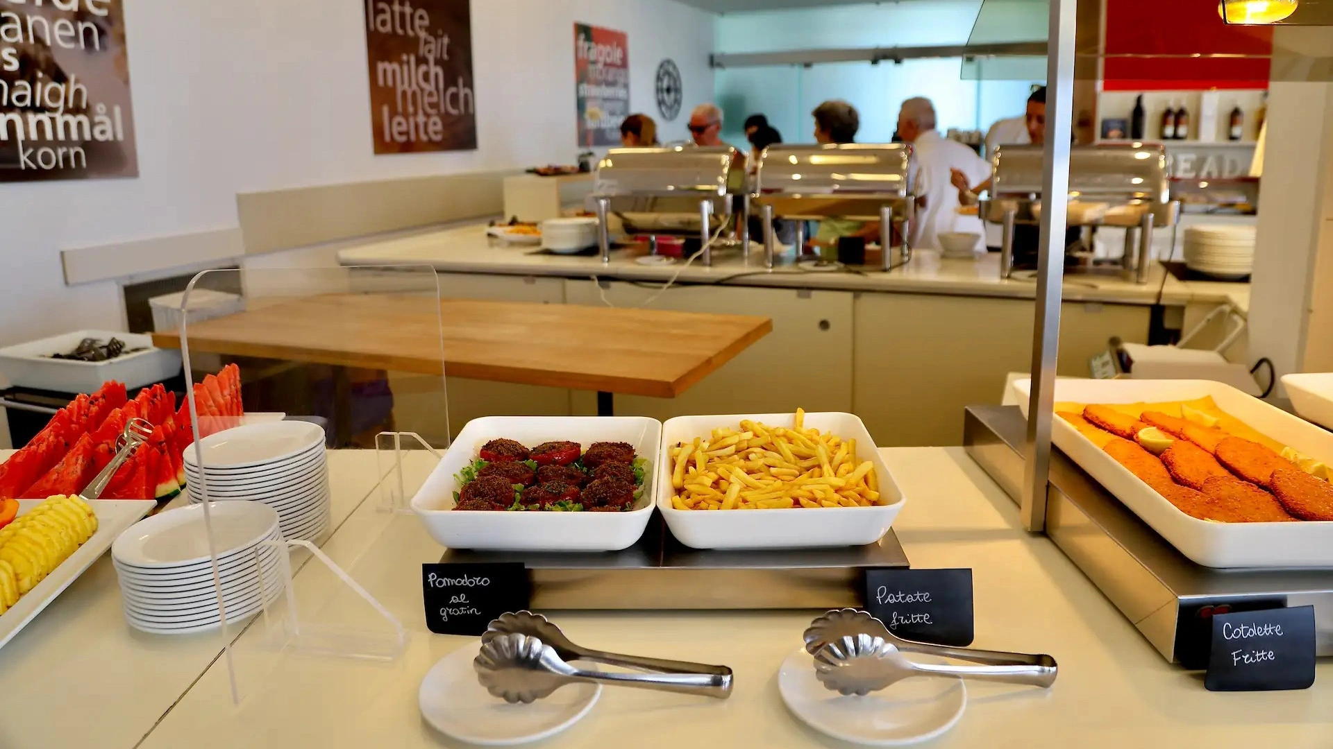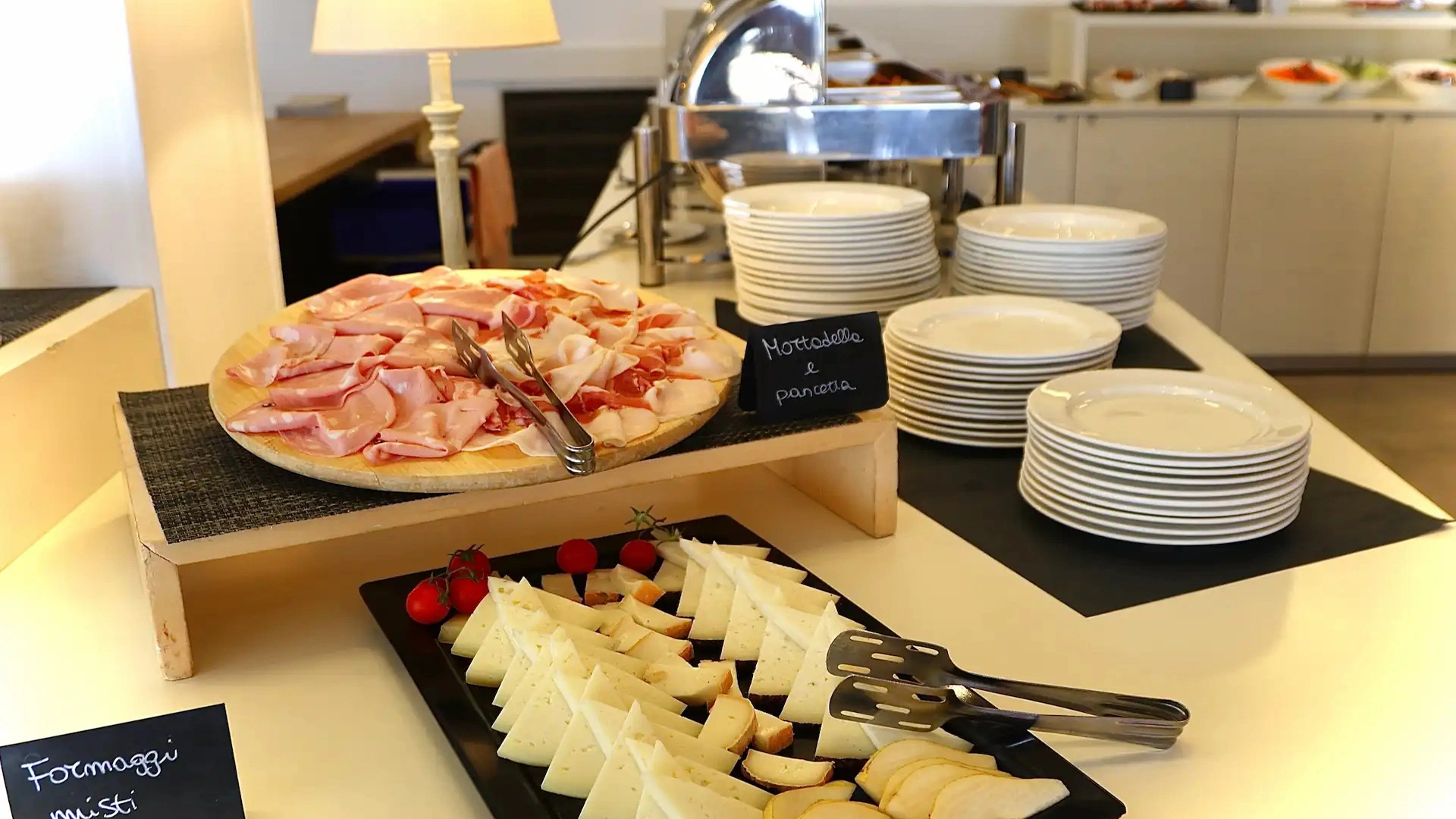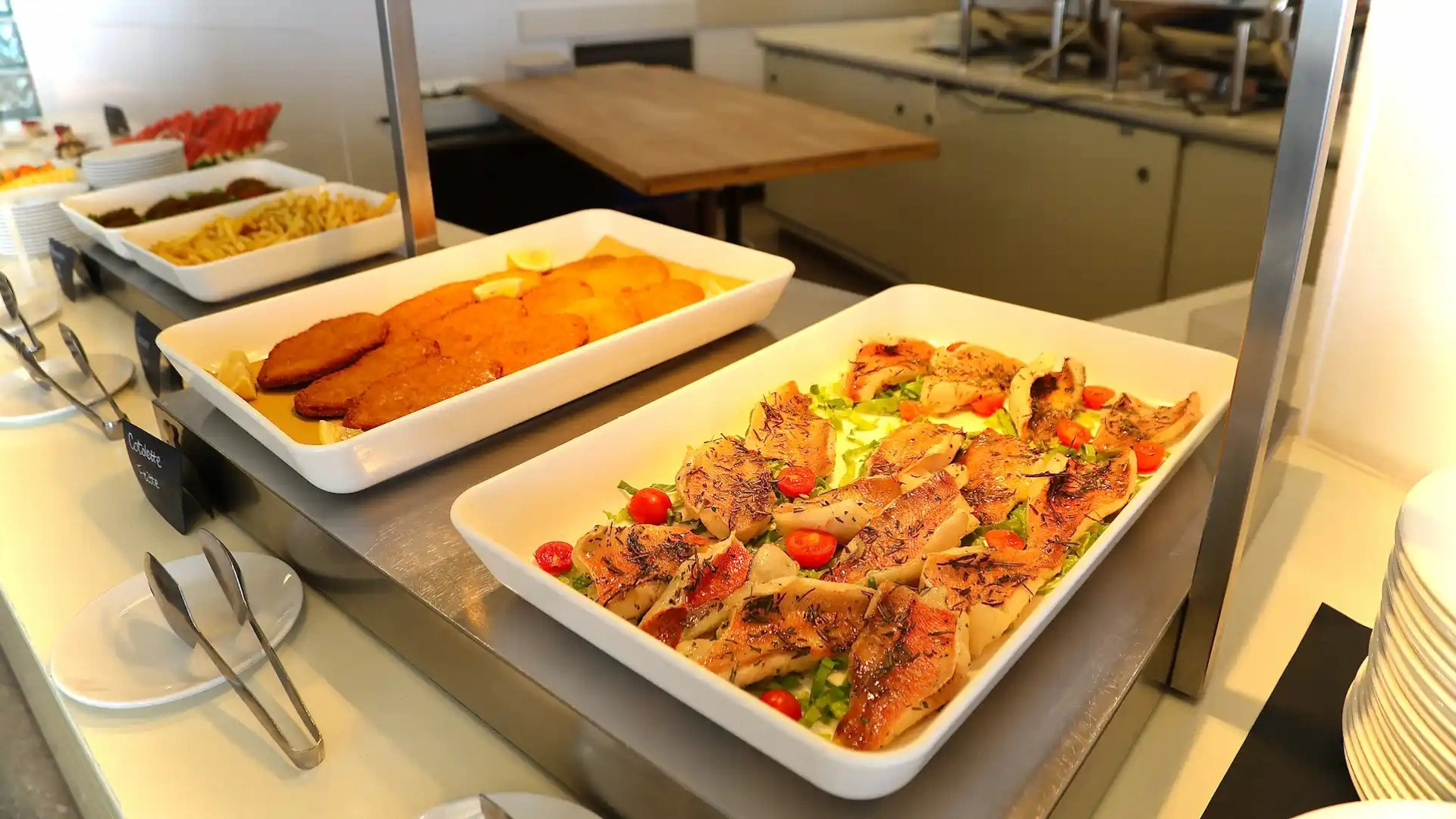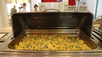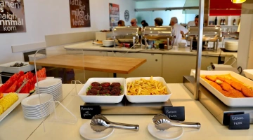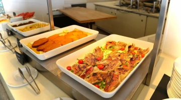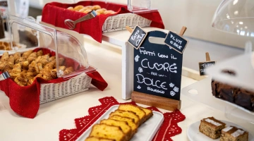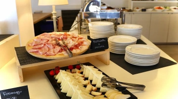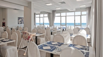La prima colazione a buffet propone prodotti del territorio, dolci fatti in casa, alimenti bio e senza glutine. Accompagnano le pietanze bevande calde e fredde. Il ristorante offre piatti della cucina marchigiana o della tradizione italiana a buffet, con un occhio di riguardo per i celiaci (l’hotel aderisce agli standard "Alimentazione fuori casa" di AIC) e per i bambini. Attiva anche una convenzione con alcuni ristoranti della città per garantire il servizio pasti anche quando il ristorante interno è chiuso.
