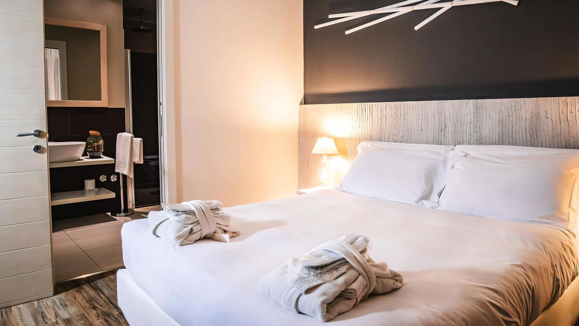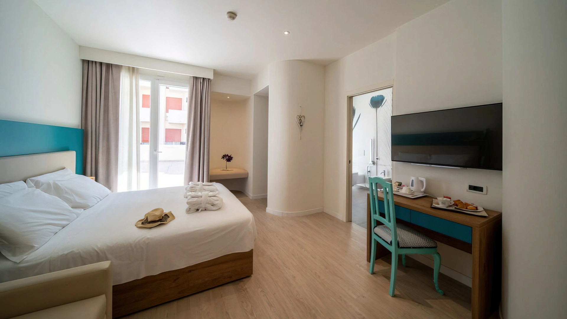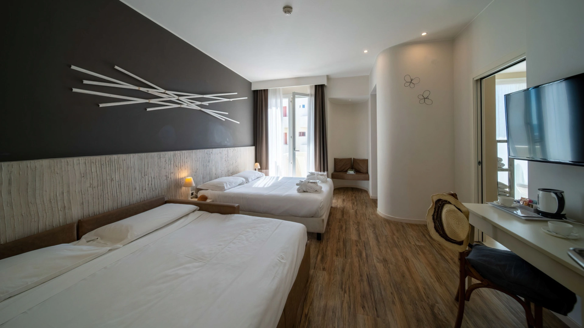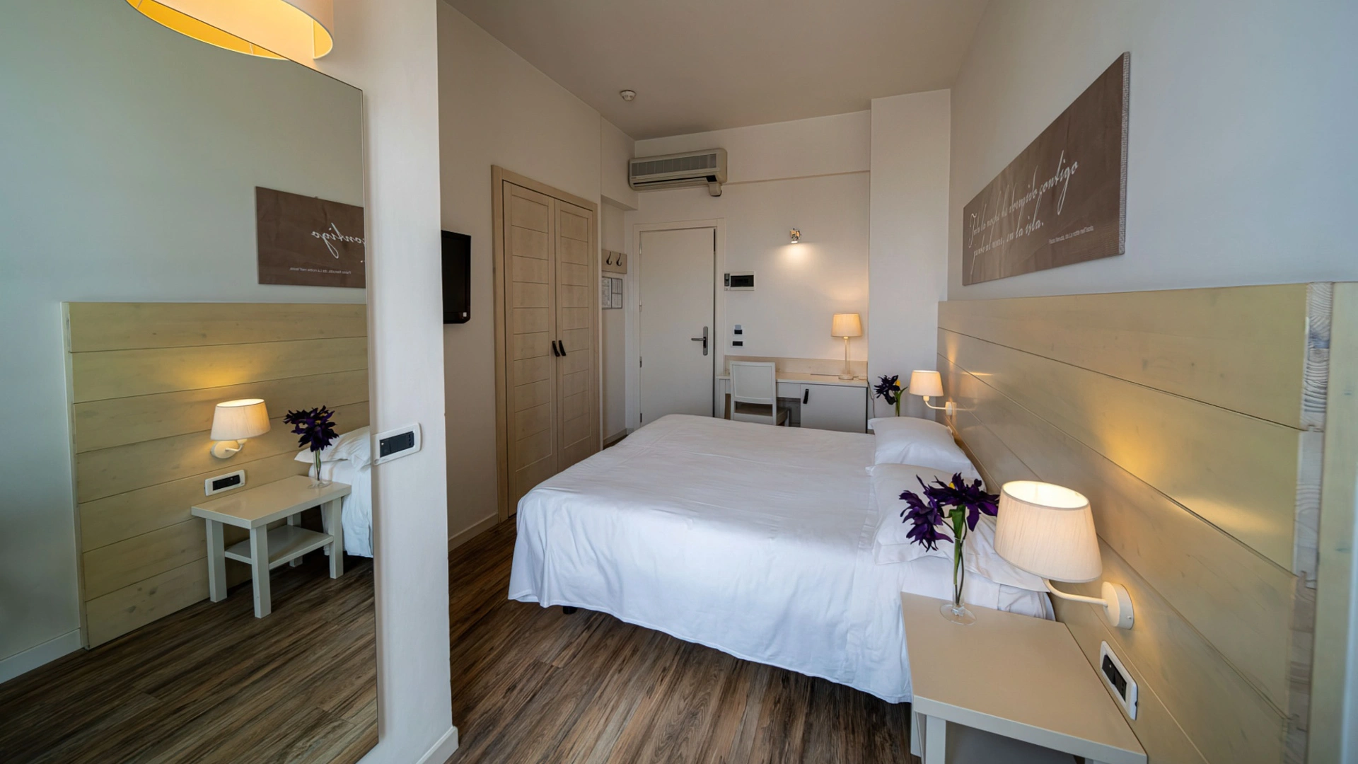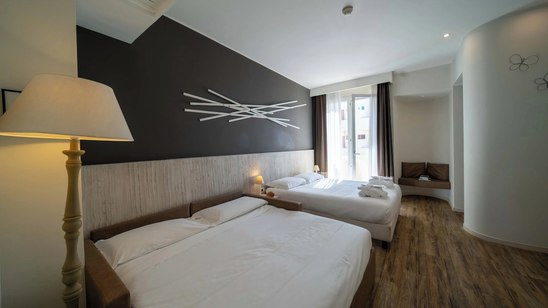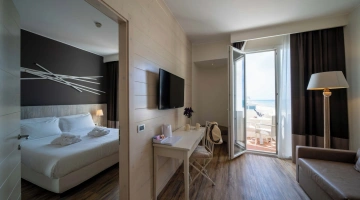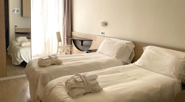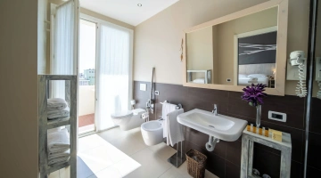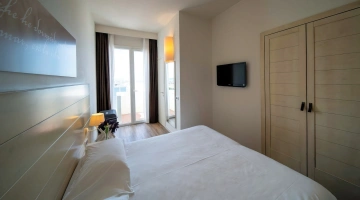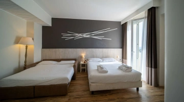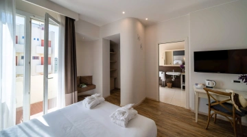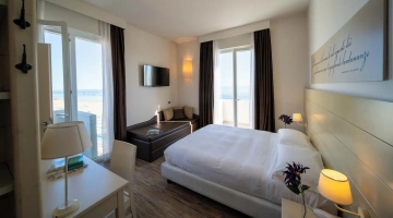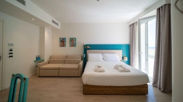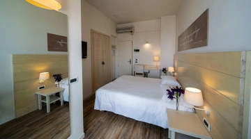 Le camere, dal design contemporaneo, sono ionizzate con specifico macchinario a intervalli regolari, per garantire protezione da insetti, germi e acari. Tutte le stanze godono di balcone, aria condizionata, minibar, cassaforte, Sky TV, connessione Wi-Fi, bagno privato con doccia, phon e kit di cortesia.