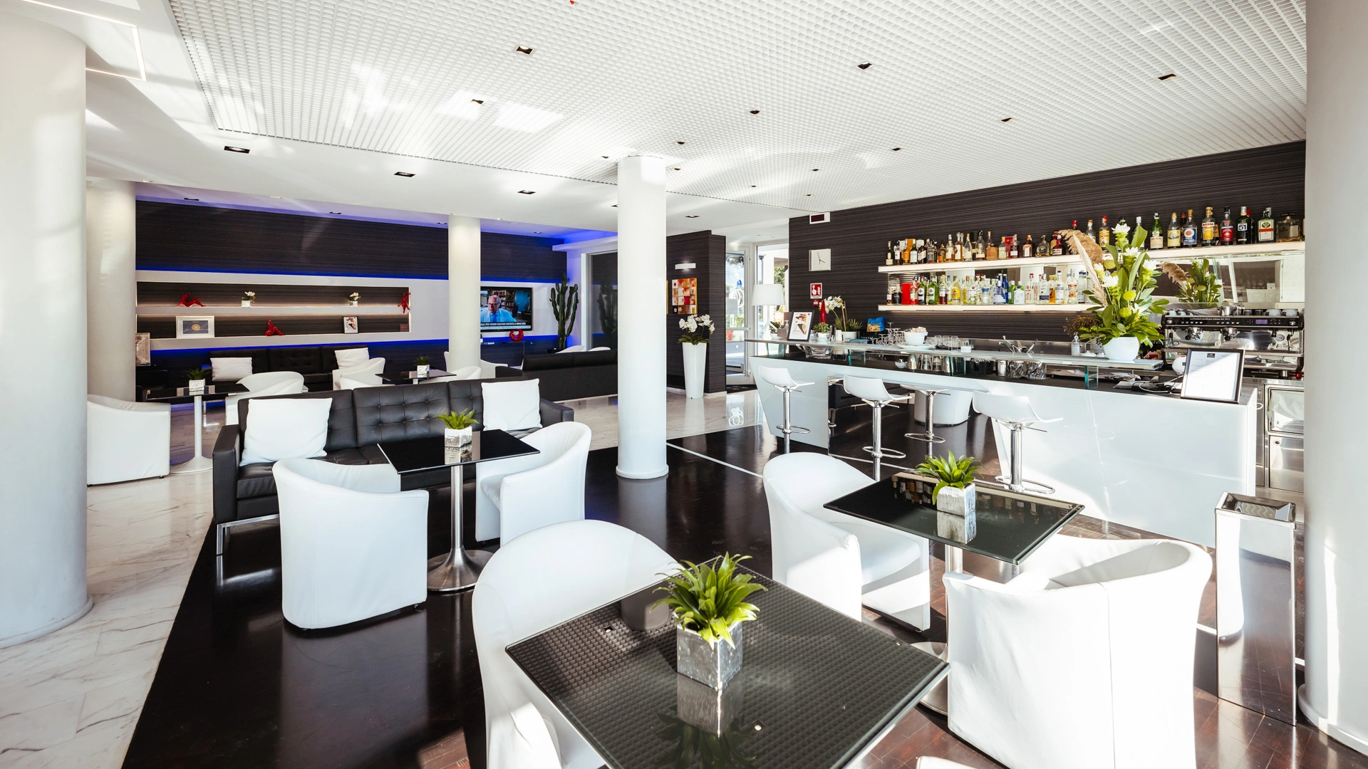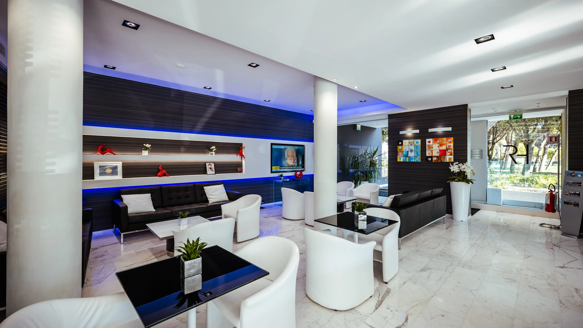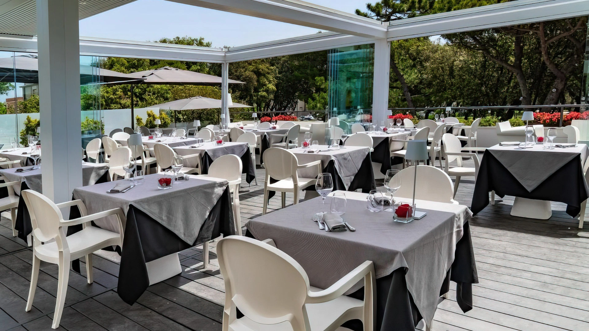 La struttura dispone di parcheggio videosorvegliato con stazione di ricarica per veicoli elettrici. Tra le aree comuni vi sono il giardino privato attrezzato con tavolini e sedie che affaccia sulla pineta e una spaziosa hall con salottini. Sono inoltre presenti due terrazze: la Terrazza Morandi al primo piano con vista sulla pineta e il Rooftop al quinto piano con cocktail bar, solarium, Jacuzzi e piscina panoramica.
