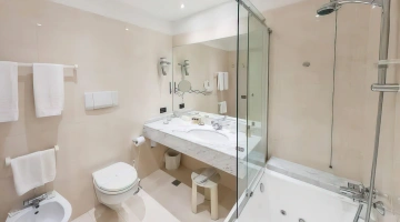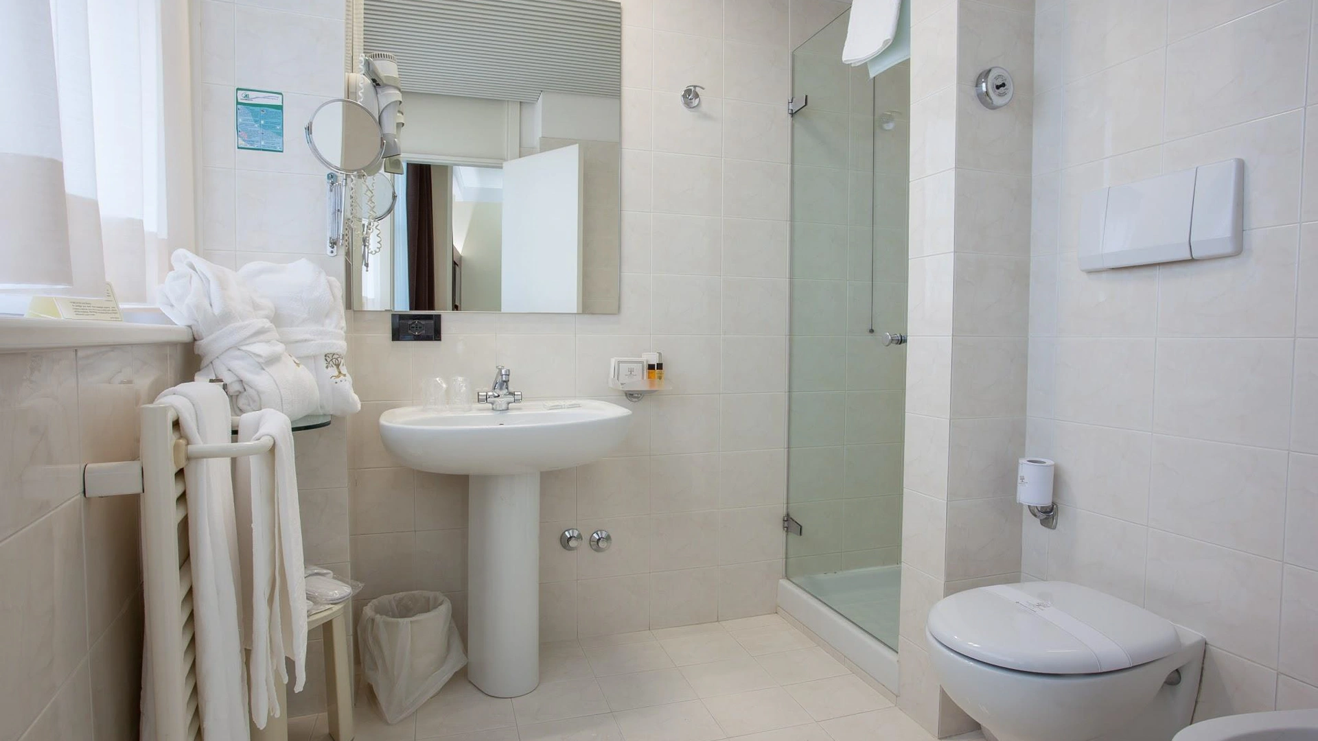 Disabili: ingresso con rampa inclinata, ascensore a norma per disabili, camera con spazio di manovra per sedia a rotelle e doccia accessibile con sedia richiesta.
