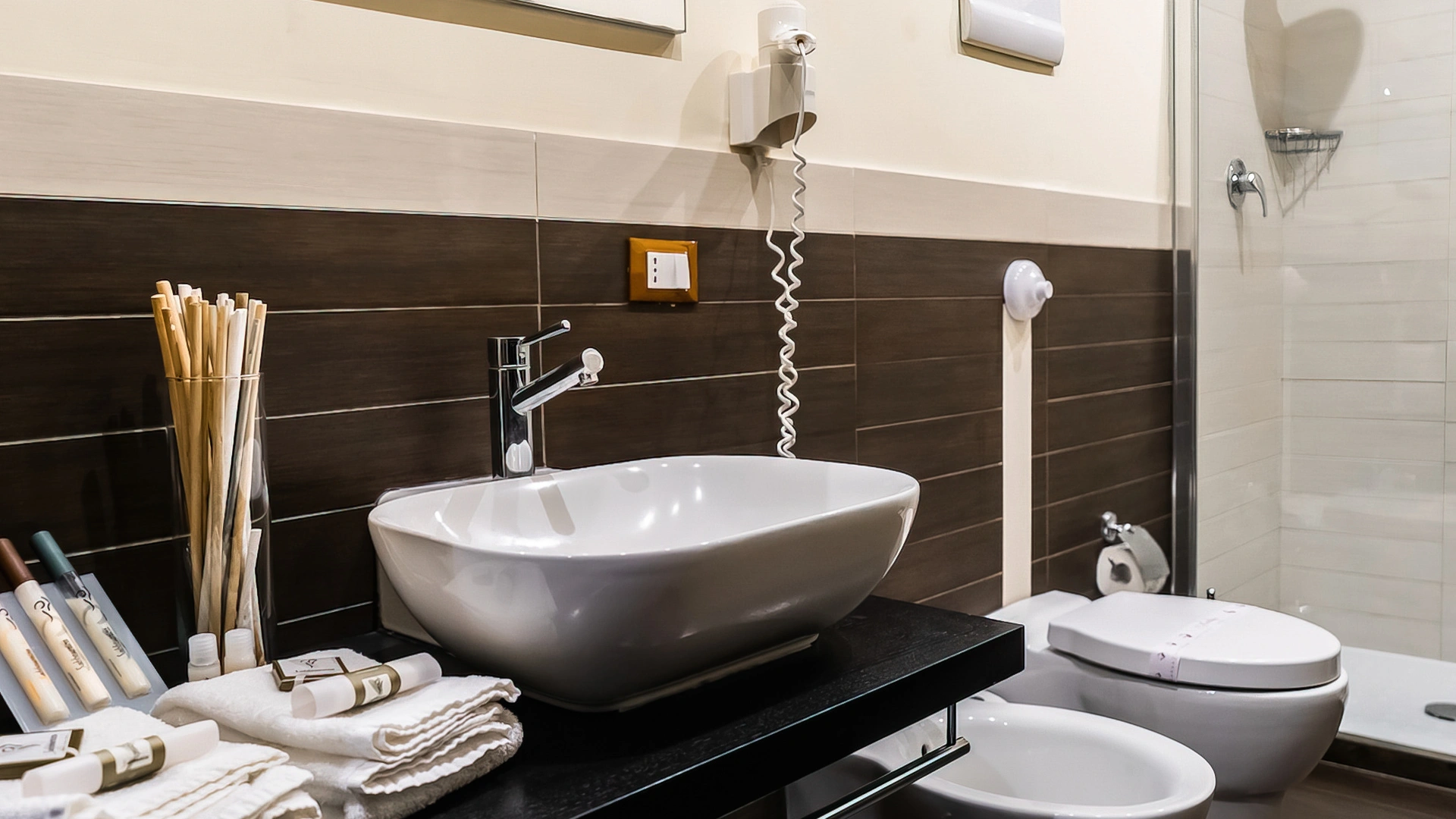 - Set di cortesia bagno: Bagnoschiuma, Saponetta, Shampoo;