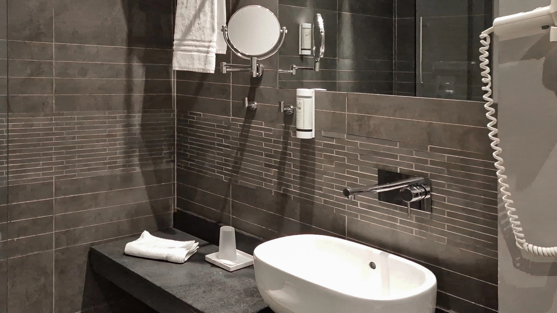 - Set di cortesia bagno: Shampoo, Spazzolino, Pantofole, Lucidascarpe, Sapone mani, Cuffia da doccia, Crema, Bagnoschiuma, Accappatoio, Dentifricio, Rasoio;