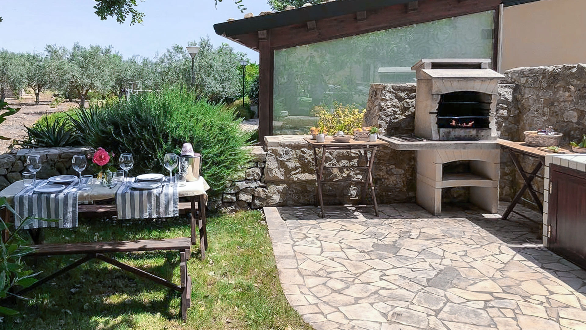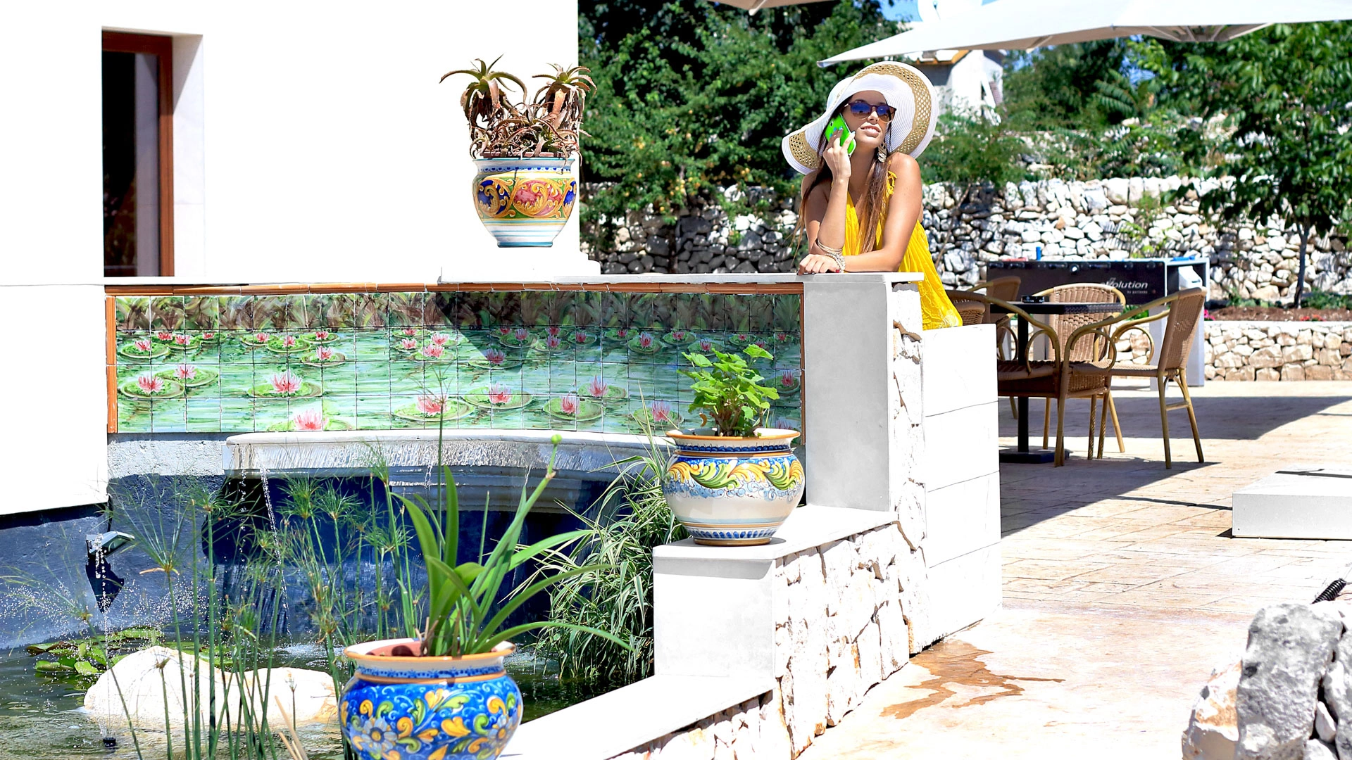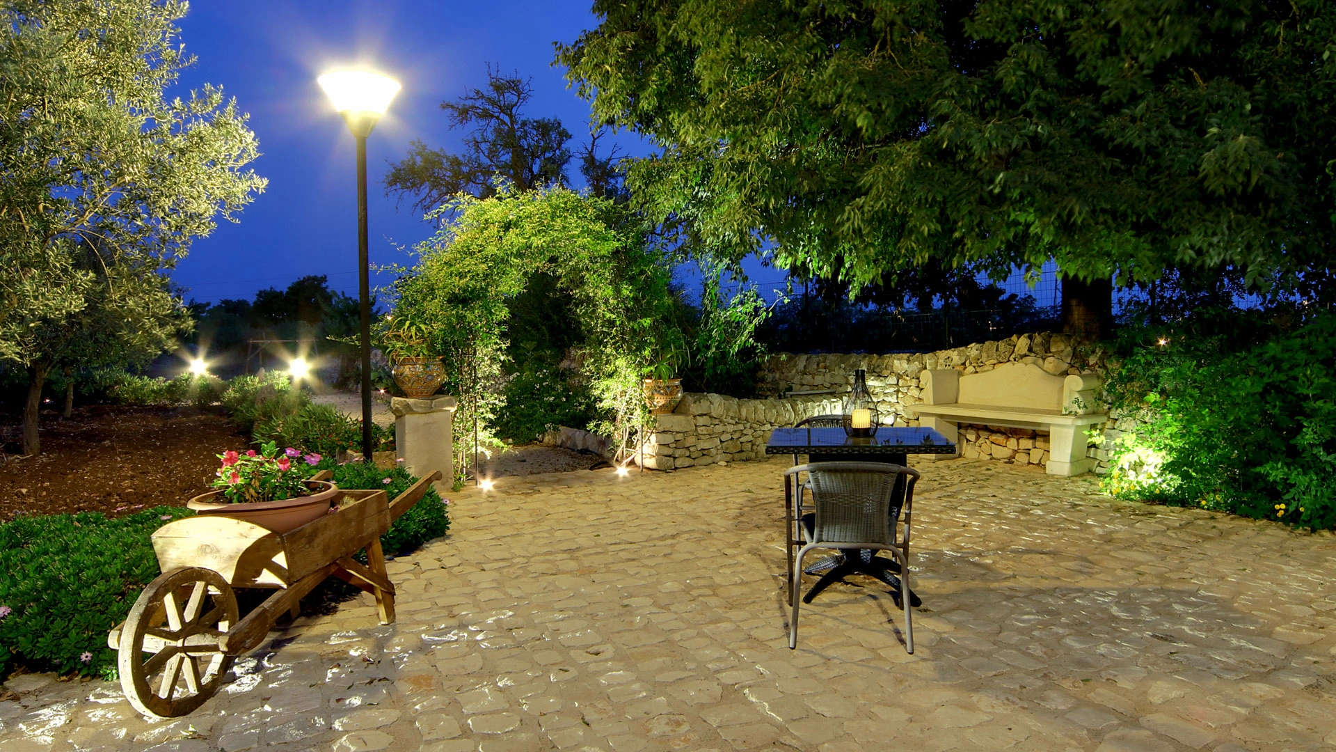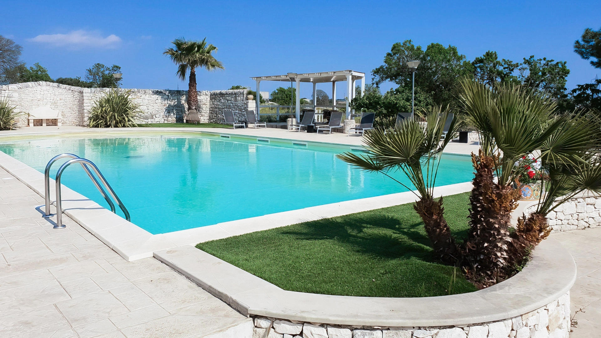 La piscina esterna è immersa nel verde del giardino della masseria e include attrezzatura per acquafitness e una zona con acqua bassa adatta anche ai bambini. L'area circostante è adibita a solarium con lettini e ombrelloni.