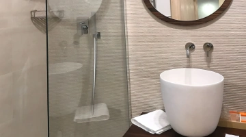 - Set di cortesia bagno: Bagnoschiuma, Cotton fioc, Sapone mani, Shampoo, Cuffia da doccia;