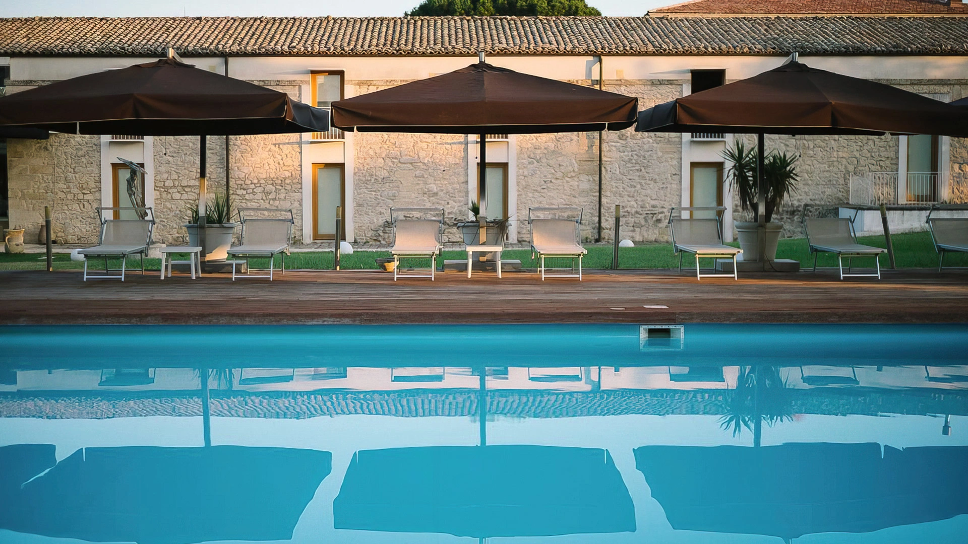 Il giardino della struttura ospita una piscina scoperta circondata da ombrelloni e lettini, e servita da un bar a bordo vasca.