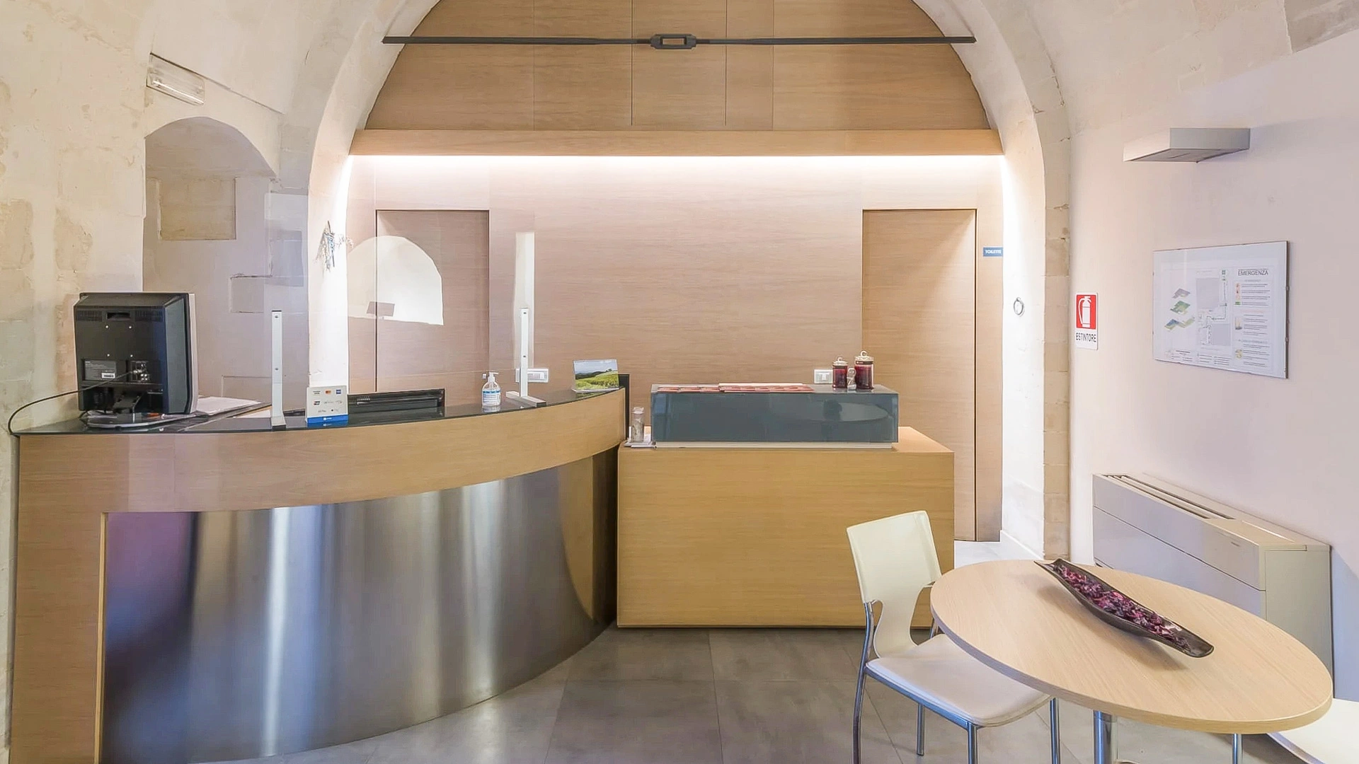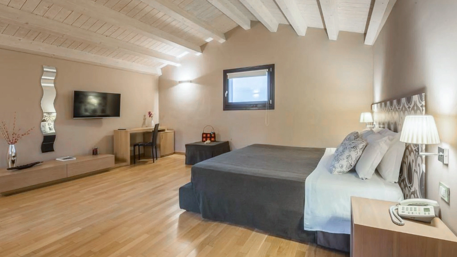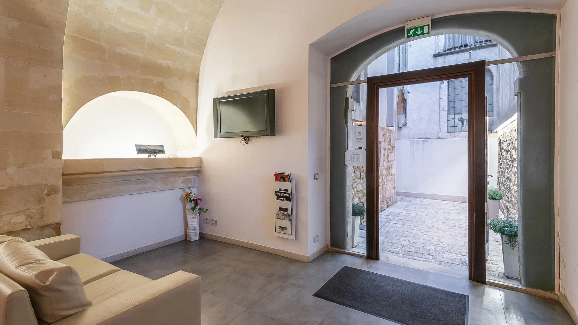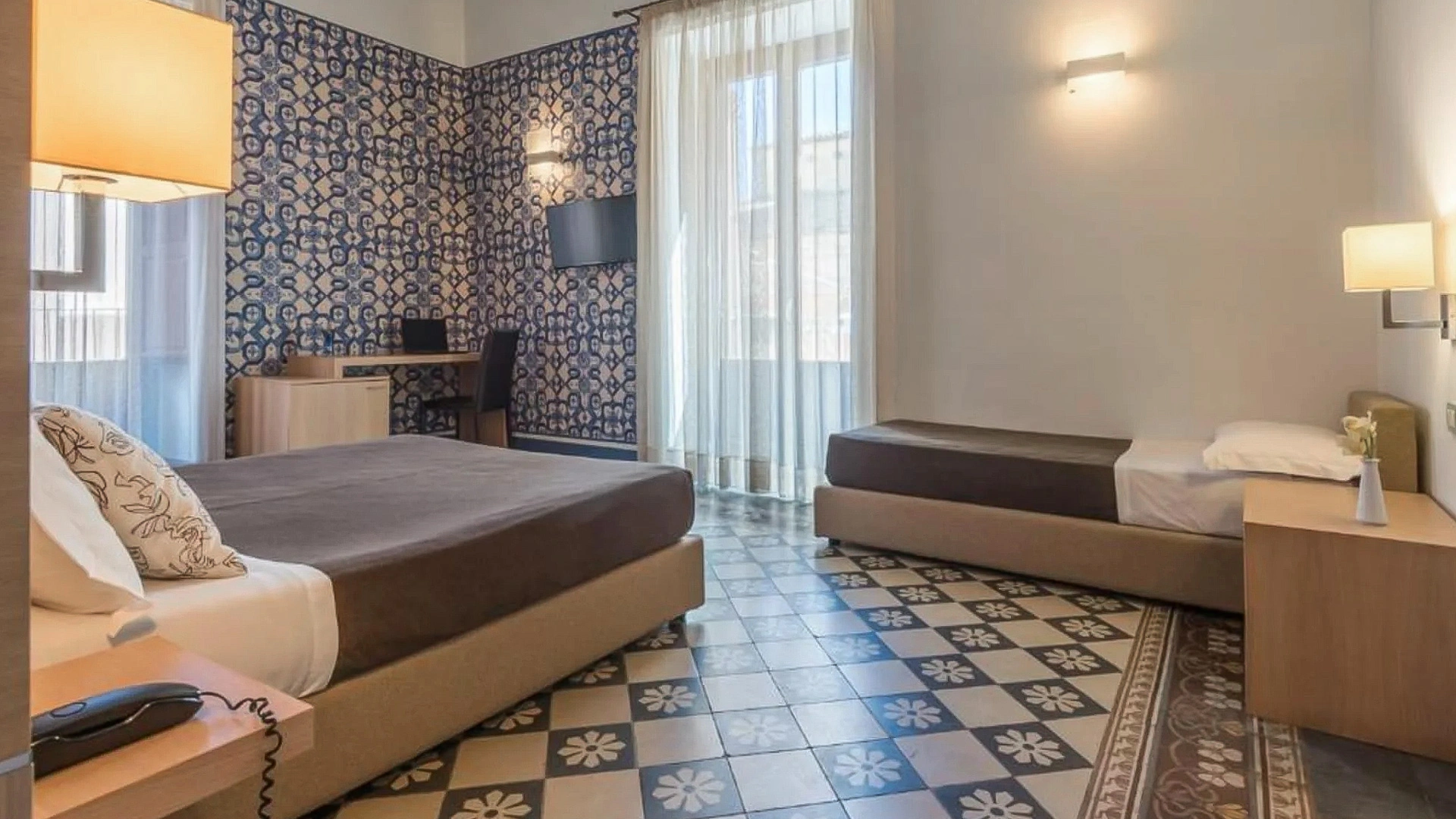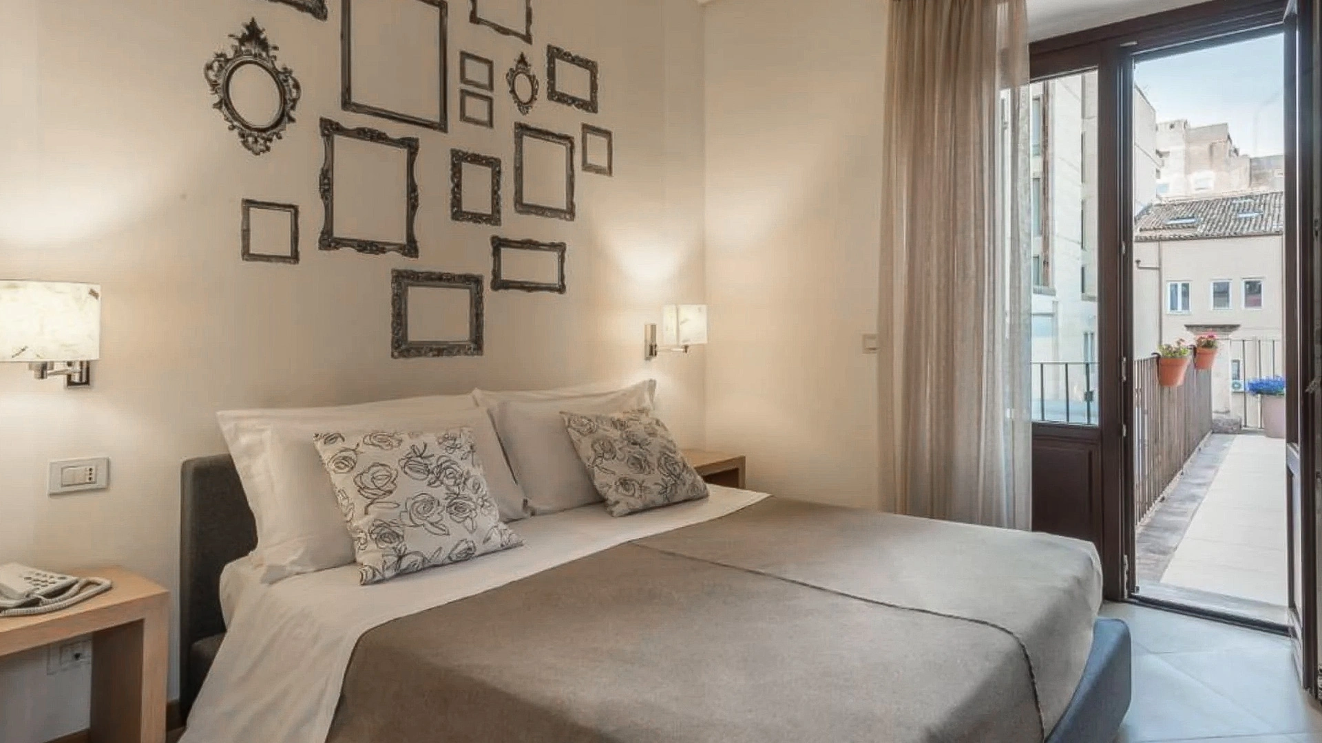 Le camere, arredate in stile barocco, sono dotate di balcone con vista sul cortile interno o sulla città, aria condizionata, TV satellitare, telefono, connessione Wi-Fi, minifrigo, servizi privati con box doccia, phon e set cortesia. Sono presenti camere per famiglie e junior suite con ingresso indipendente.